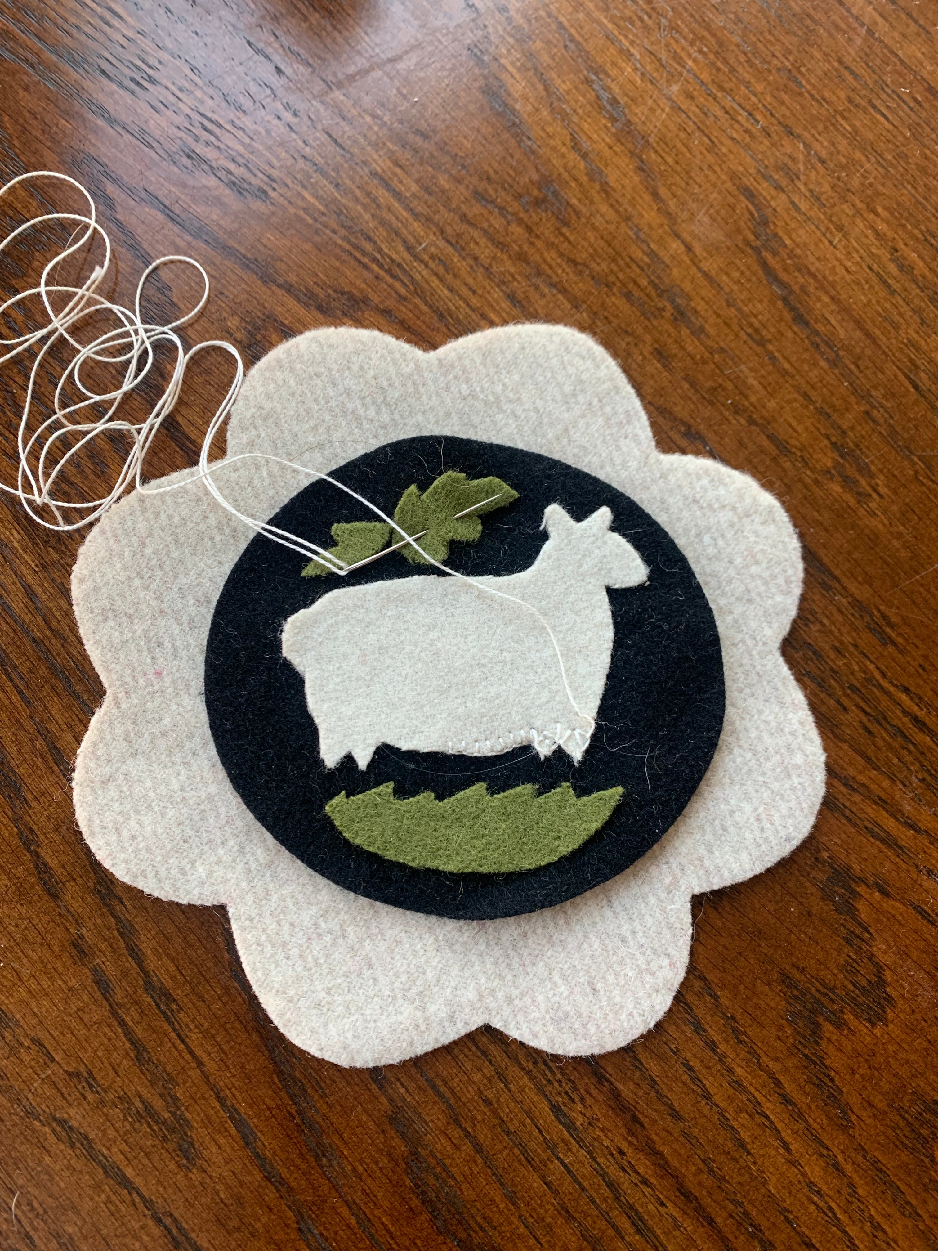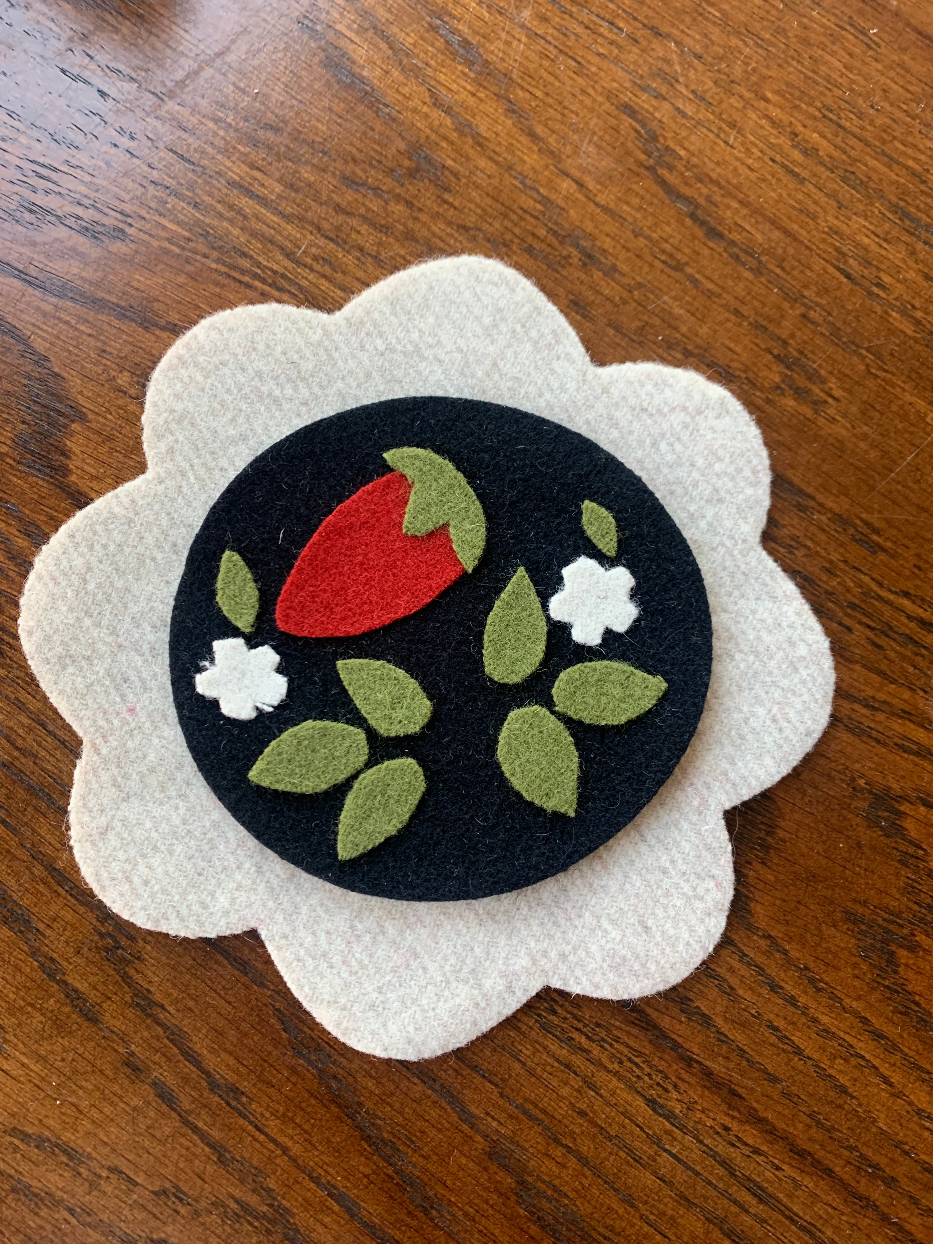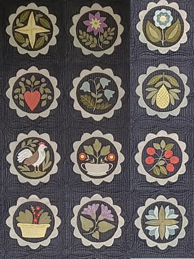 We got to see many of these all stitched by Julie F in the shop one weekend and as alway her work is beautiful! Julie used to stitch samples for us in a Maine and she teaches appliqué up there still. We hope to have her here for a workshop some day! But these 30 designs inspired by antique butter molds are so cute! You can do a Quilt size 54" x 63" but we love them as separate small works of stitching. She uses as coasters or on top of small boxes and jars. Watch for Wool bundles for these and pre cut 4 inch circles, 6 inch scalloped circles, thread packs and more coming soon! I can’t wait to use the little designs for mini punch and think part punched and part appliquéd will be really cute!