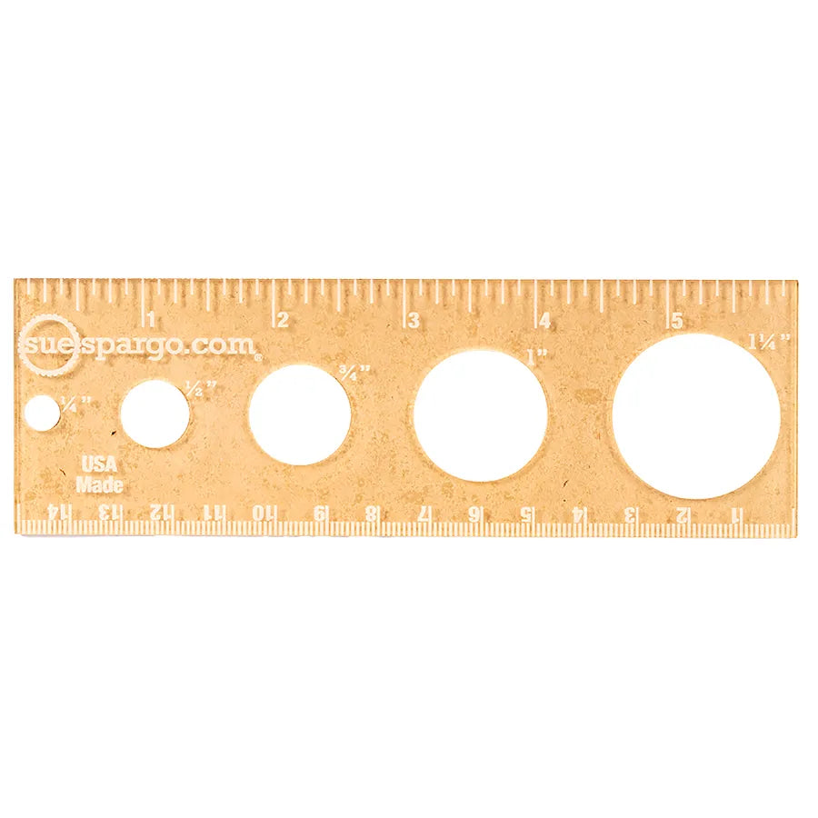 Designed in Sue Spargo’s studio, this compact, multifunctional tool is an irreplaceable staple in any makers notions stash! Small in stature, it packs a punch, with convenient inch and centimeter markings plus circle templates for the most popular sizes! Conveniently sized for quick and easy marking on small scale designs. 6 inch/16 cm ruler with 1/4", 1/2", 3/4", 1", 1-1/4" circle templates.