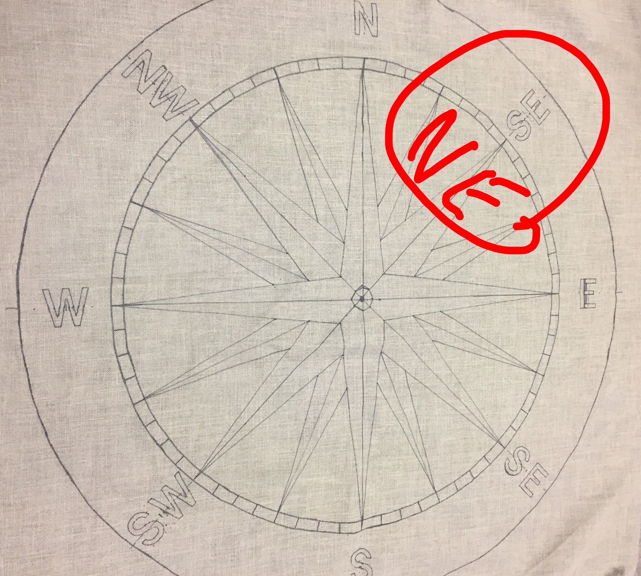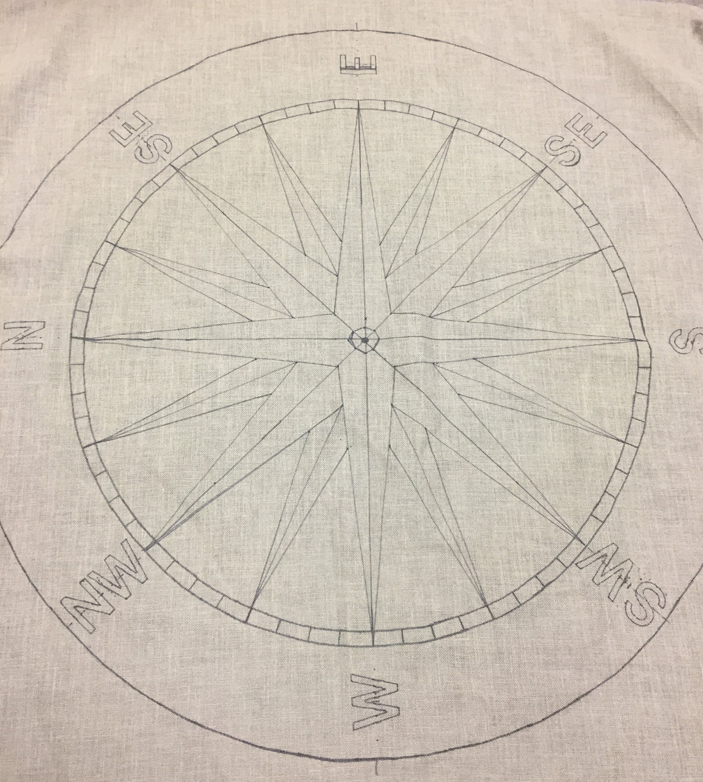 Mom designed a simple compass rose that is beautiful in its simplicity. Just the circle, the stars, the bands and the directional letters.