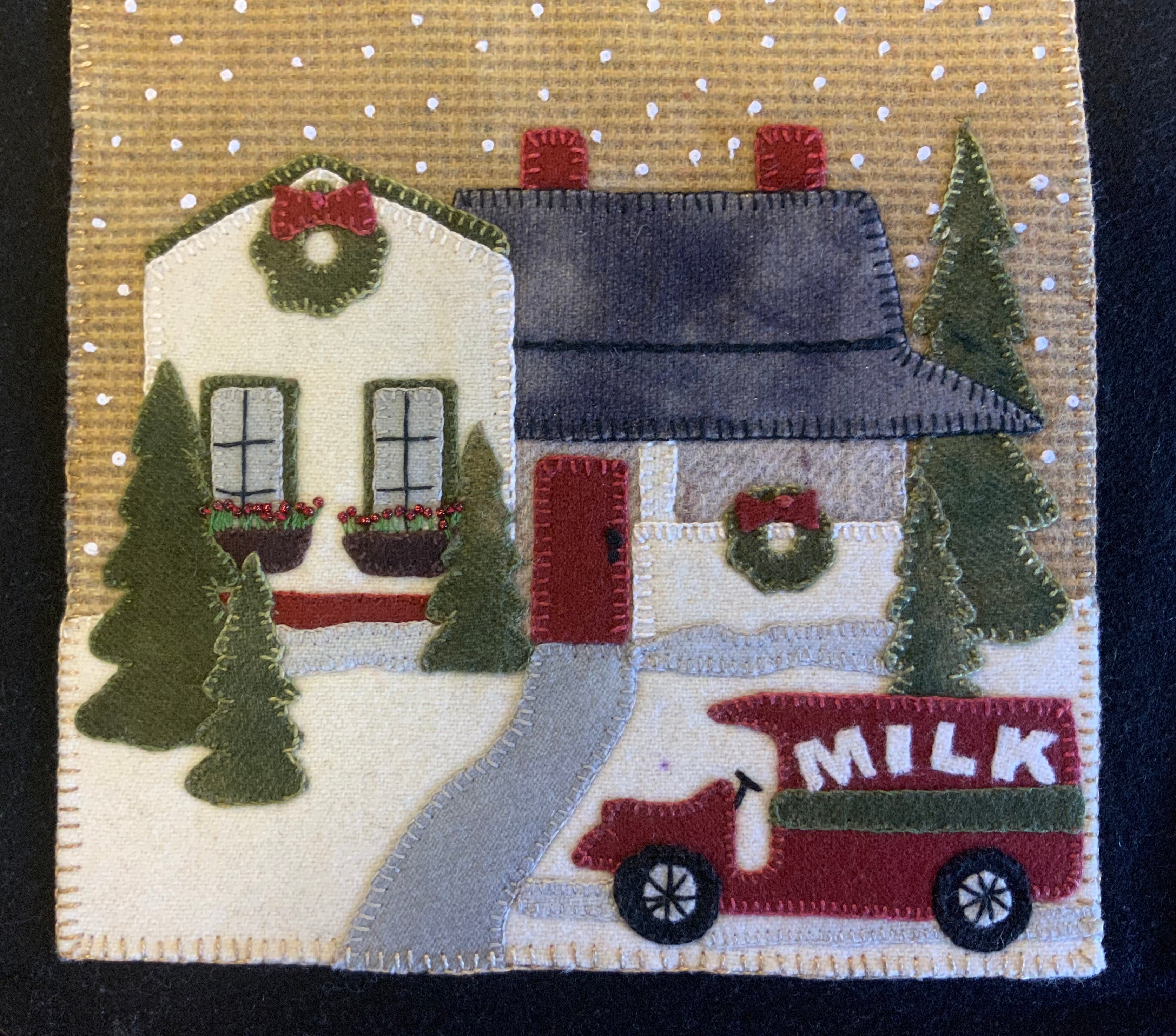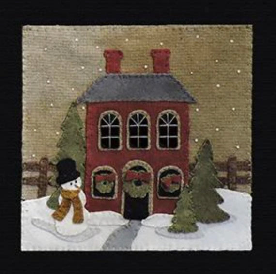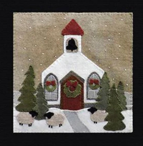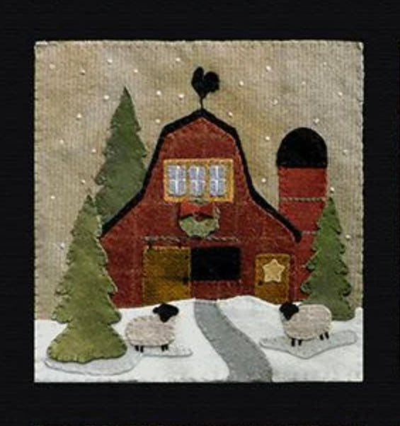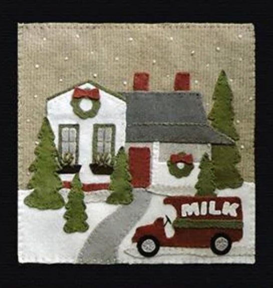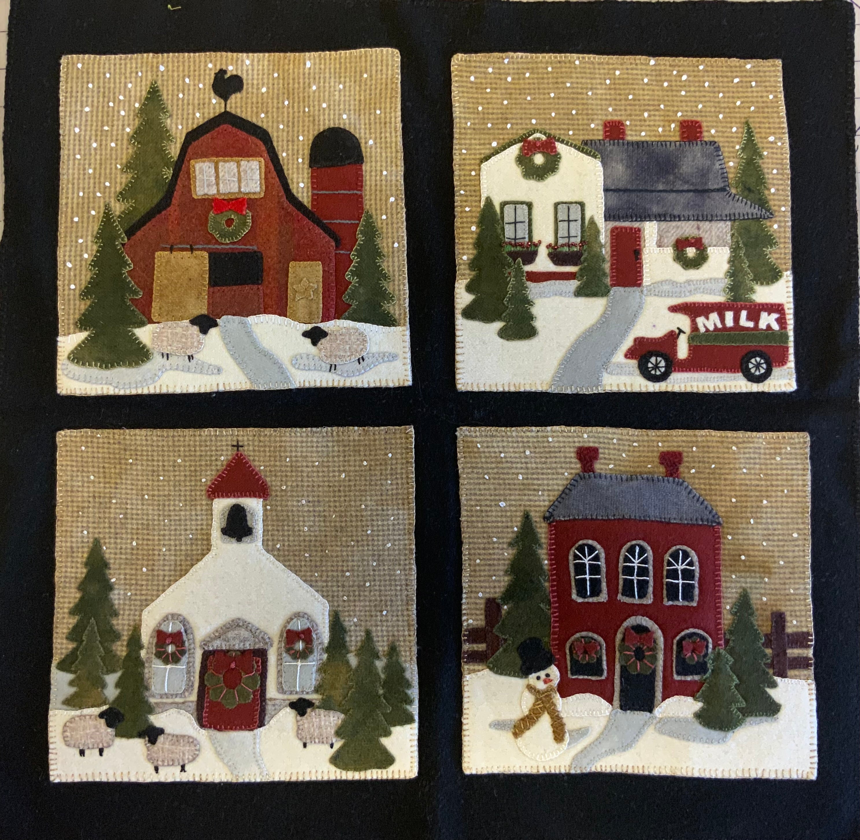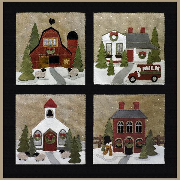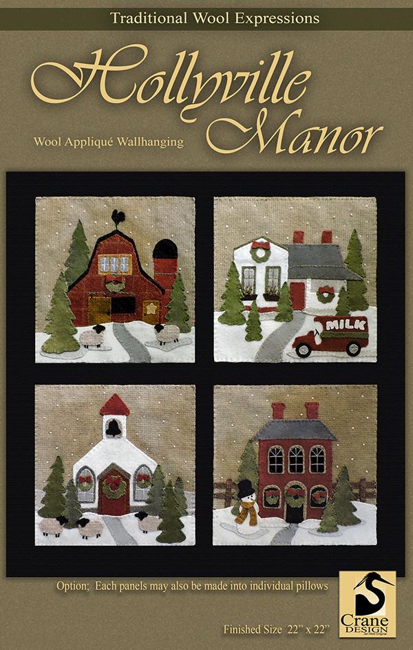 Crane Designs newest pattern is a walk down memory lane of a 'ole country village, on a frosty day. It is designed with four individual panels featuring a old barn with a small flock of sheep, farmhouse with a milk delivery truck, a wonderful old country church with sheep enjoying the peace of the country side. The last panel is the old Manor house with even a fun and sassy snowman. Just a fun piece to stitched that may be displayed all winter long. This fun applique piece may be used as a wall-hanging or even as individual pillows. The piece includes some easy embroidery stitches to make the piece just pop..we hope you enjoy. This piece was created with rich hand dyed and textured wools that radiates a warm and rich feeling. The thread packet includes 8 balls of Valdani #8 pearl cotton in the colors needed