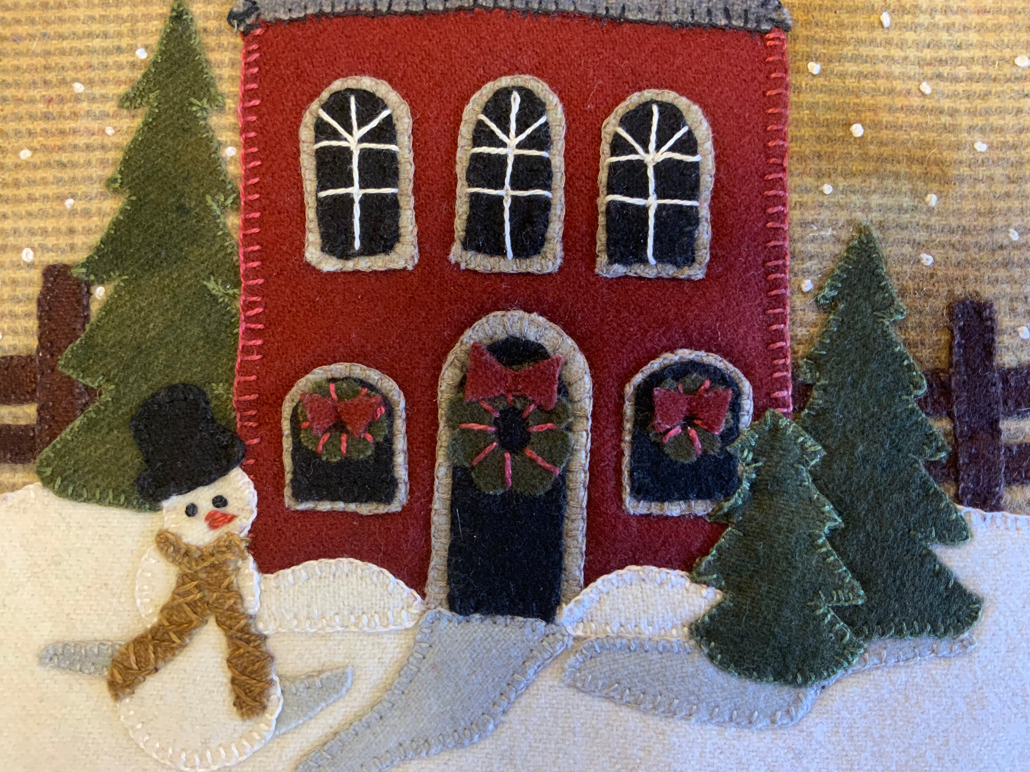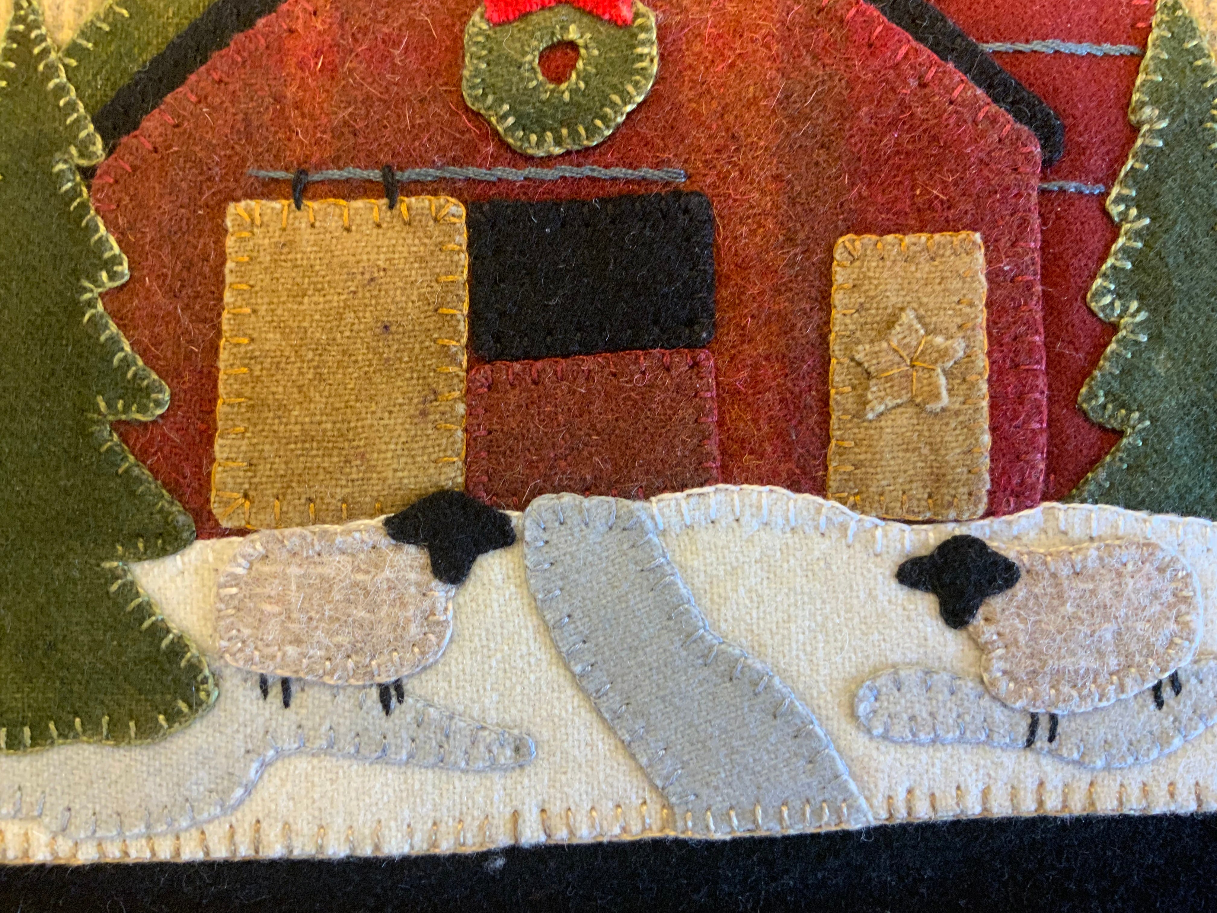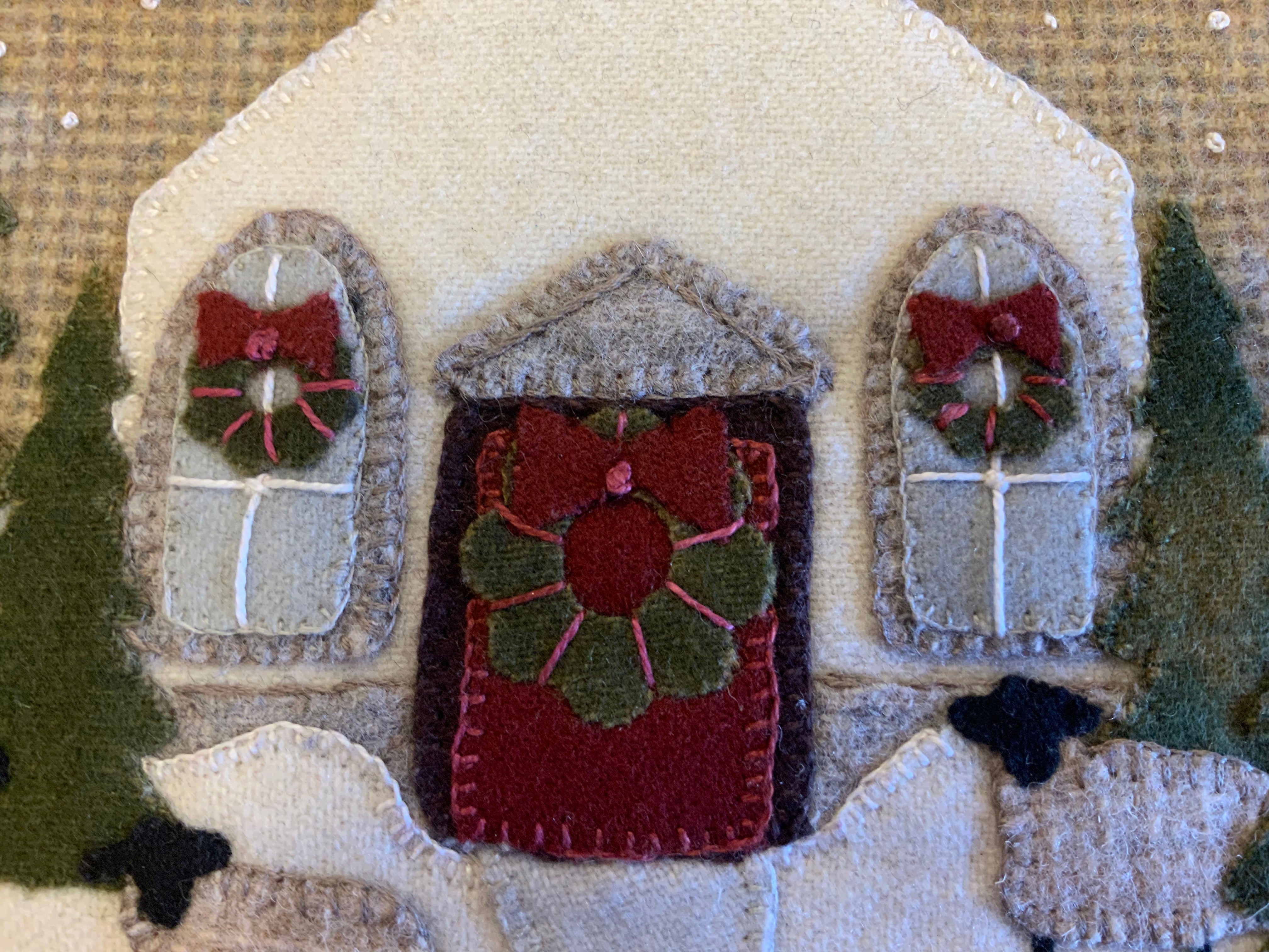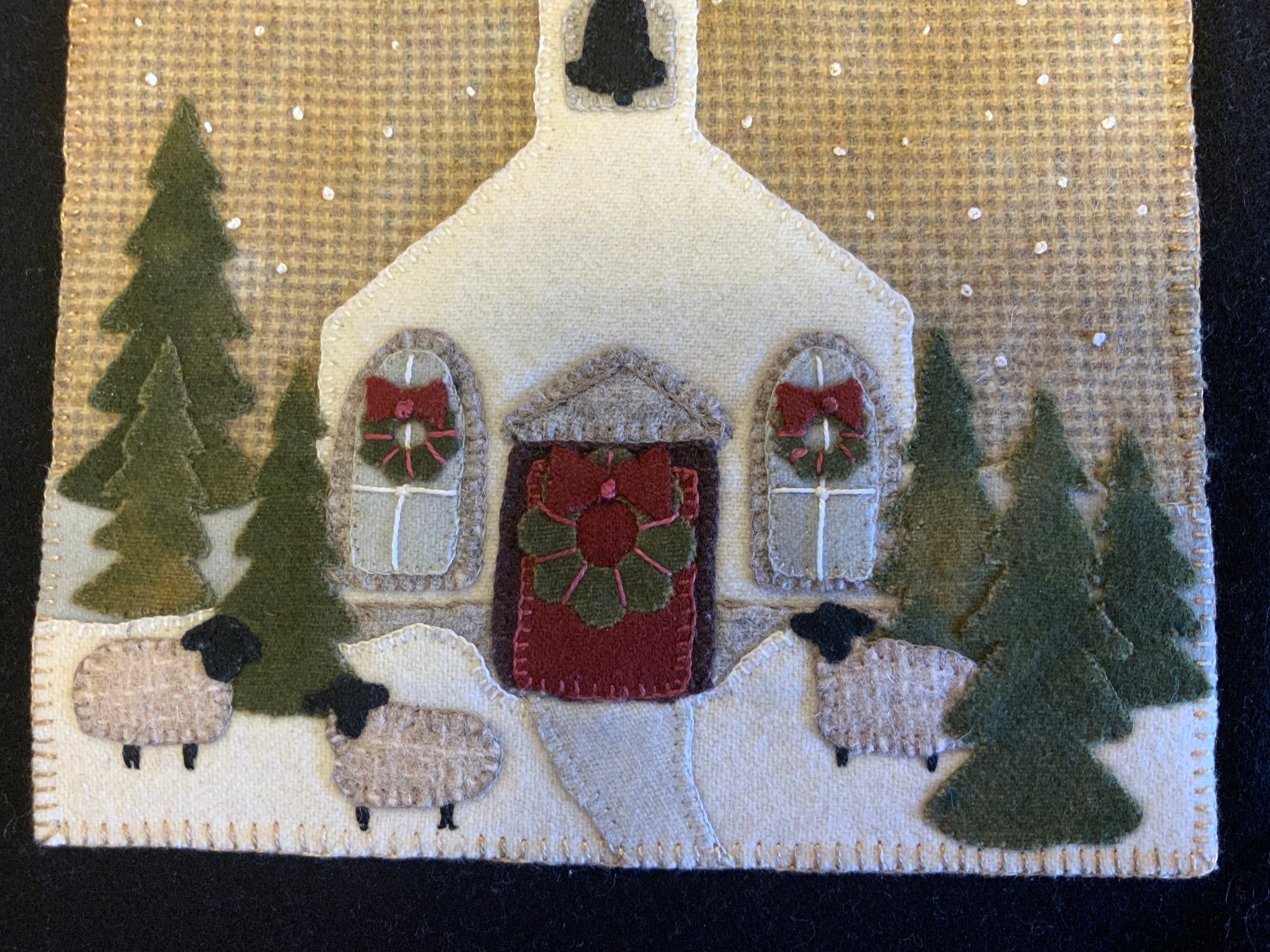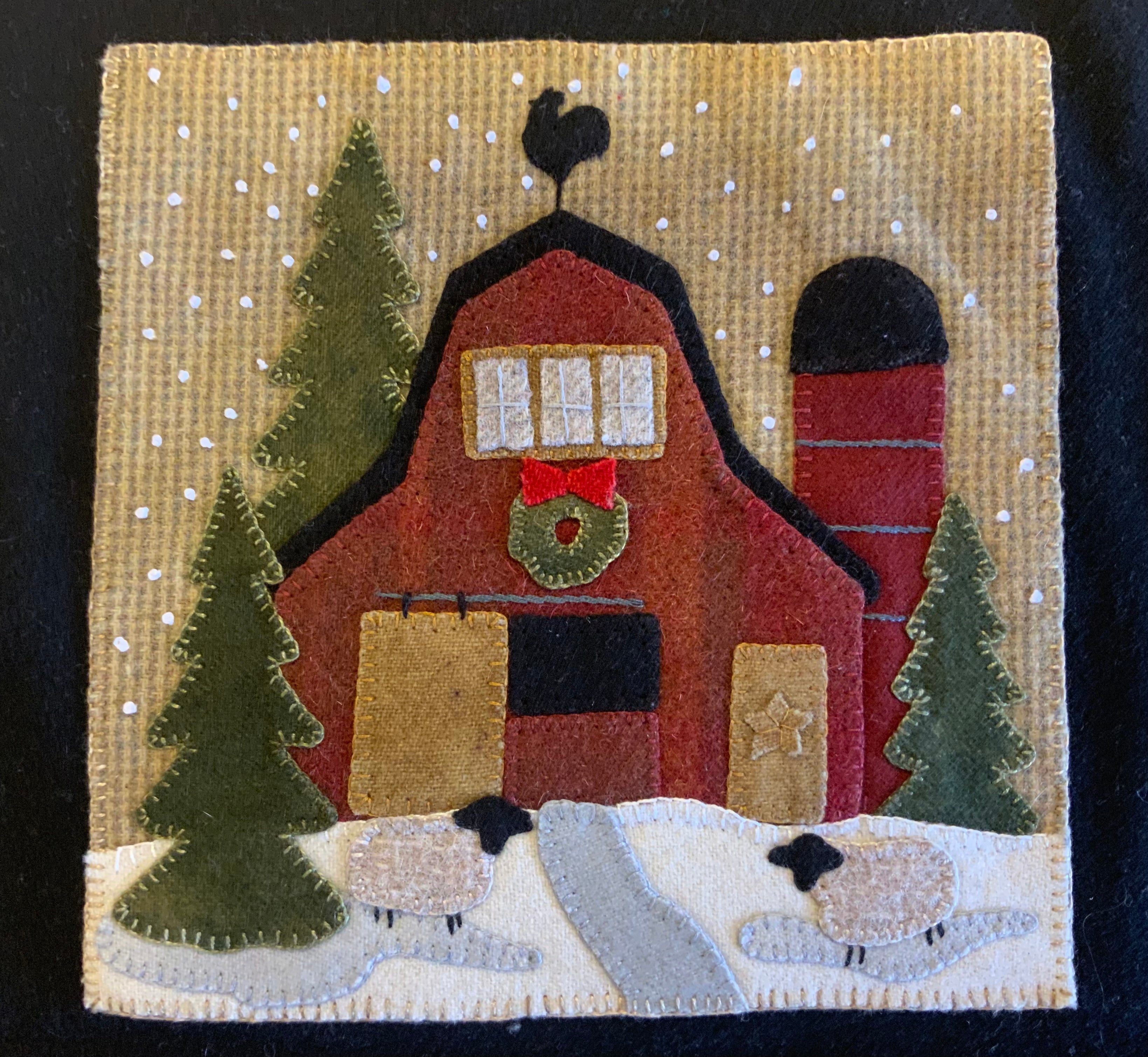 Crane Designs newest pattern is a walk down memory lane of a 'ole country village, on a frosty day. It is designed with four individual panels featuring a old barn with a small flock of sheep, farmhouse with a milk delivery truck, a wonderful old country church with sheep enjoying the peace of the country side. The last panel is the old Manor house with even a fun and sassy snowman. Just a fun piece to stitched that may be displayed all winter long. This fun applique piece may be used as a wall-hanging or even as individual pillows. The piece includes some easy embroidery stitches to make the piece just pop..we hope you enjoy. This piece was created with rich hand dyed and textured wools that radiates a warm and rich feeling. The thread packet includes 8 balls of Valdani #8 pearl cotton in the colors needed