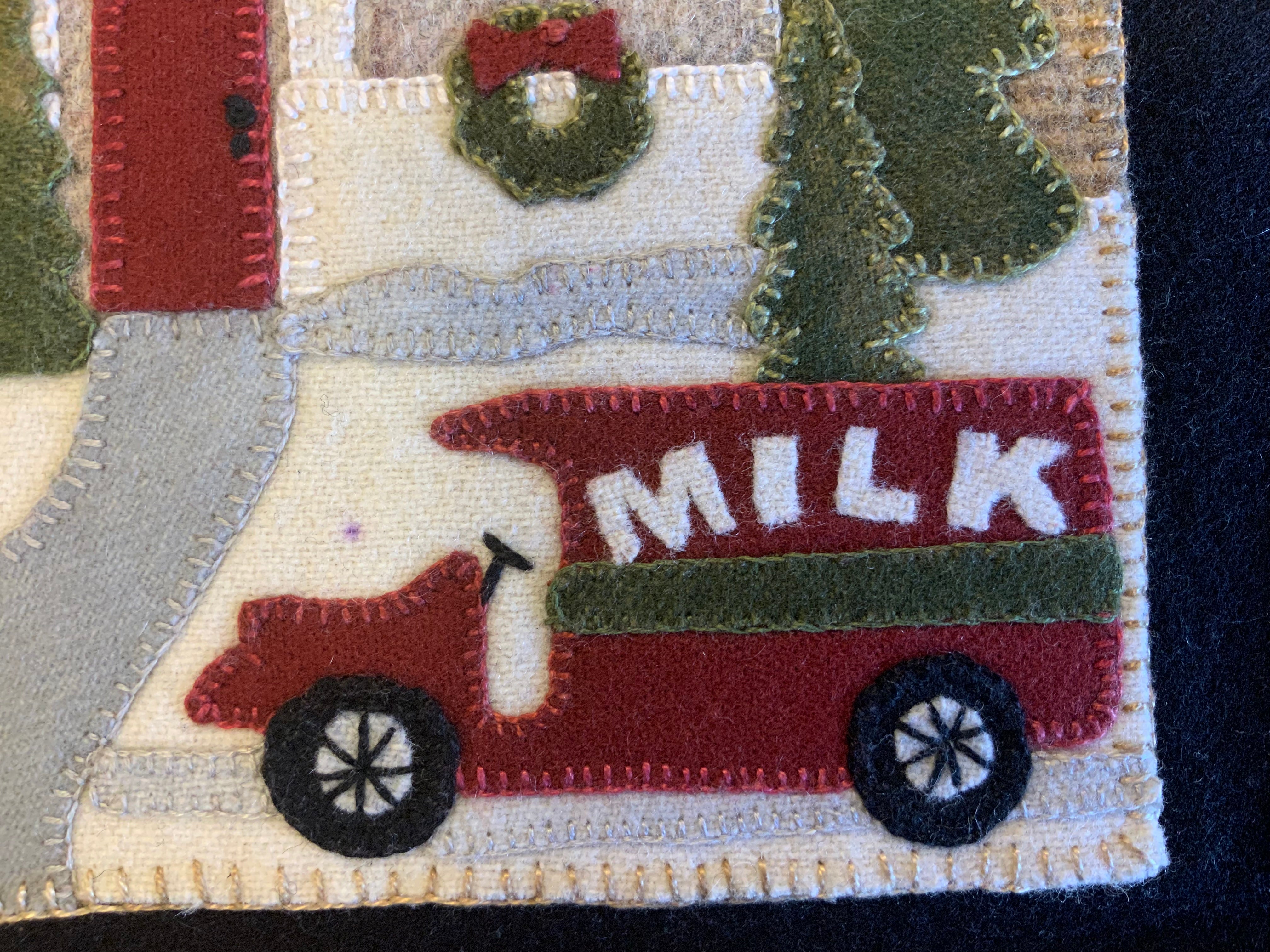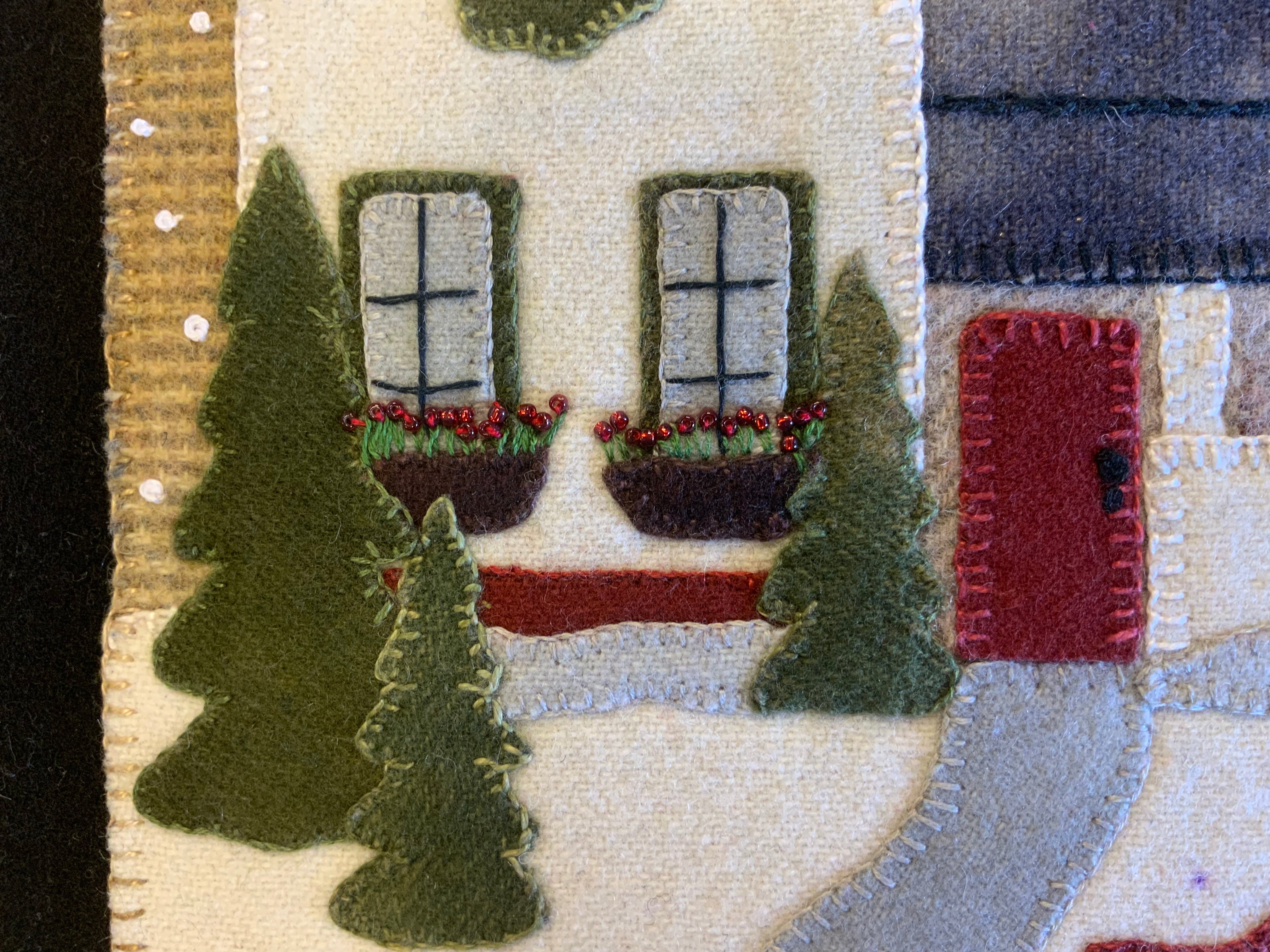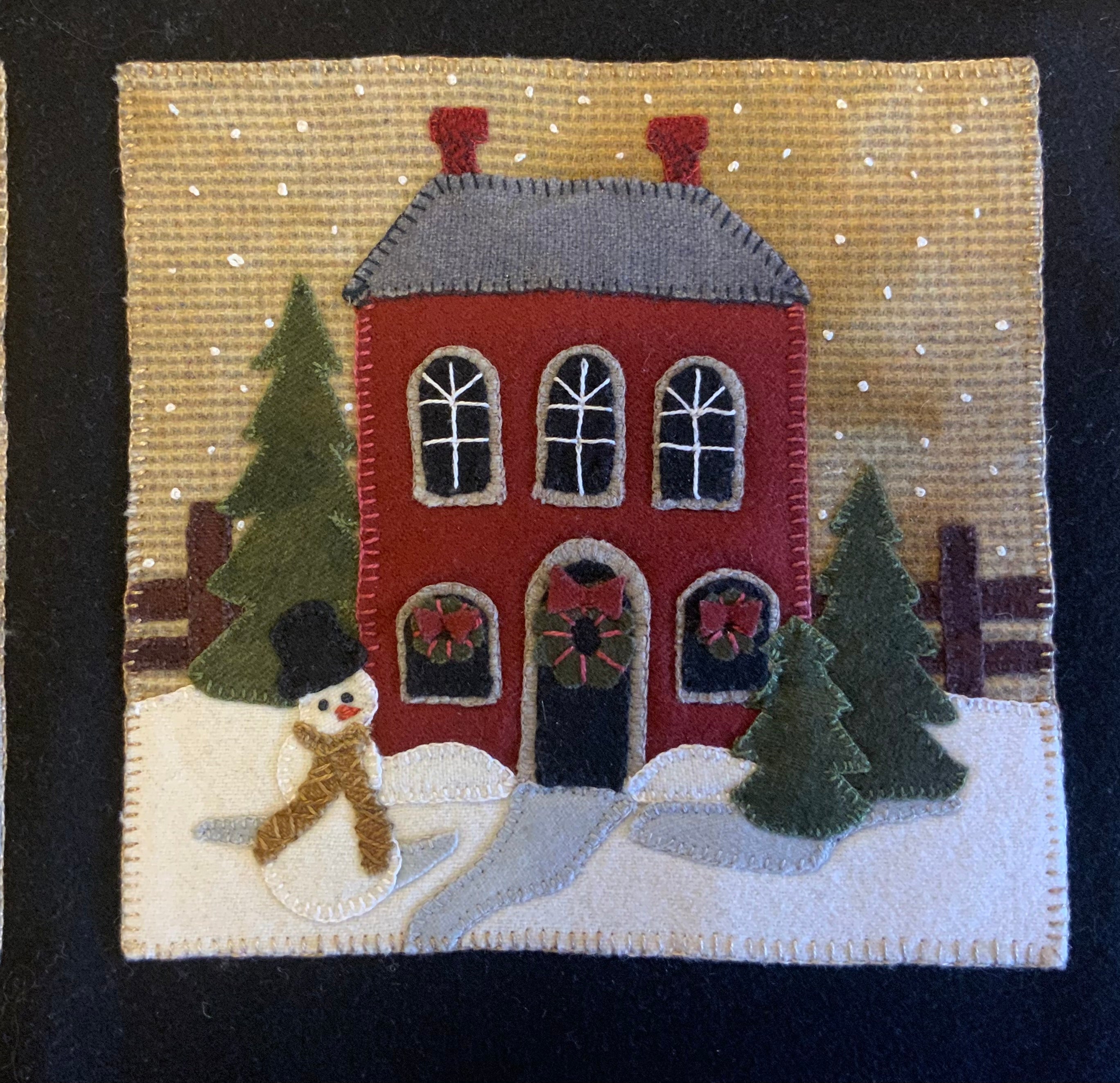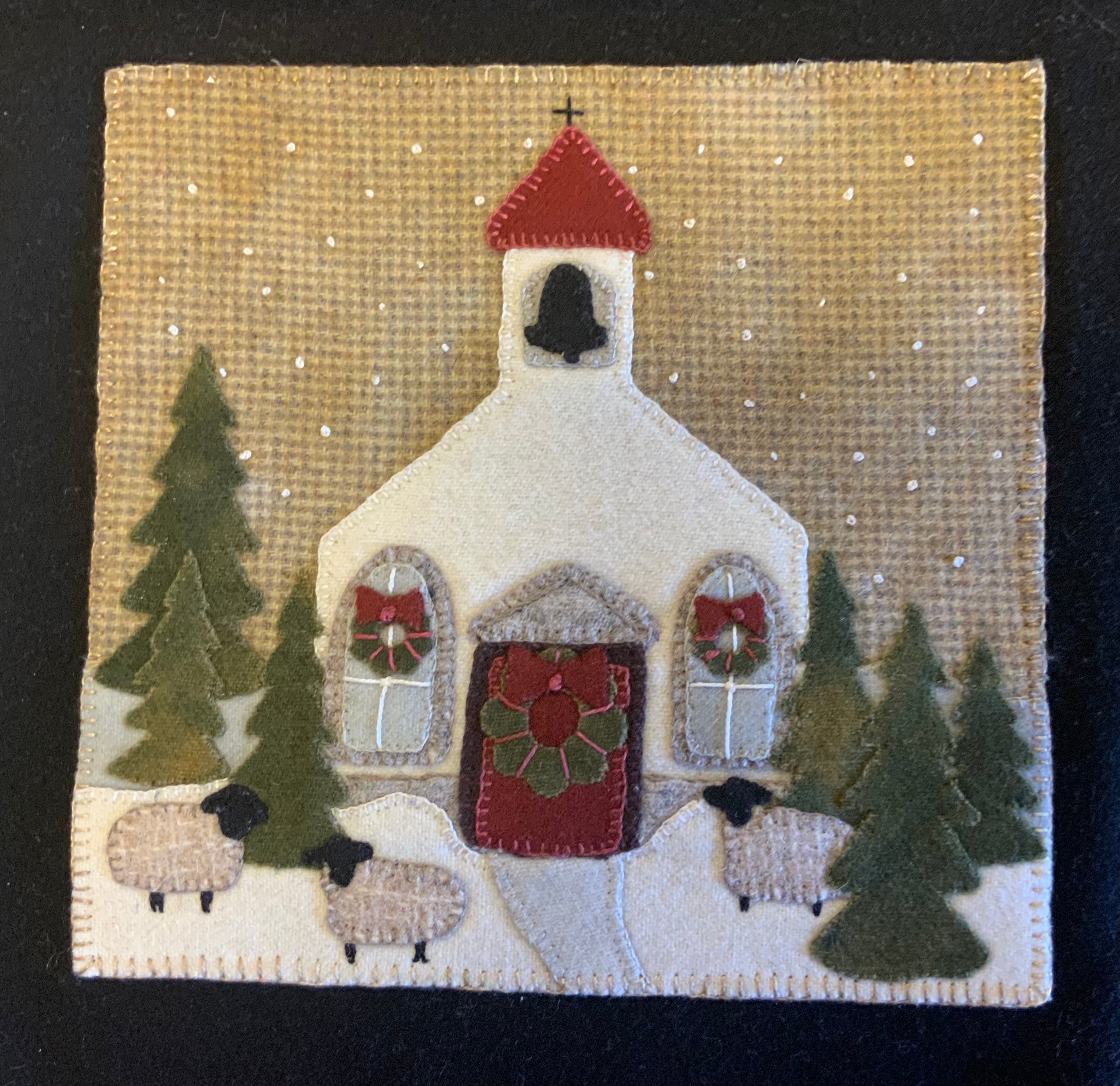 Crane Designs newest pattern is a walk down memory lane of a 'ole country village, on a frosty day. It is designed with four individual panels featuring a old barn with a small flock of sheep, farmhouse with a milk delivery truck, a wonderful old country church with sheep enjoying the peace of the country side. The last panel is the old Manor house with even a fun and sassy snowman. Just a fun piece to stitched that may be displayed all winter long. This fun applique piece may be used as a wall-hanging or even as individual pillows. The piece includes some easy embroidery stitches to make the piece just pop..we hope you enjoy. This piece was created with rich hand dyed and textured wools that radiates a warm and rich feeling. The thread packet includes 8 balls of Valdani #8 pearl cotton in the colors needed