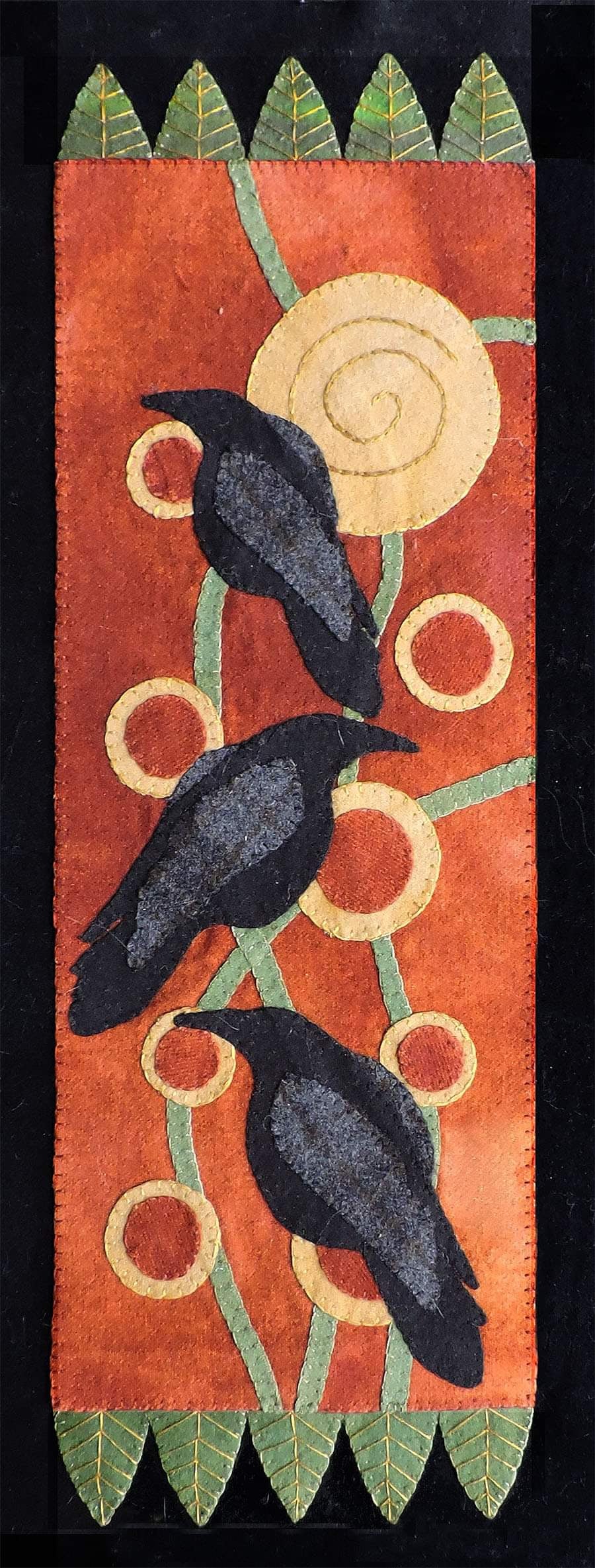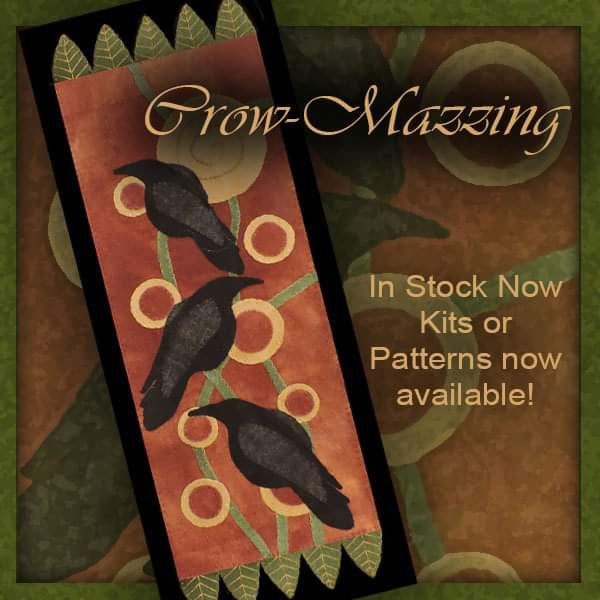 If you’re just getting started in appliqué and want a fun, easy project to start with, this is the perfect design. Or maybe you’ve been stitching for a while and just want something simple to work on during your busy spring gardening time? Working with beautiful wools, and of course Pennie’s and birds are some of the most popular subjects! When Jan makes the birds crows, it’s even better! Measuring 11x25 it’s a nice sized piece without being over whelming. The simple stitching makes it a great beginner piece, but there is room for lots of fun stitching to be added! With only 4 colors of wools you only need 4 thread colors working with valdani a beautiful Varigated threads so you don’t need a big stash of threads either!