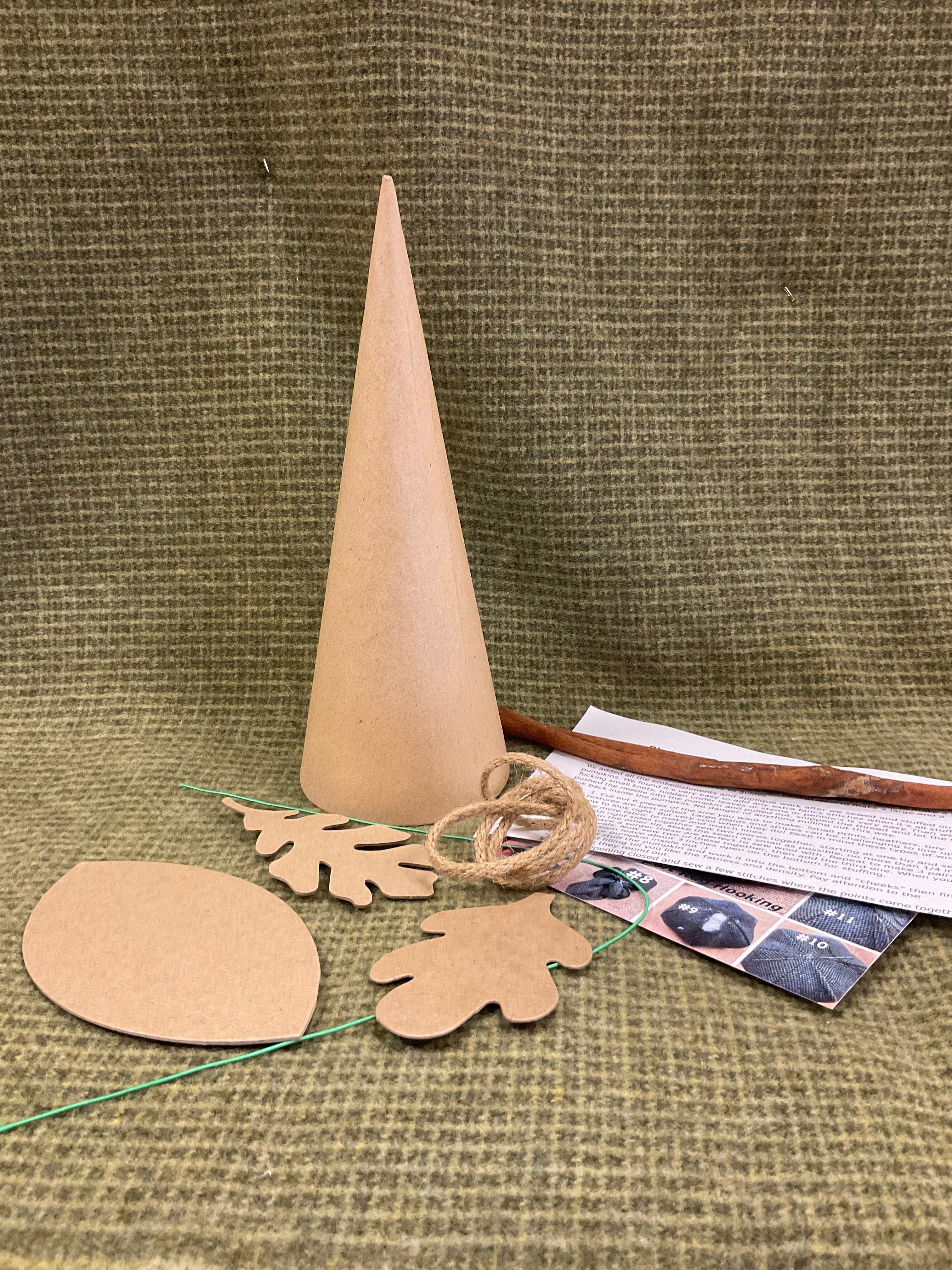 This is our DIY kit that you will add your own wool and cotton and fun embellishments. This includes the instructions, the pattern for the head and leaves, the 10 inch cone, jute tubing, wire, the 10-12 inch cinnamon stick.