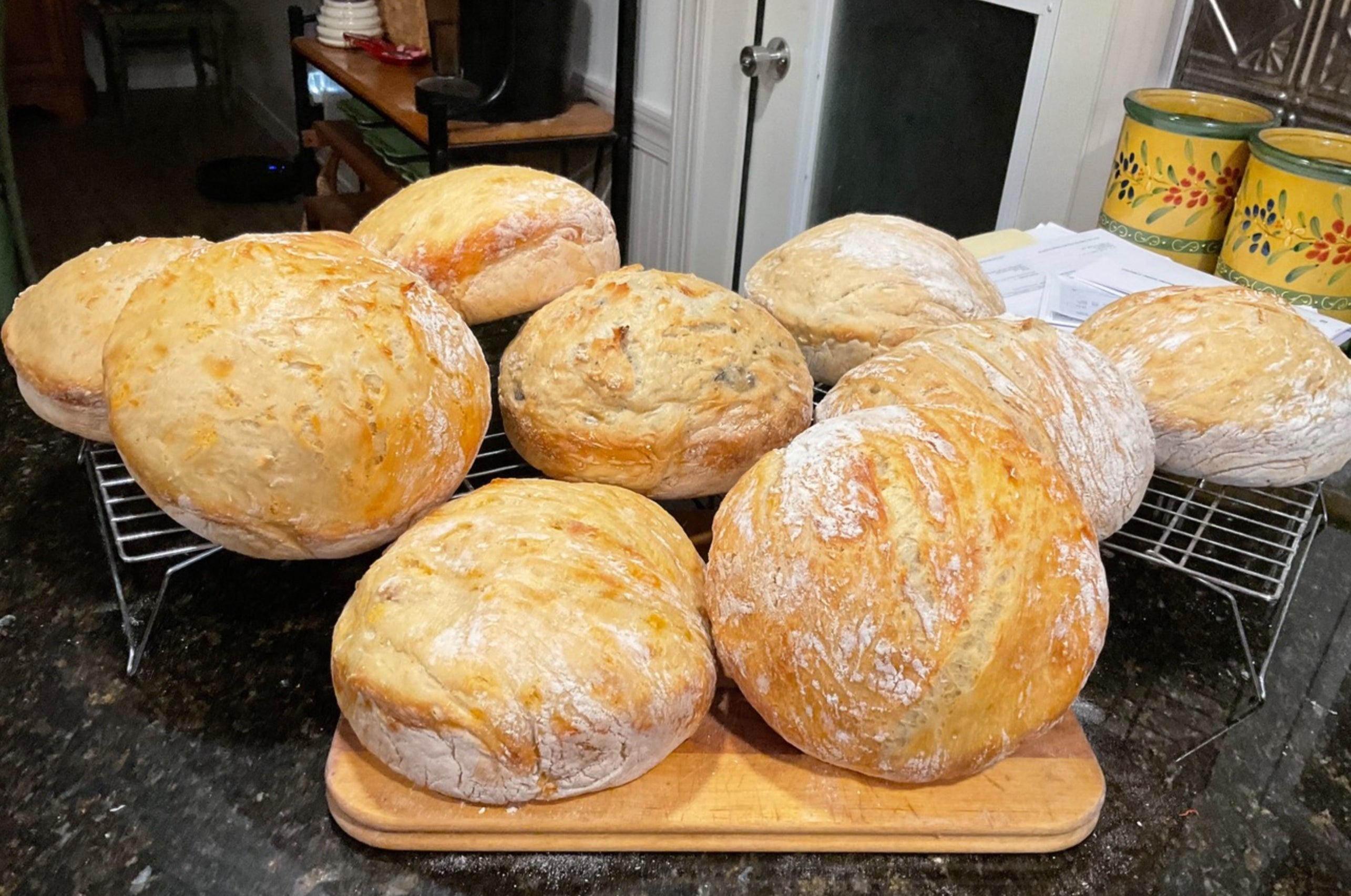 Remove lid and bake another 10 minutes or until golden brown. I test for a 200 temp with my thermometer in the bread. Then just let cool and enjoy! You can add anything for flavor and seasoning to the dry ingredients before adding the water. Some of the things we like to add are dried fruit, cinnamon, cranberries, grated cheeses, bacon, anything you like as long as it is not wet to change your moisture in the dough you can go for it! Have fun and experiment. Spice blends, fresh parsley, chives, roasted garlic anything goes! This is a very easy bread to bake! It does tend to have a hard bottom crust but it trims right off if you do not like it.