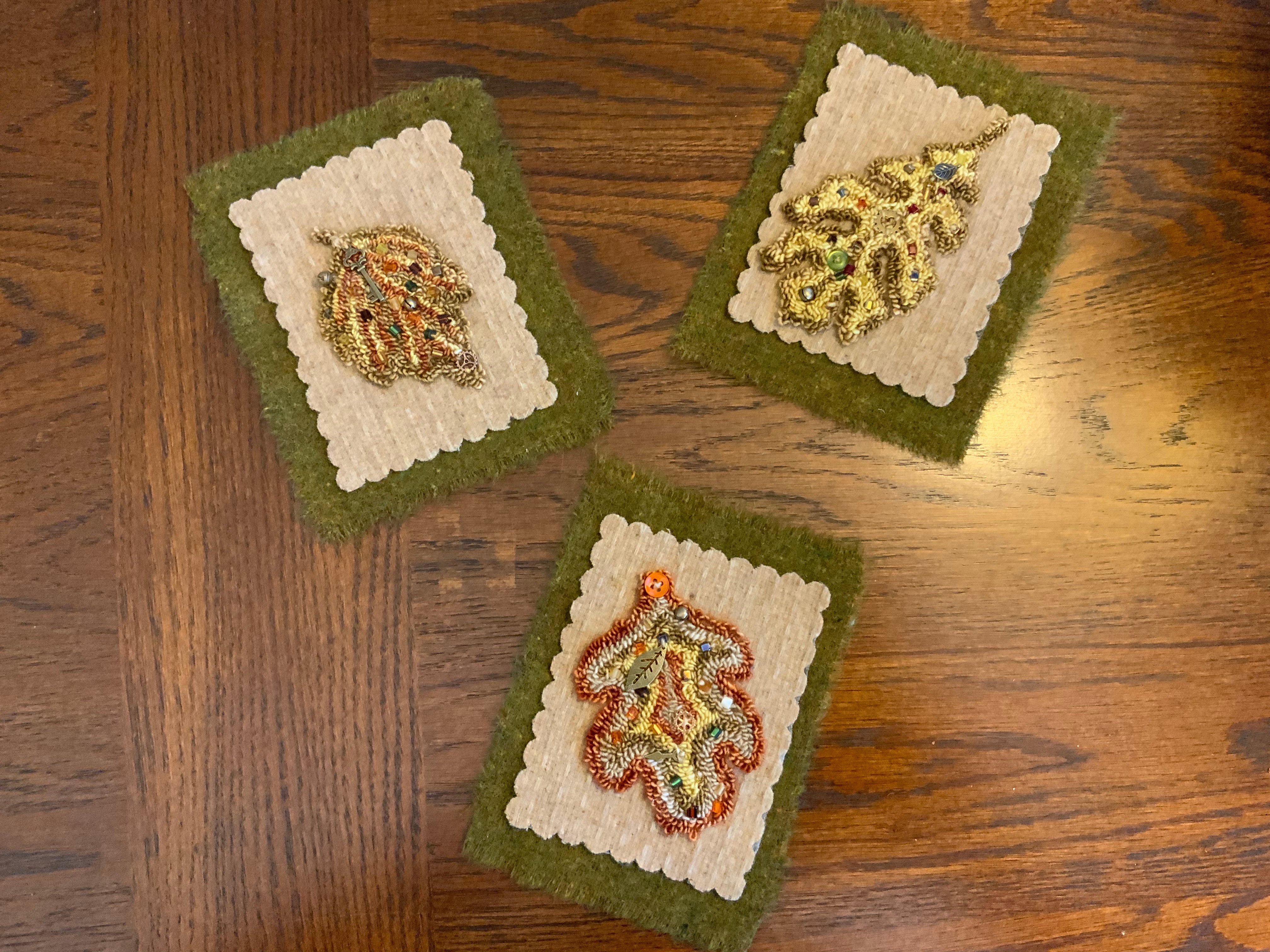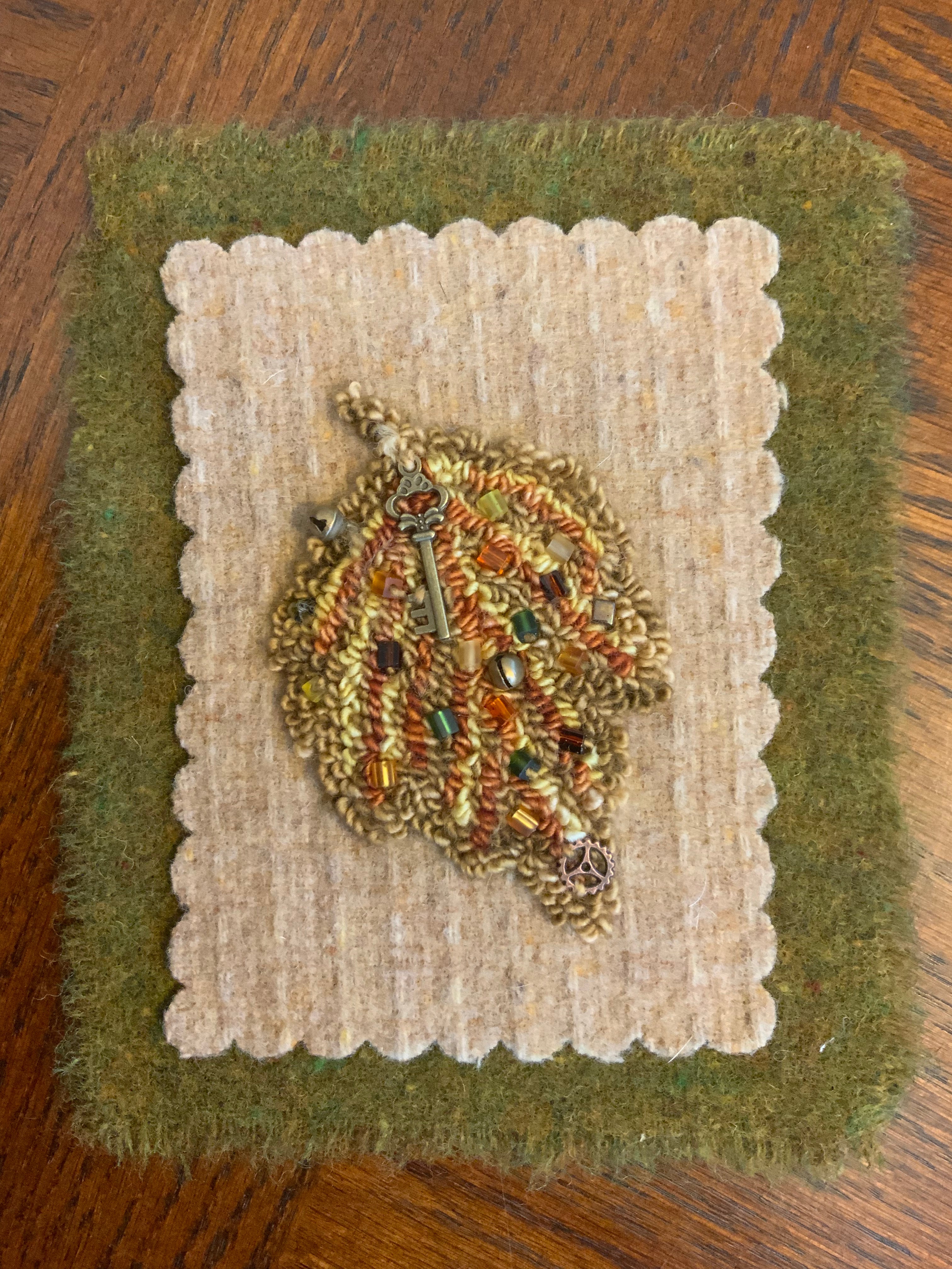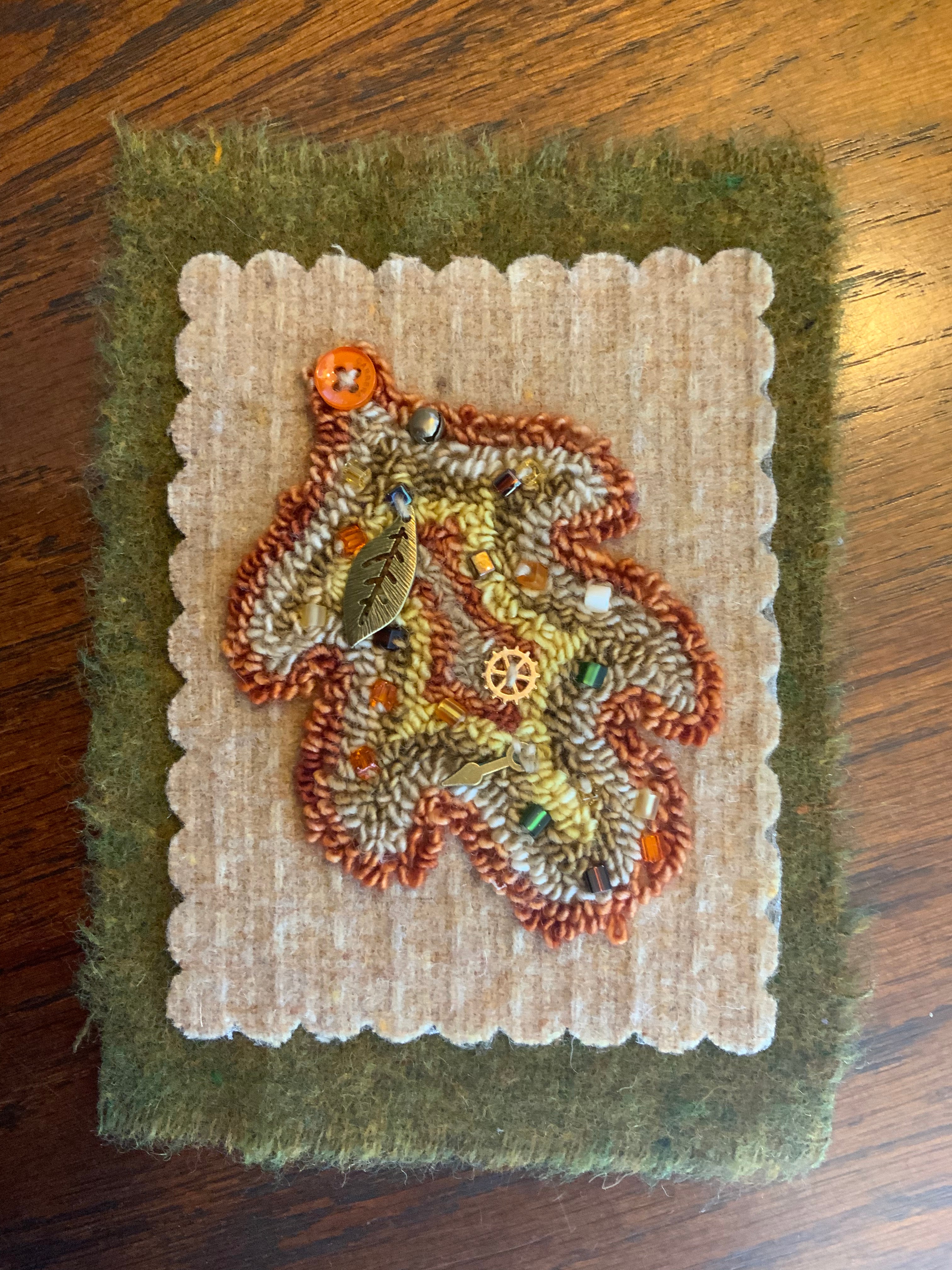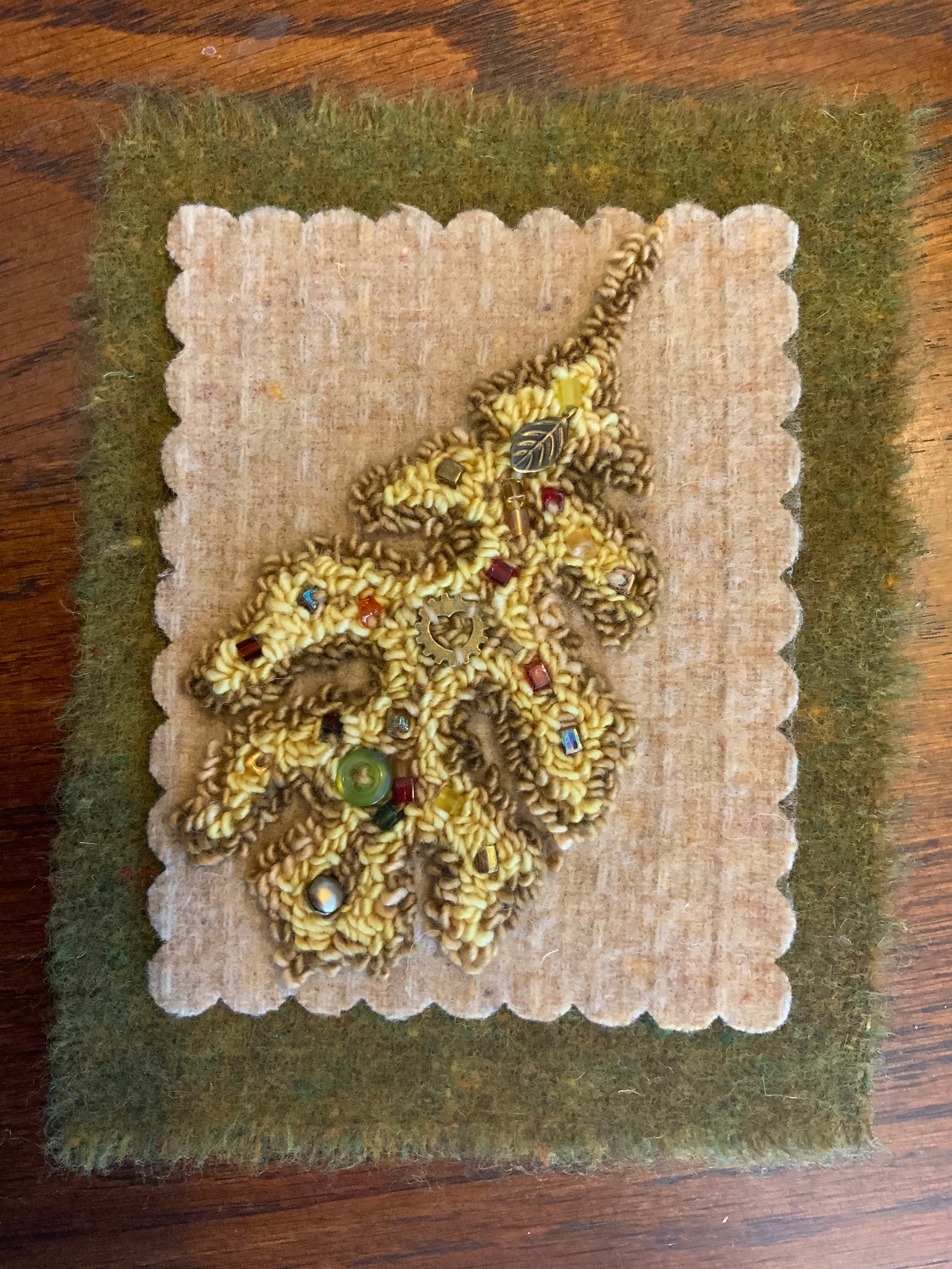 The cool fall winds are creating a flutter of color as the leaves swirl down from the trees. Early mornings may cast a sparkle here and there as early morning sun hits the first firsts adorningsome. The beautiful glass beads in your kit, along with the hand dyed yarns will help you create a beautiful effect to have for ever. We even add a few extra pretty charms to stitch in. Your kit includes the fused pattern on wool and weavers cloth, your hand dyed merino yarns, the backing to mount it on and an assortment of embellishments that include beads, buttons, charms and instructions. Your finished piece can be framed, mounted in a shadow box or hung on our small banner hanger.