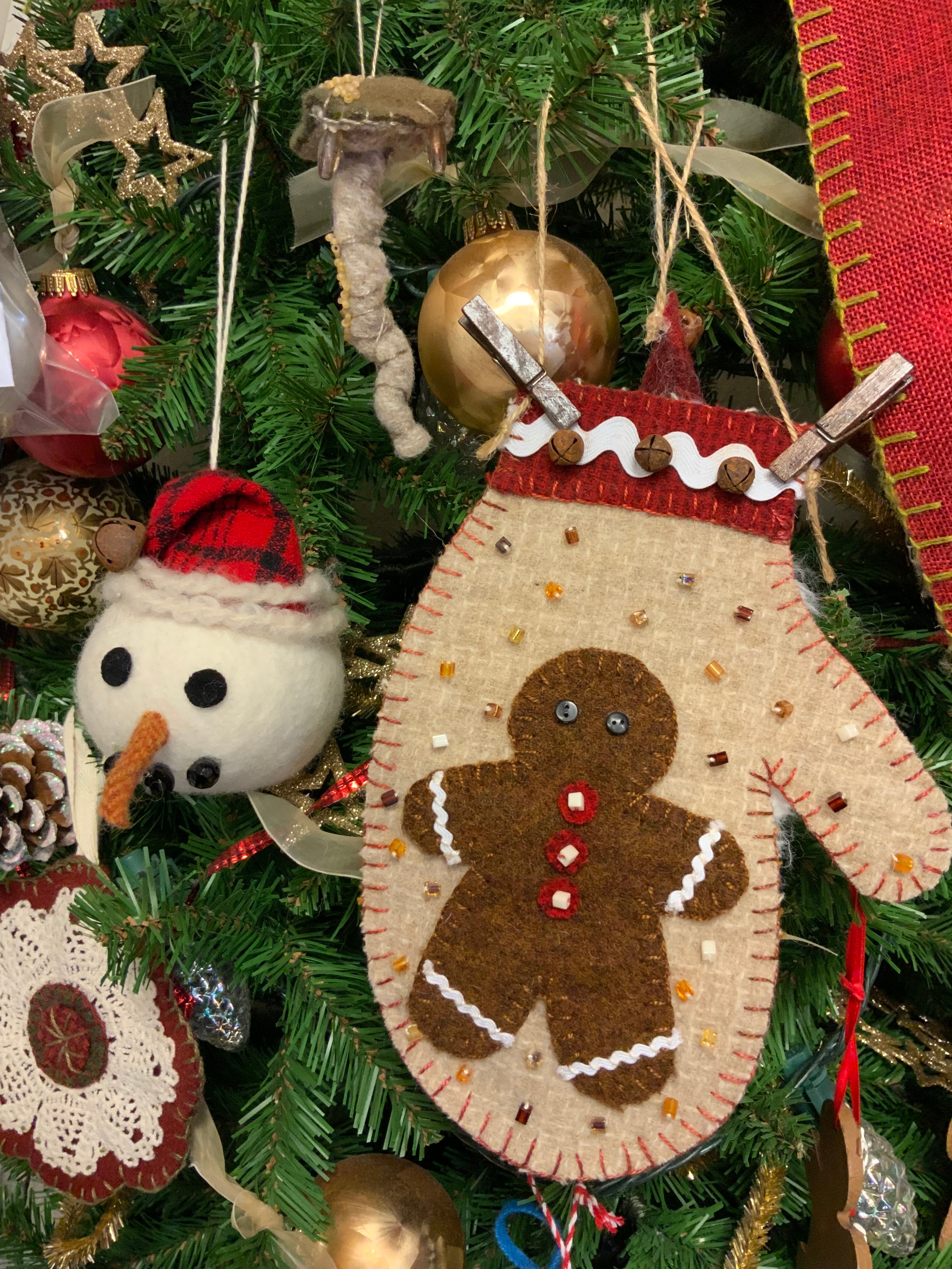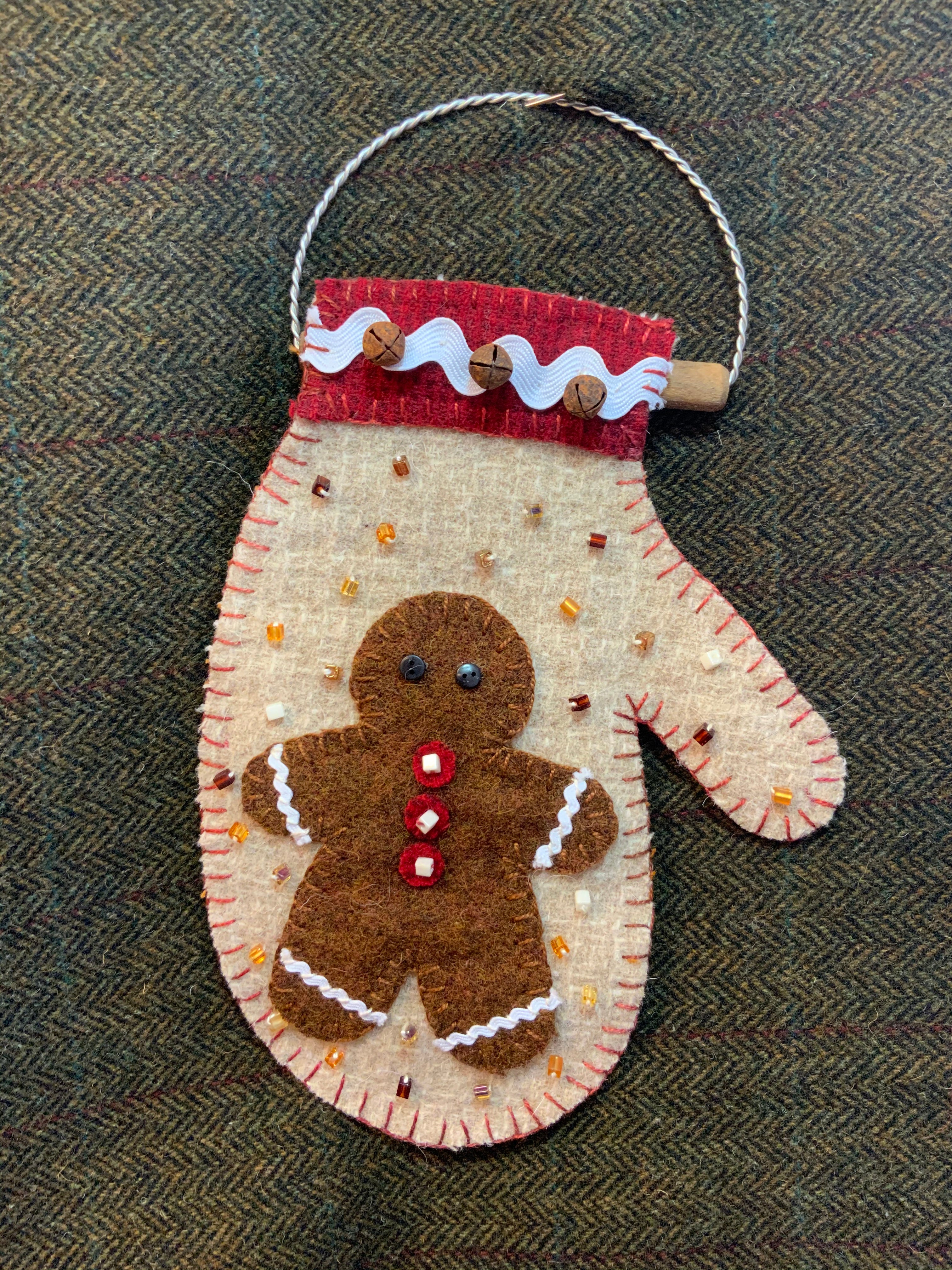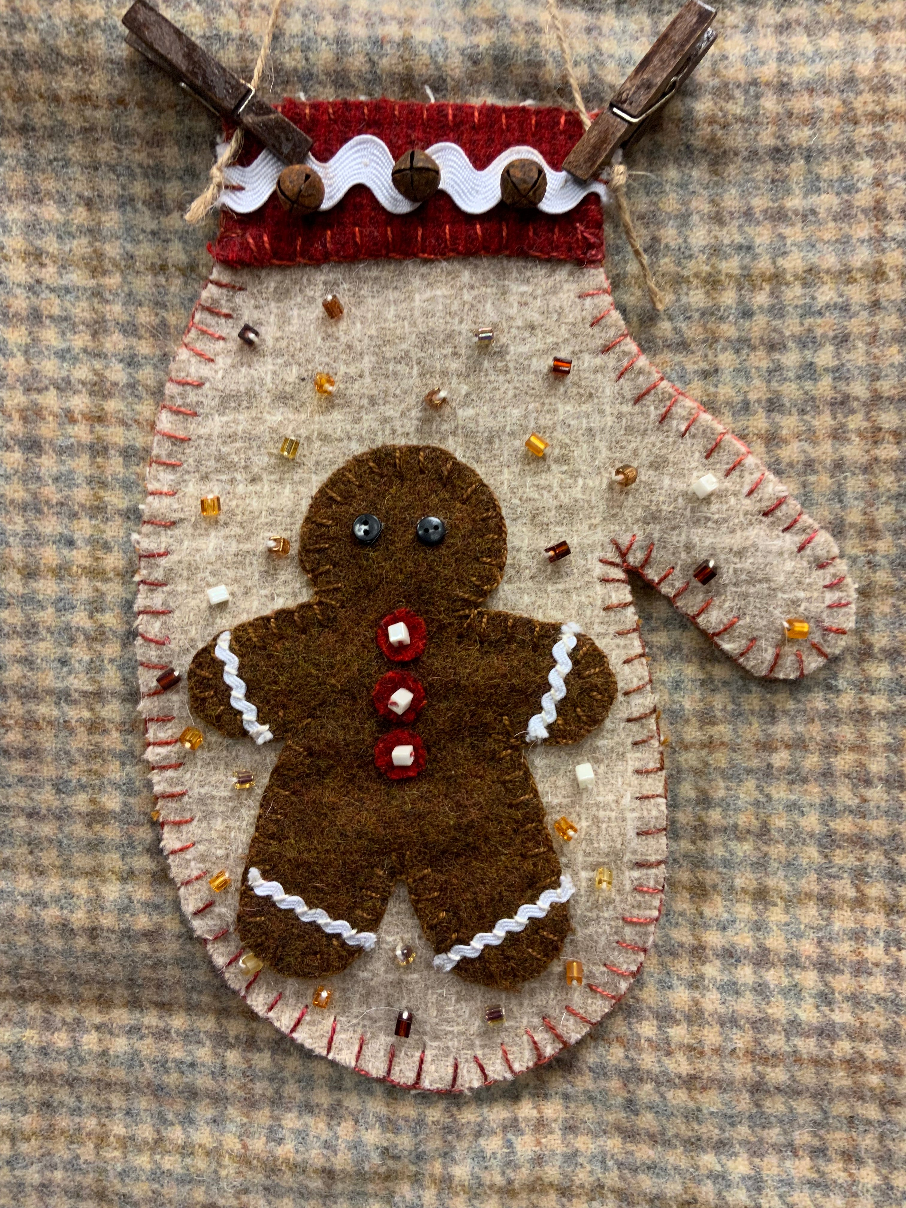 Another mitten to add to your collection! Kit includes everything you need to stitch it as shown. All the pre cut wool, thread, glass beads, bells and embellishments