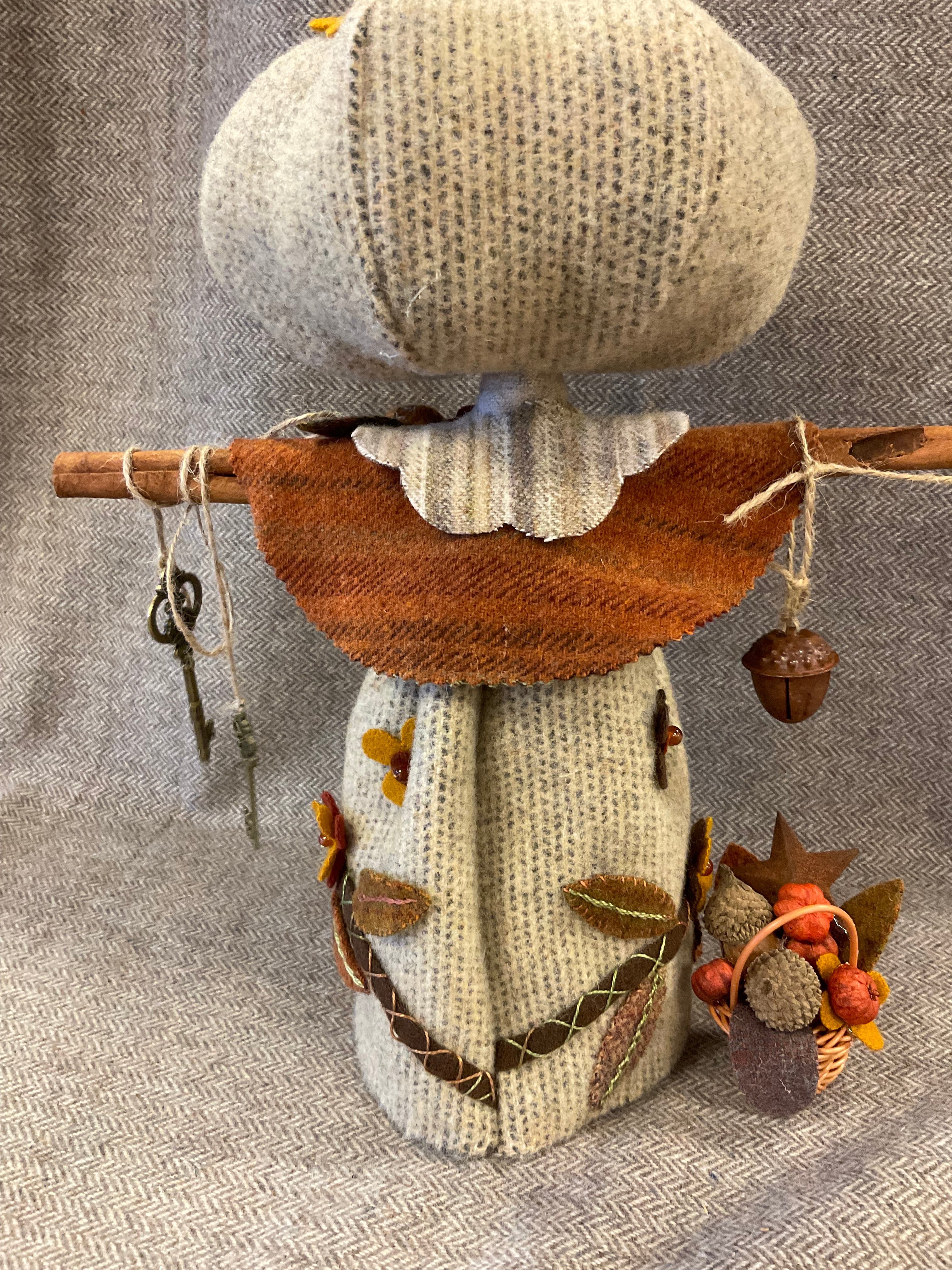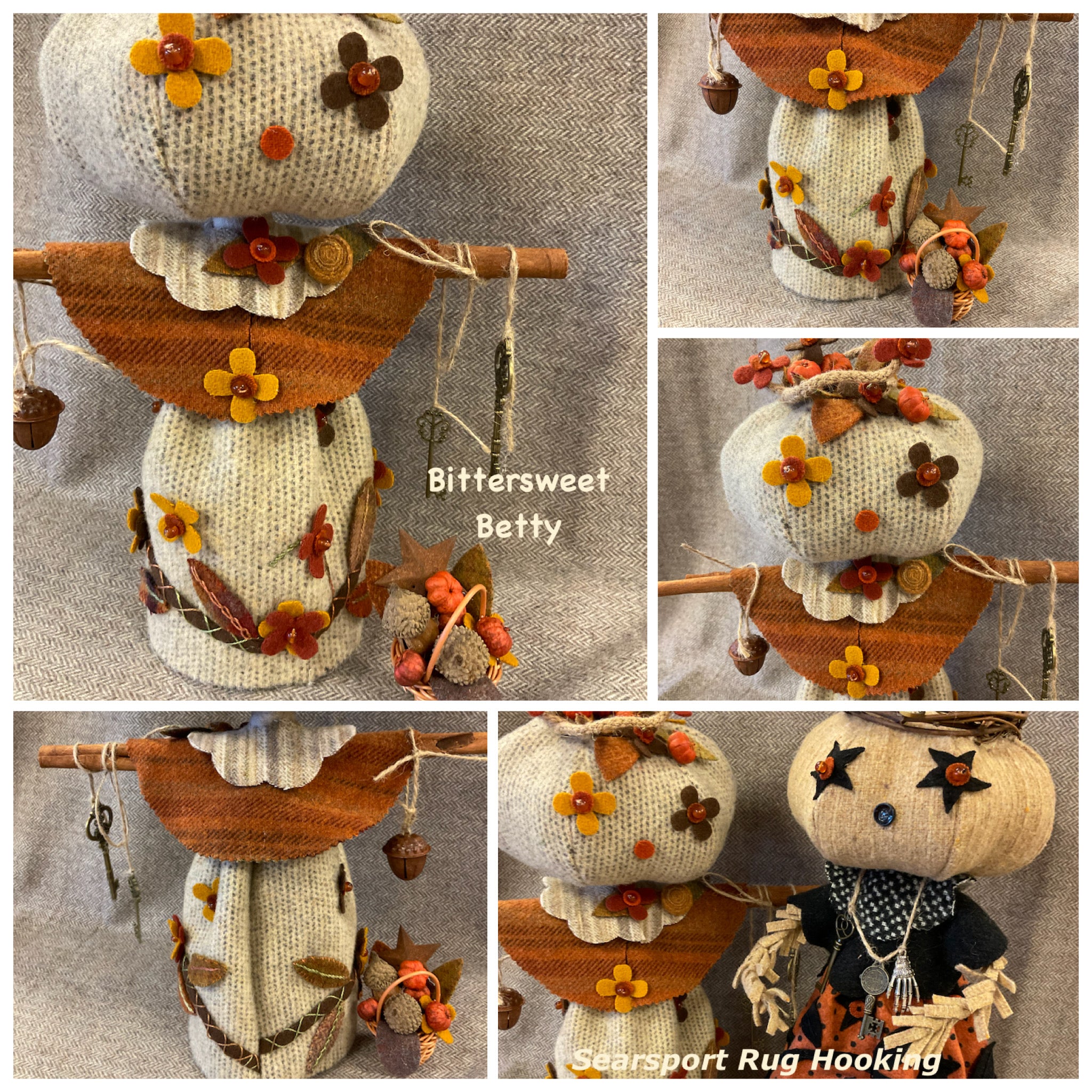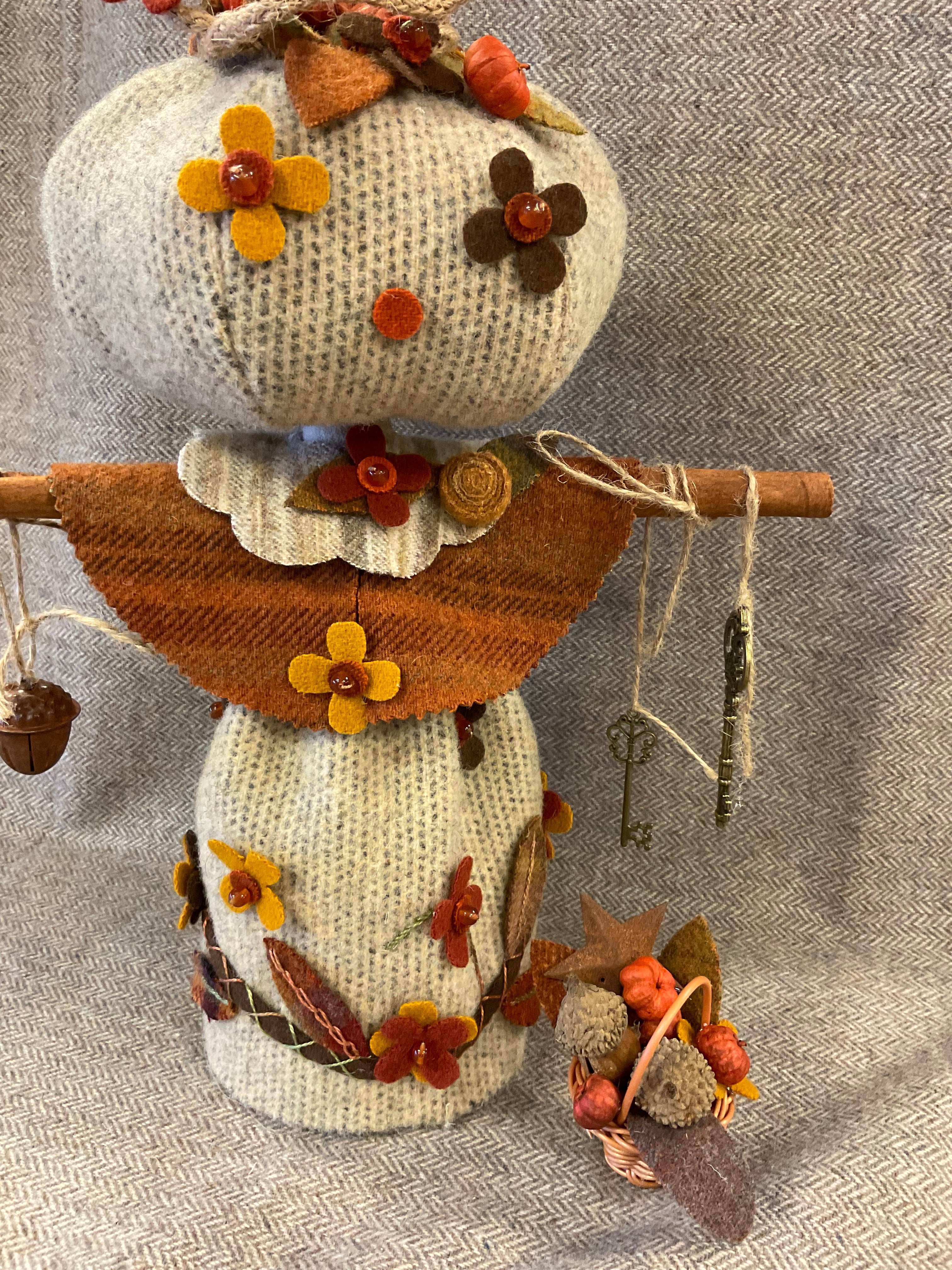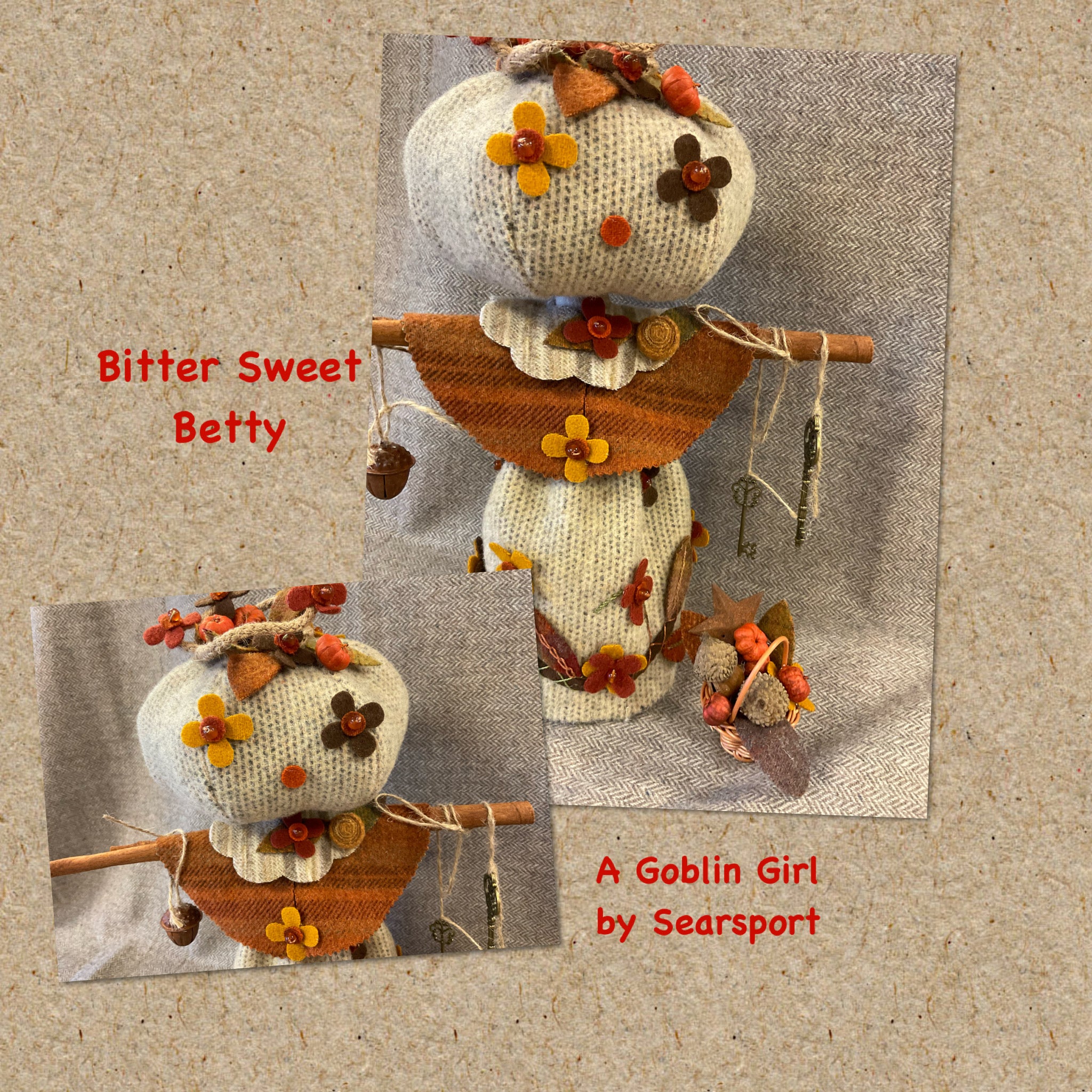 Betty Bitter Sweet has been busy gathering bittersweet for wreaths and acorns and pumpkins for her hearth to ride out the winter! What happens when you combine our mini pumpkins pre cut kit for the head… cotton or wool for the skirt and cape and collar …paper mache cones…cinnamon sticks ….. brass Keys and acorn bells…….snowflakes and holly leaves…. bits of lace and all kinds of pre cut Woolies….wire and jute and beads and more! Wrap in some sari silk and hang an acorn bell or sew on rusty stars….. we make it easy so you can pick one of our girls and we will send you everything to make your own Goblin Girl! So many cool ideas and ways to create your own grouping!