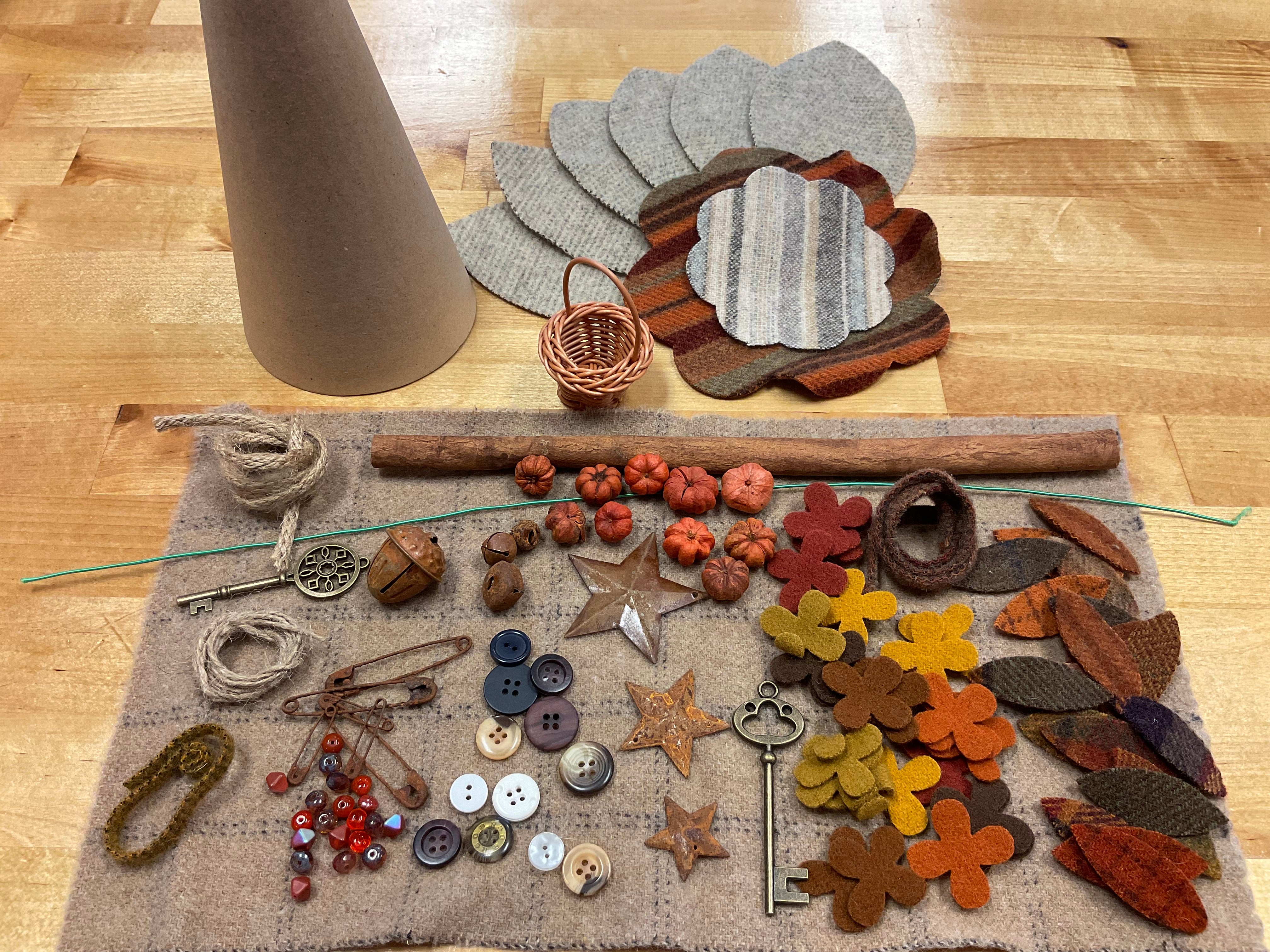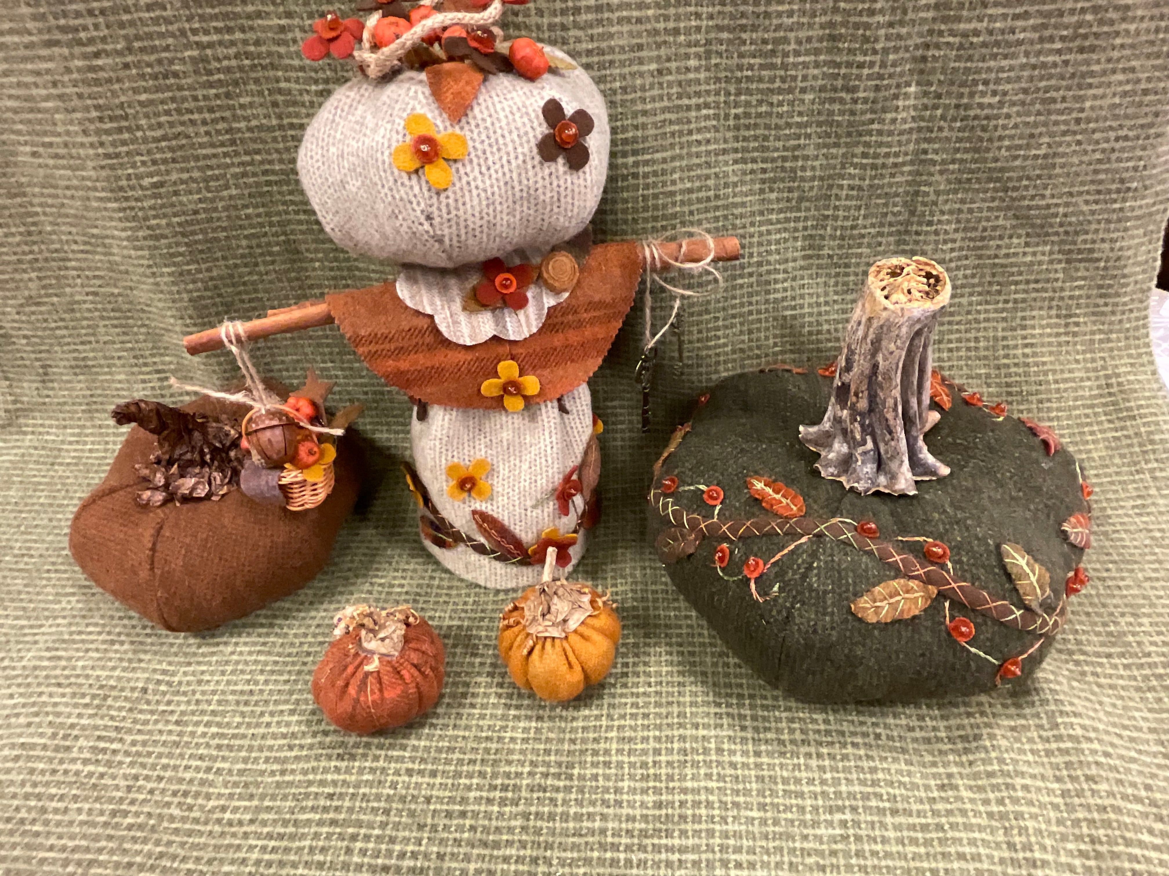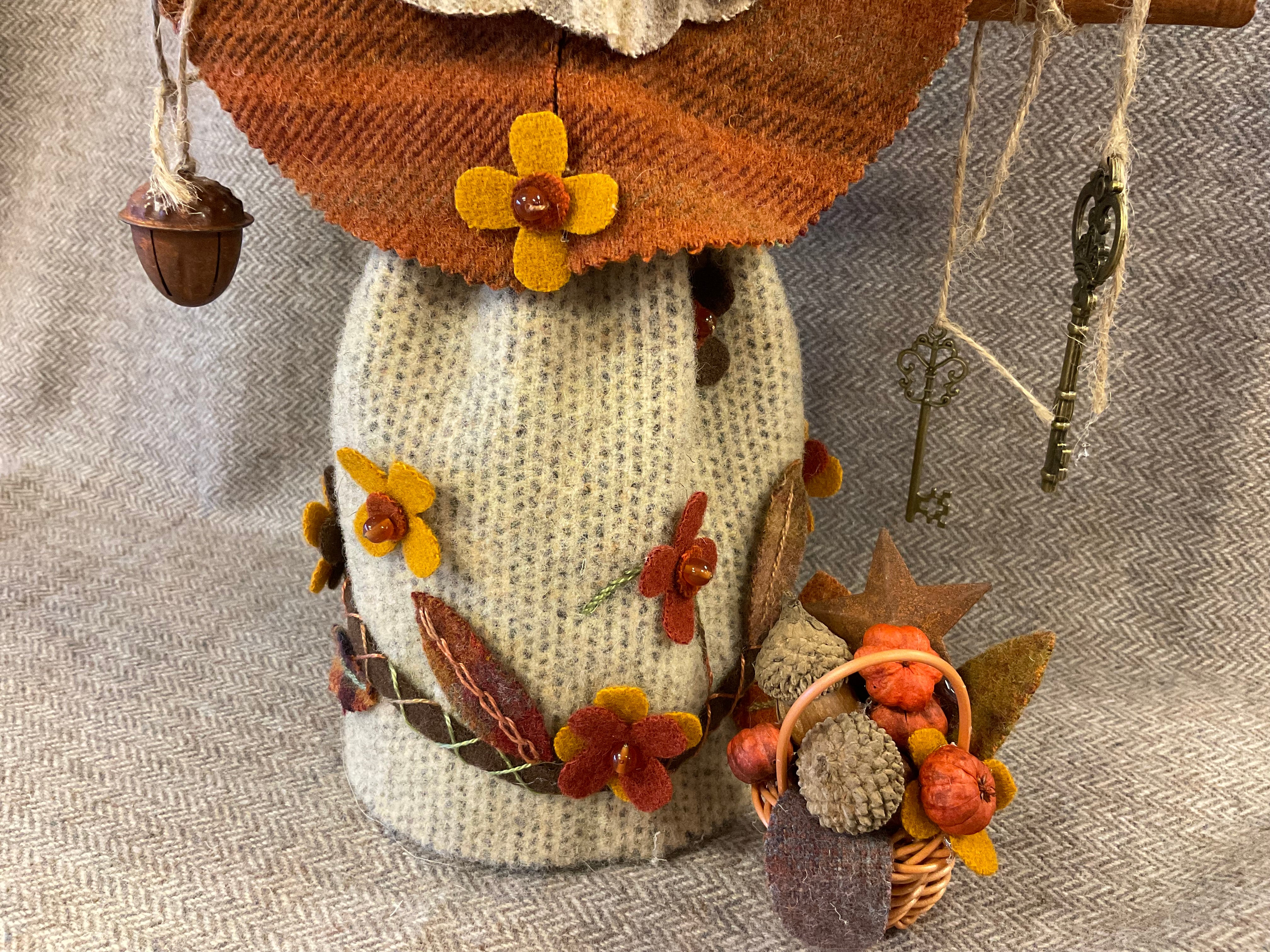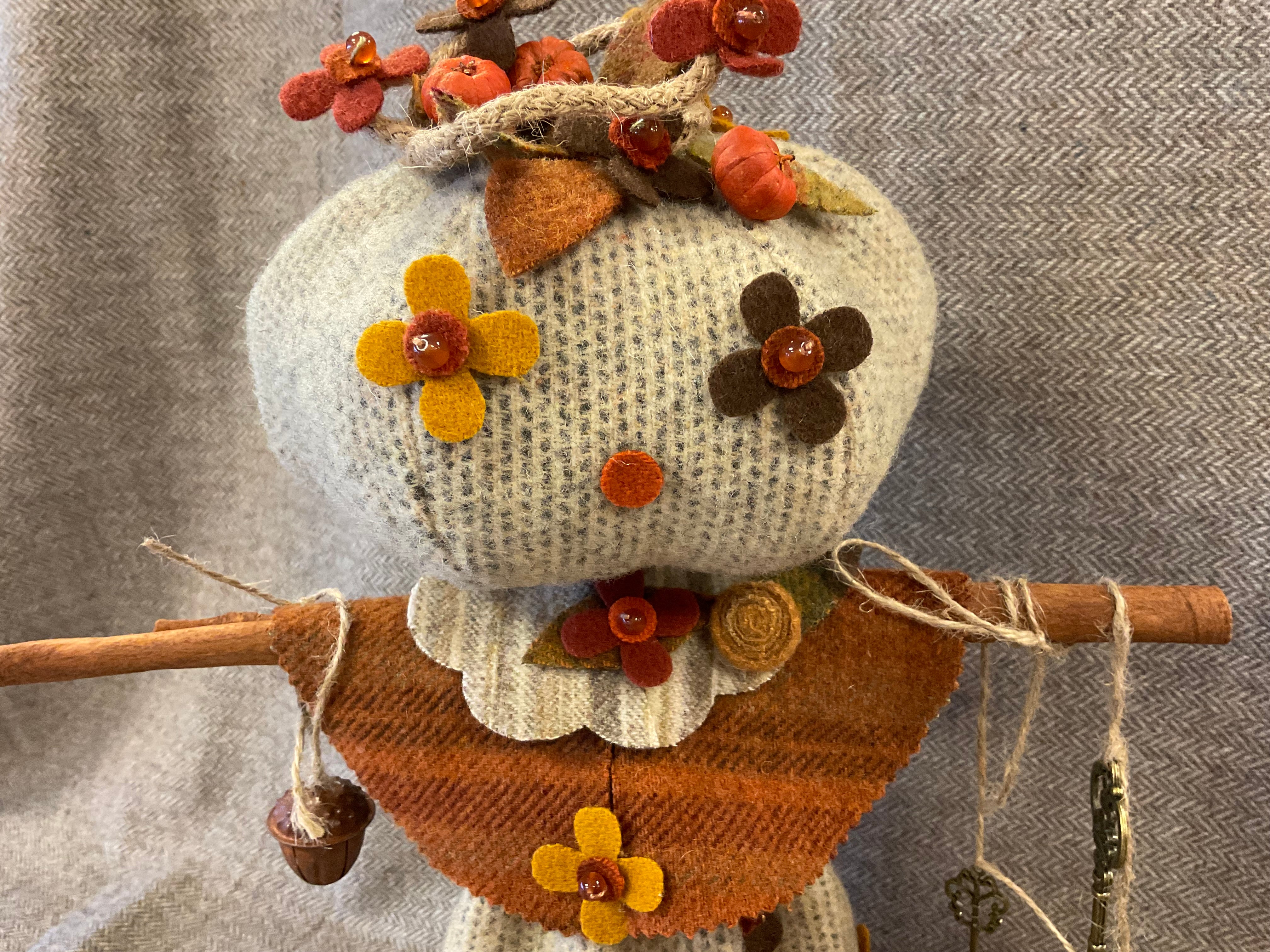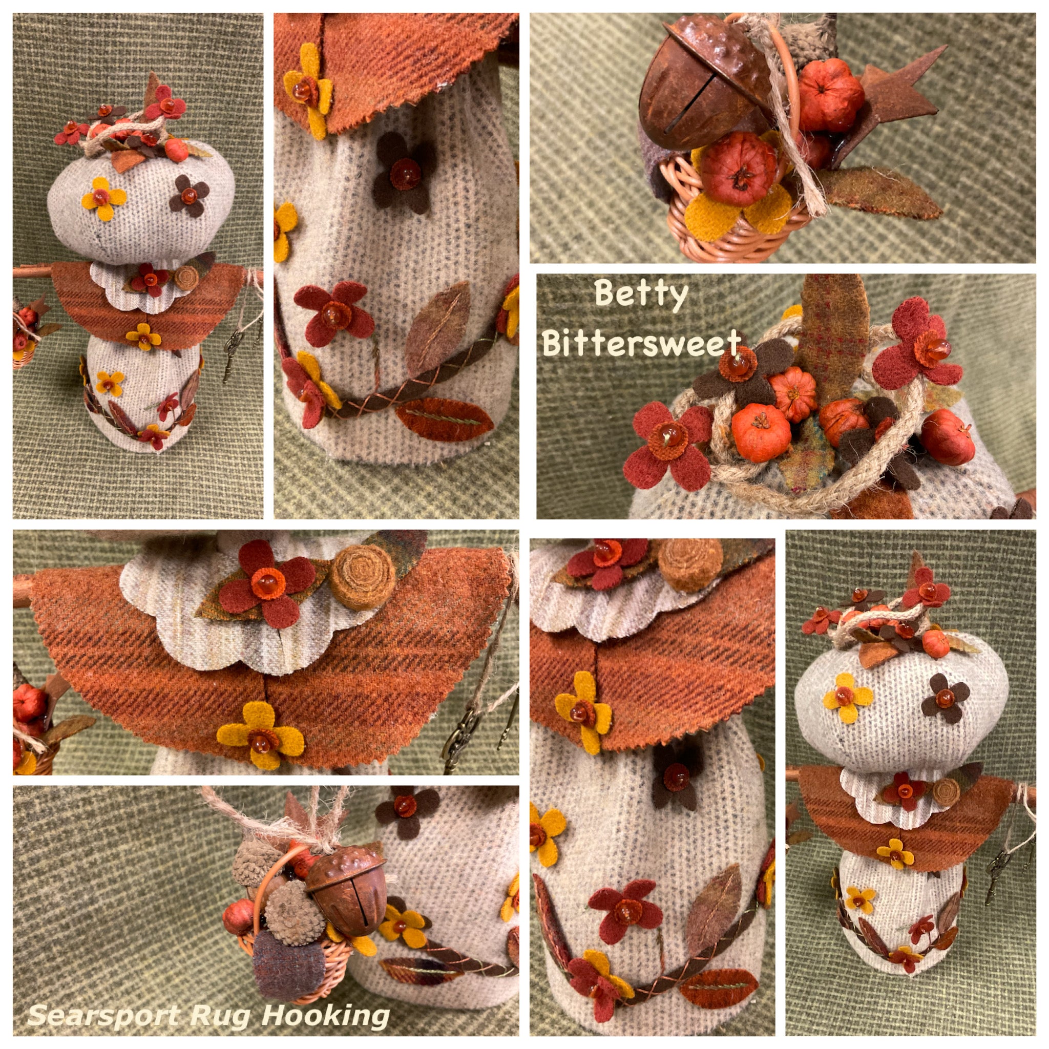 Betty Bitter Sweet has been busy gathering bittersweet for wreaths and acorns and pumpkins for her hearth to ride out the winter! What happens when you combine our mini pumpkins pre cut kit for the head… cotton or wool for the skirt and cape and collar …paper mache cones…cinnamon sticks ….. brass Keys and acorn bells…….snowflakes and holly leaves…. bits of lace and all kinds of pre cut Woolies….wire and jute and beads and more! Wrap in some sari silk and hang an acorn bell or sew on rusty stars….. we make it easy so you can pick one of our girls and we will send you everything to make your own Goblin Girl! So many cool ideas and ways to create your own grouping!