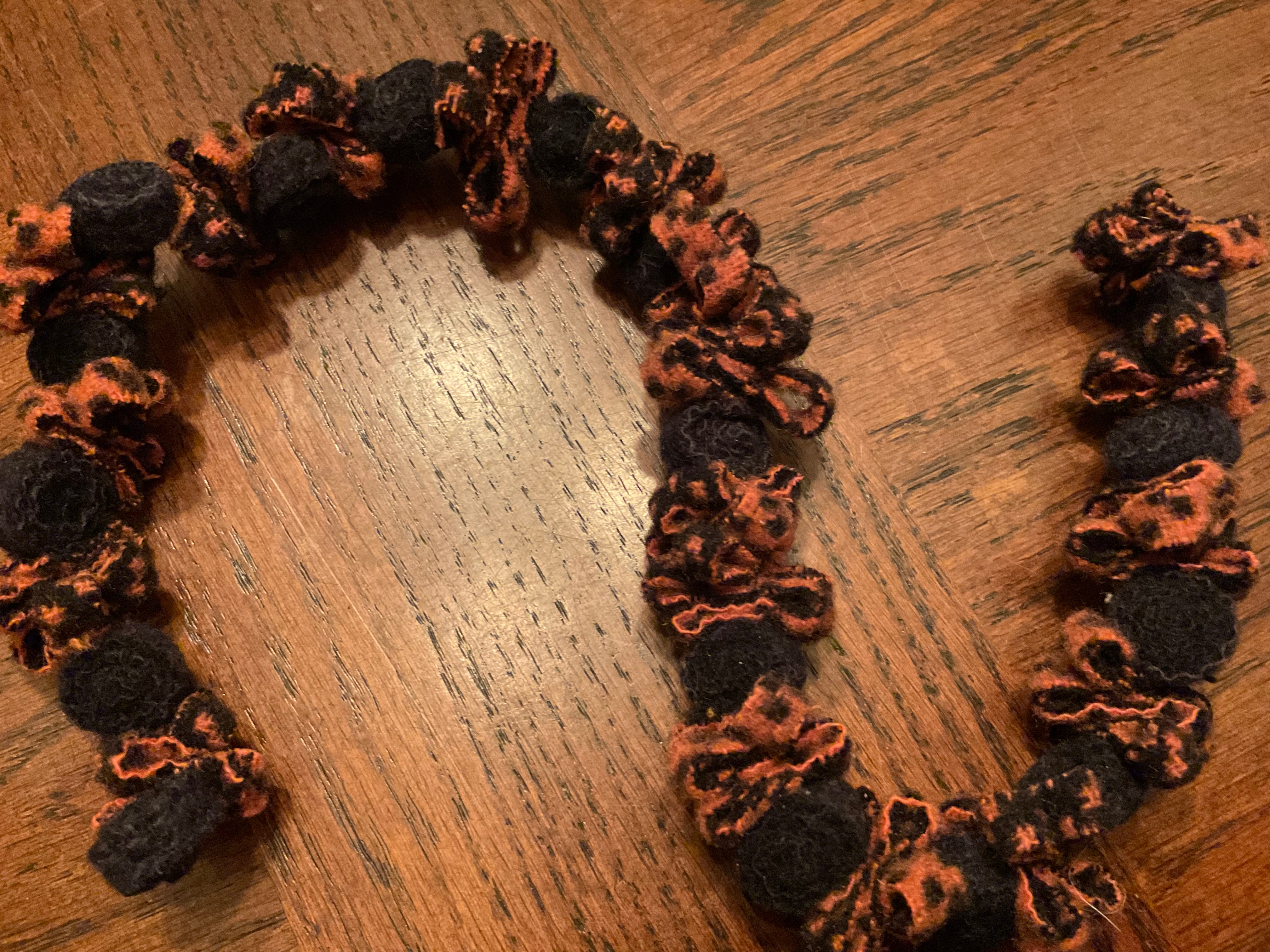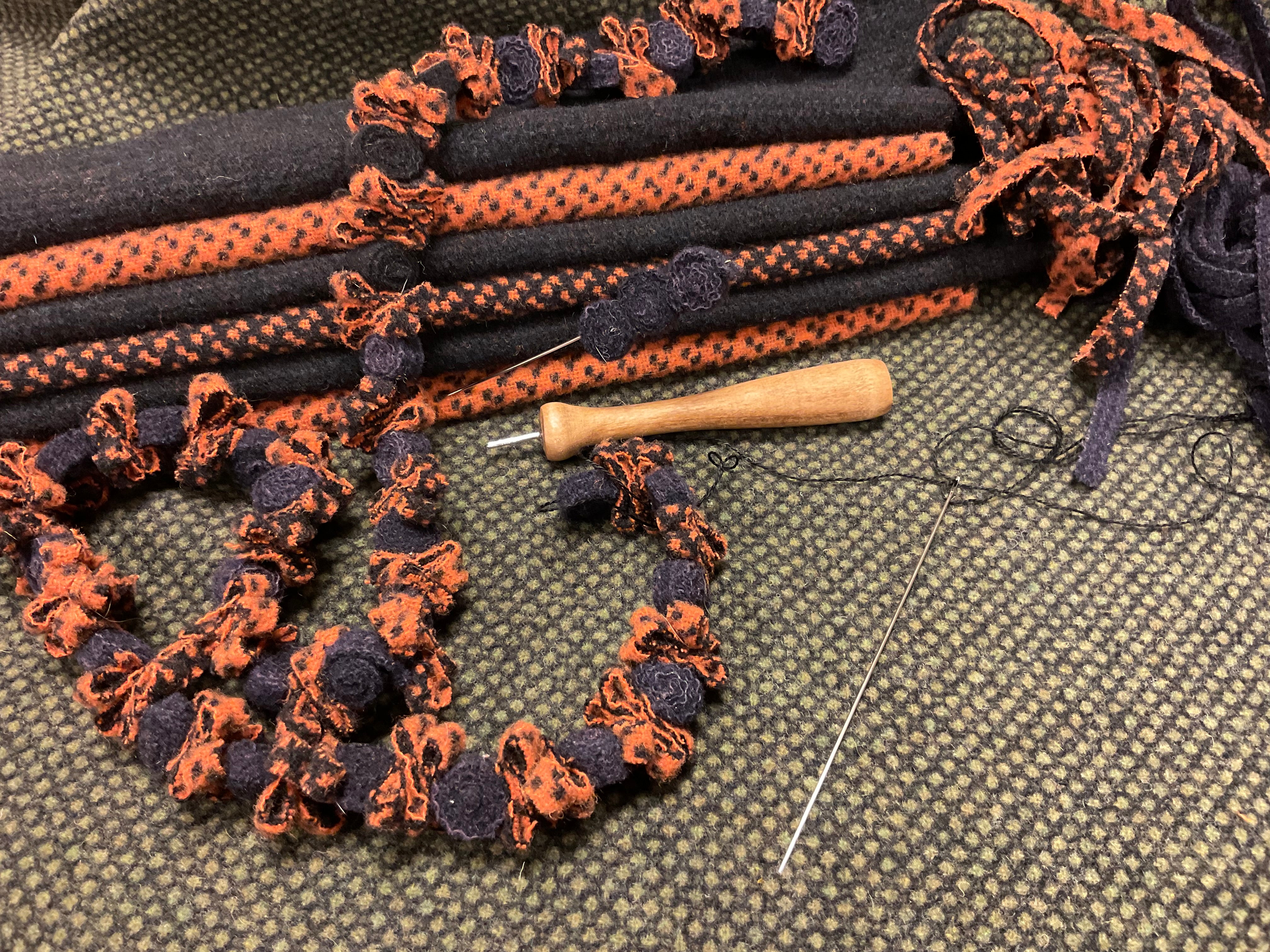We created these bundles for our popcorn garland or quillies. This one is for Halloween, But everyone wants them for stitching or hooking too. Each bundle has 6 pieces of washed wool ready to work with. The size is roughly 7x17. Each pack will make roughly 6-7 feet of popcorn style garland.