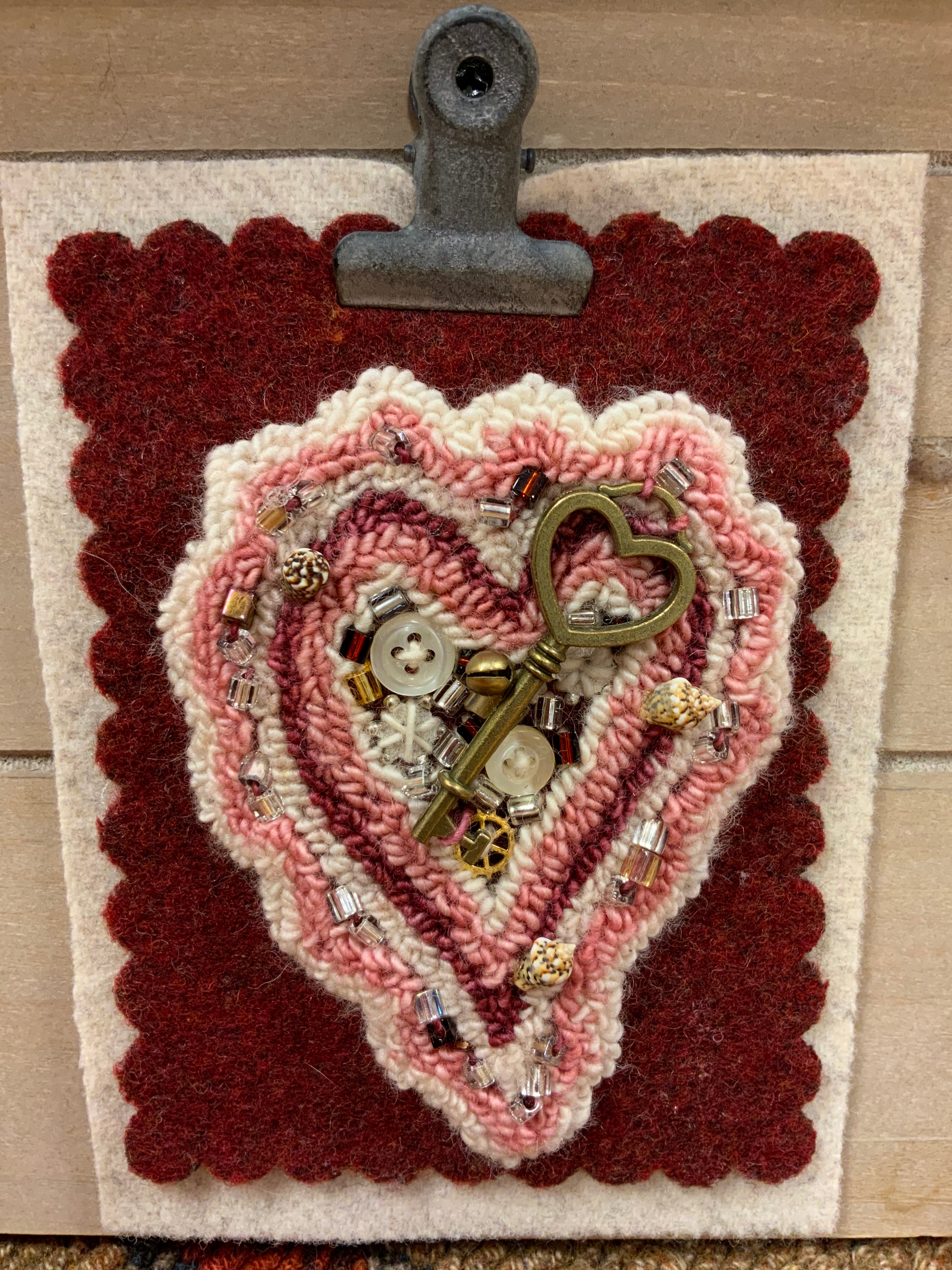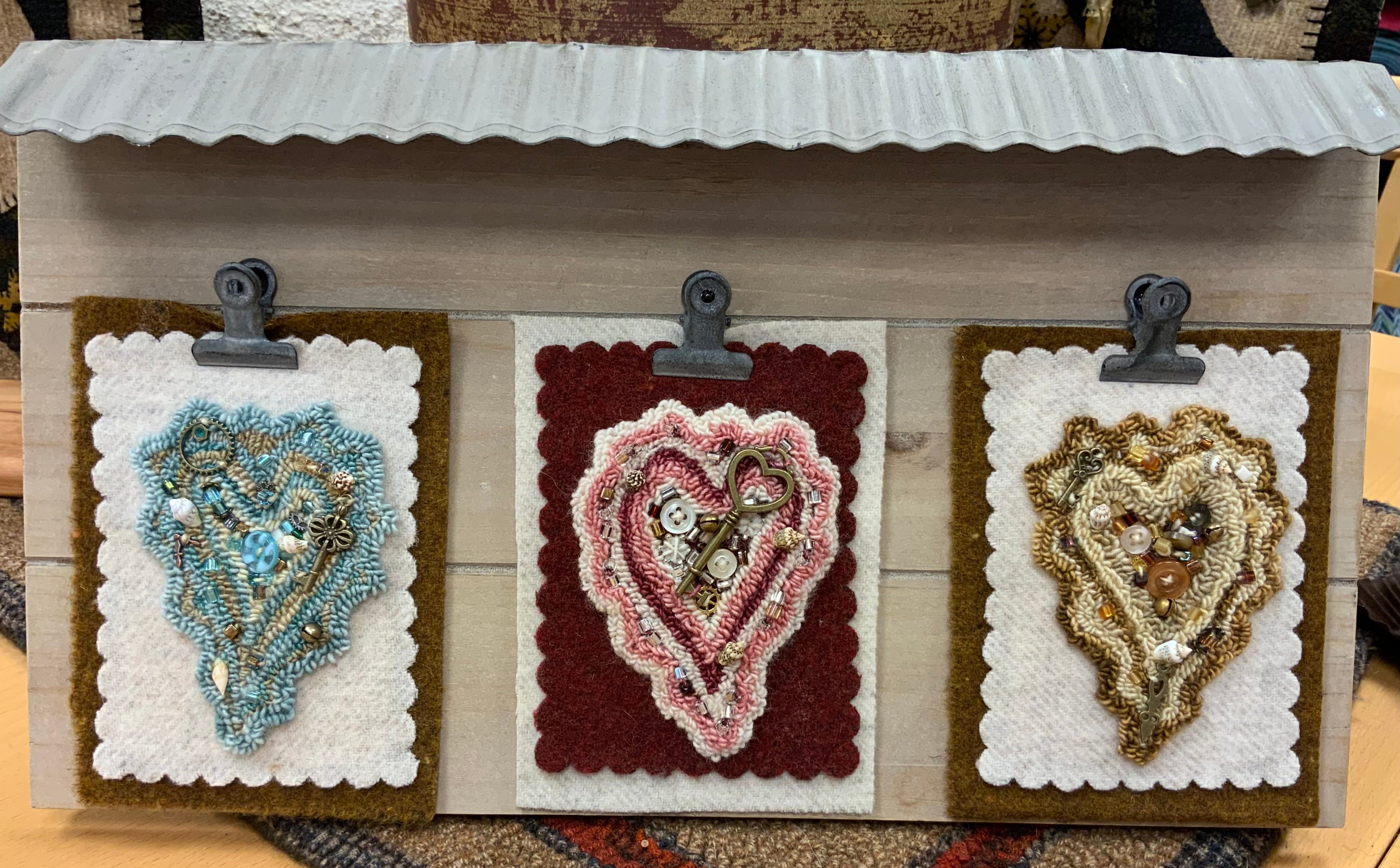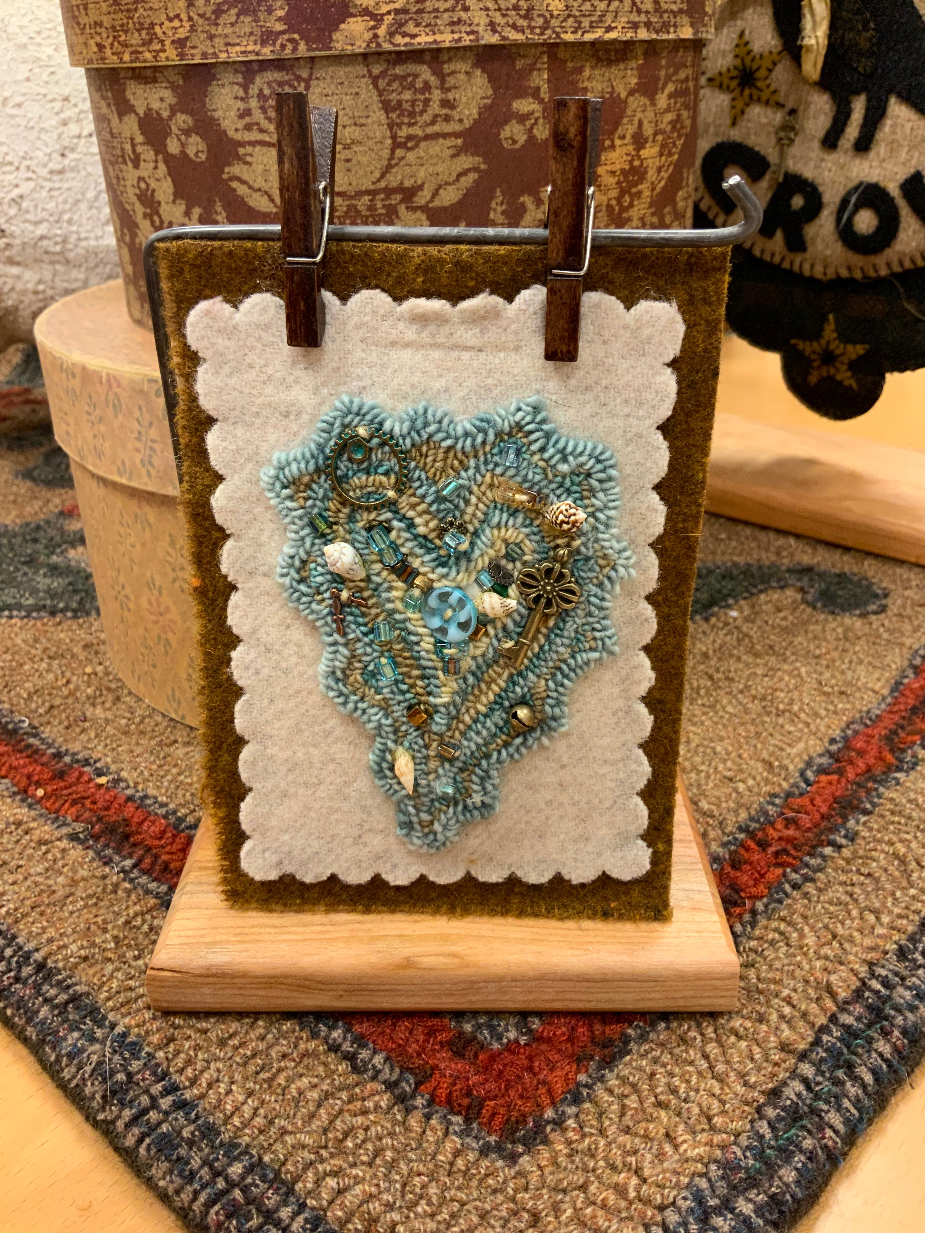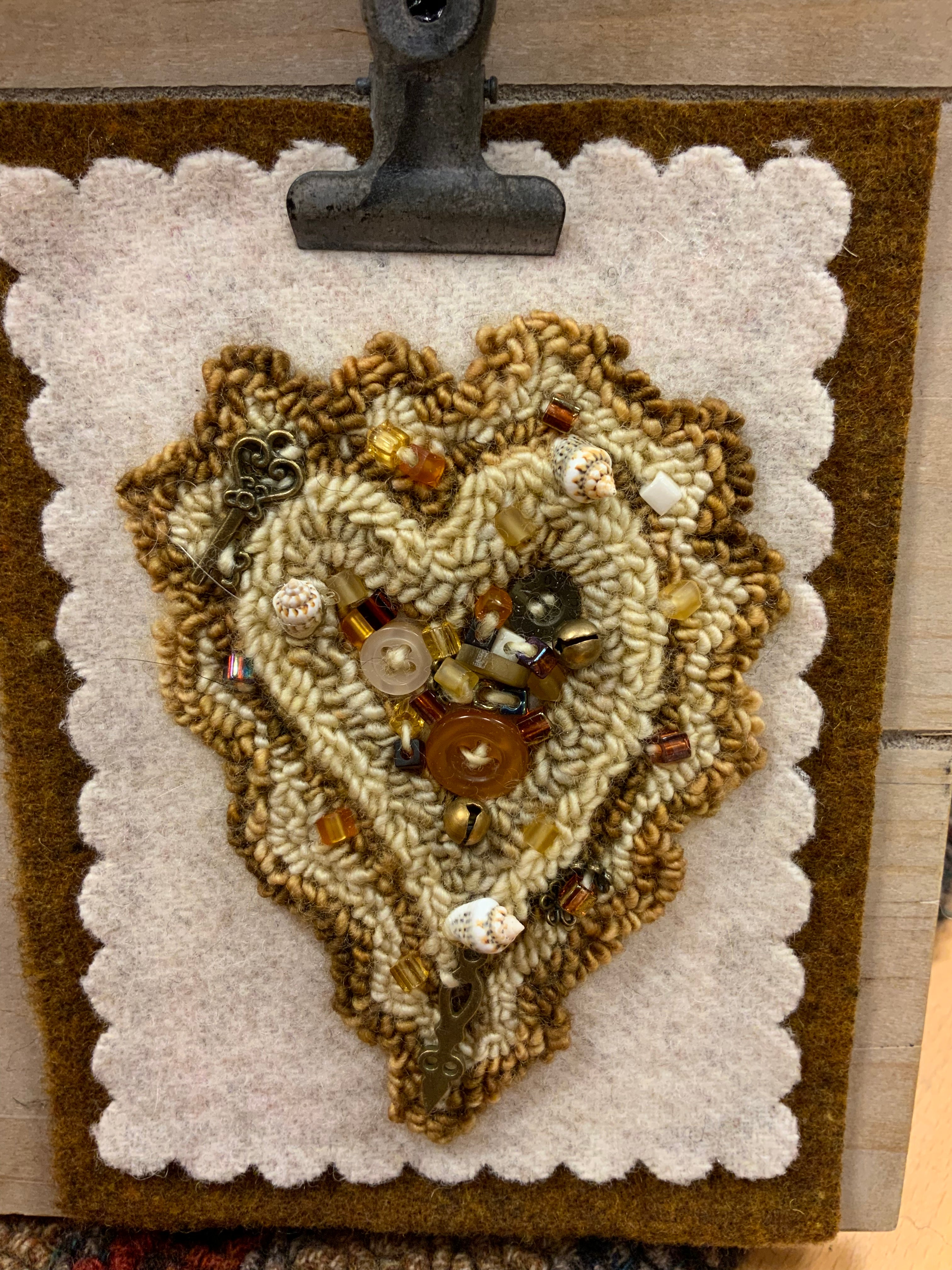 Wether you want to call it Victorian, Steam Punk, Embellished or Valentines these cute hearts are fun to punch up and decorate! You kit includes the fused pattern on wool, weavers cloth, your hand dyed merino yarns, the backing to mount it on and an assortment of embellishments that include beads, buttons, metal charms, shells and more. Your finished piece can be tucked in a card, framed, mounted in a shadow box or hung on our small banner hanger.
