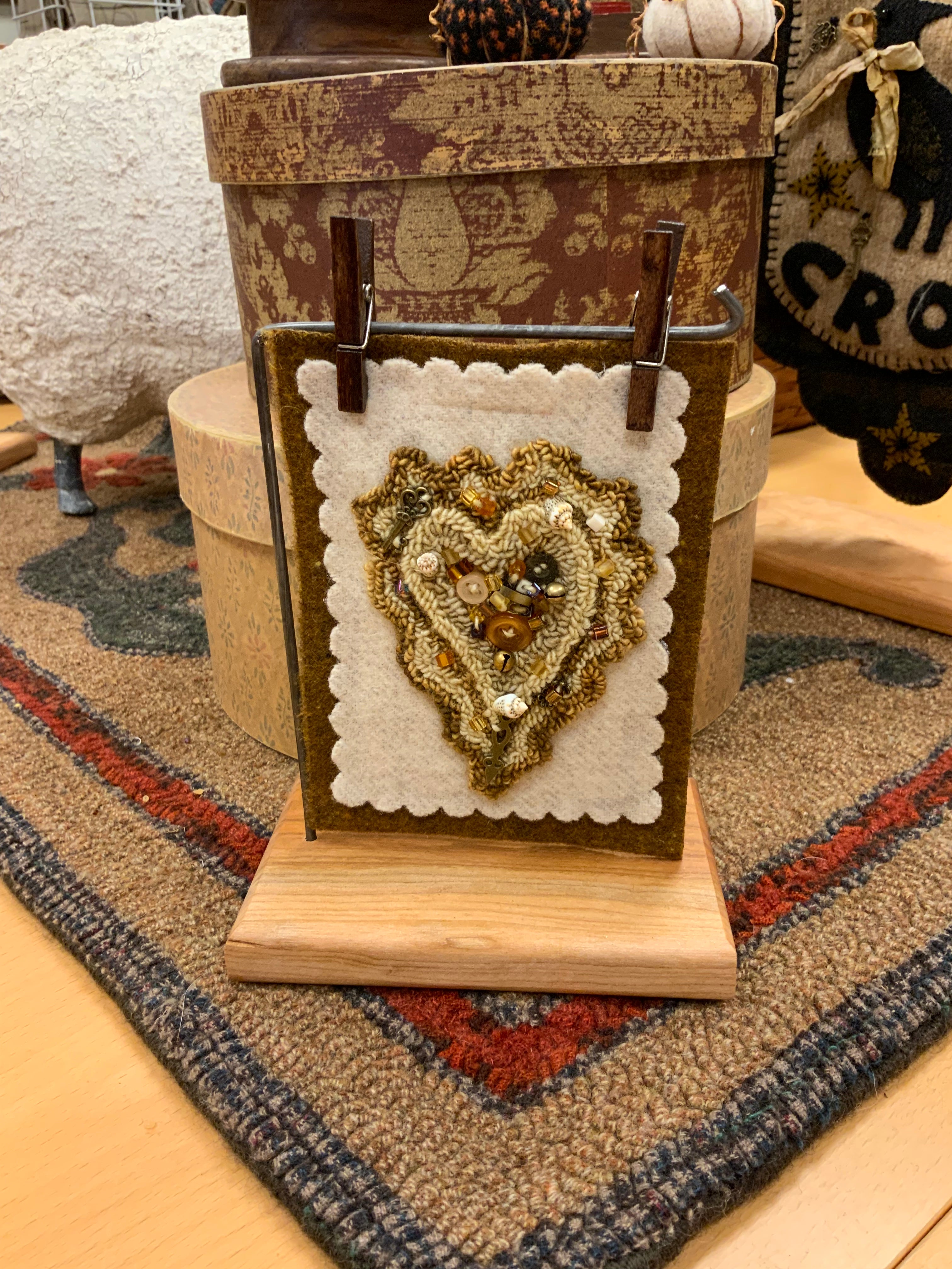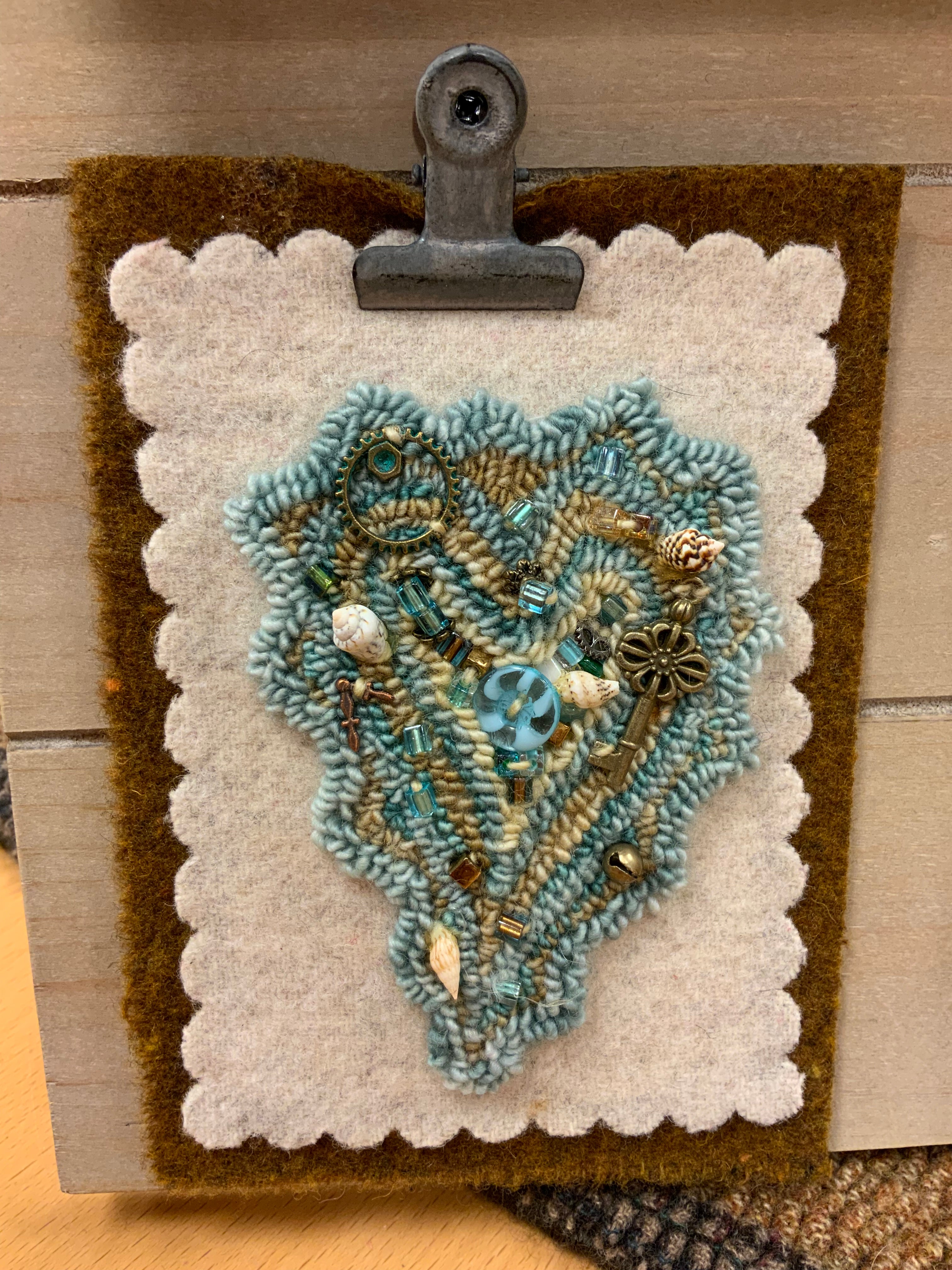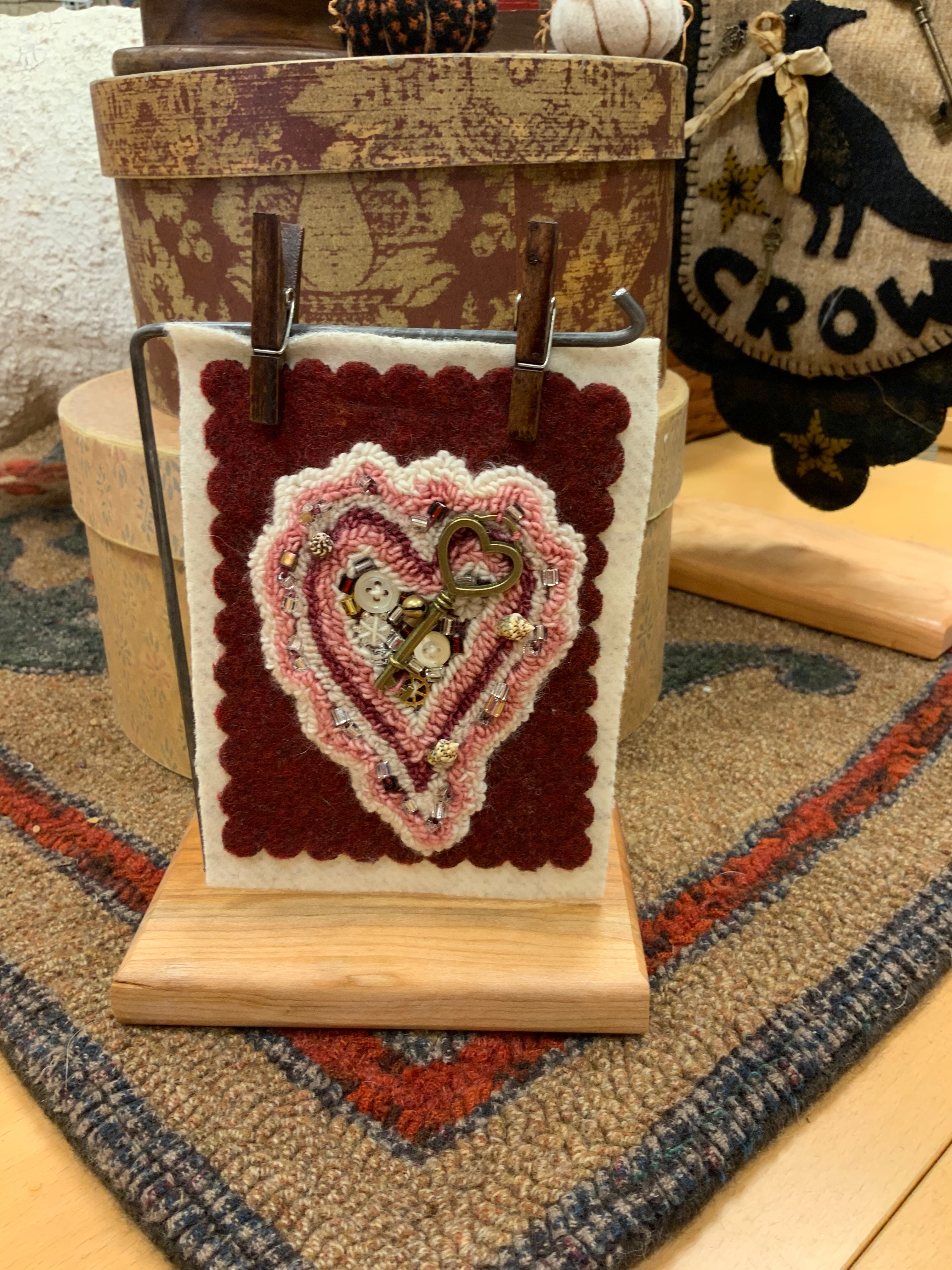 Wether you want to call it Victorian, Steam Punk, Embellished or Valentines these cute hearts are fun to punch up and decorate! You kit includes the fused pattern on wool, weavers cloth, your hand dyed merino yarns, the backing to mount it on and an assortment of embellishments that include beads, buttons, metal charms, shells and more. Your finished piece can be tucked in a card, framed, mounted in a shadow box or hung on our small banner hanger.