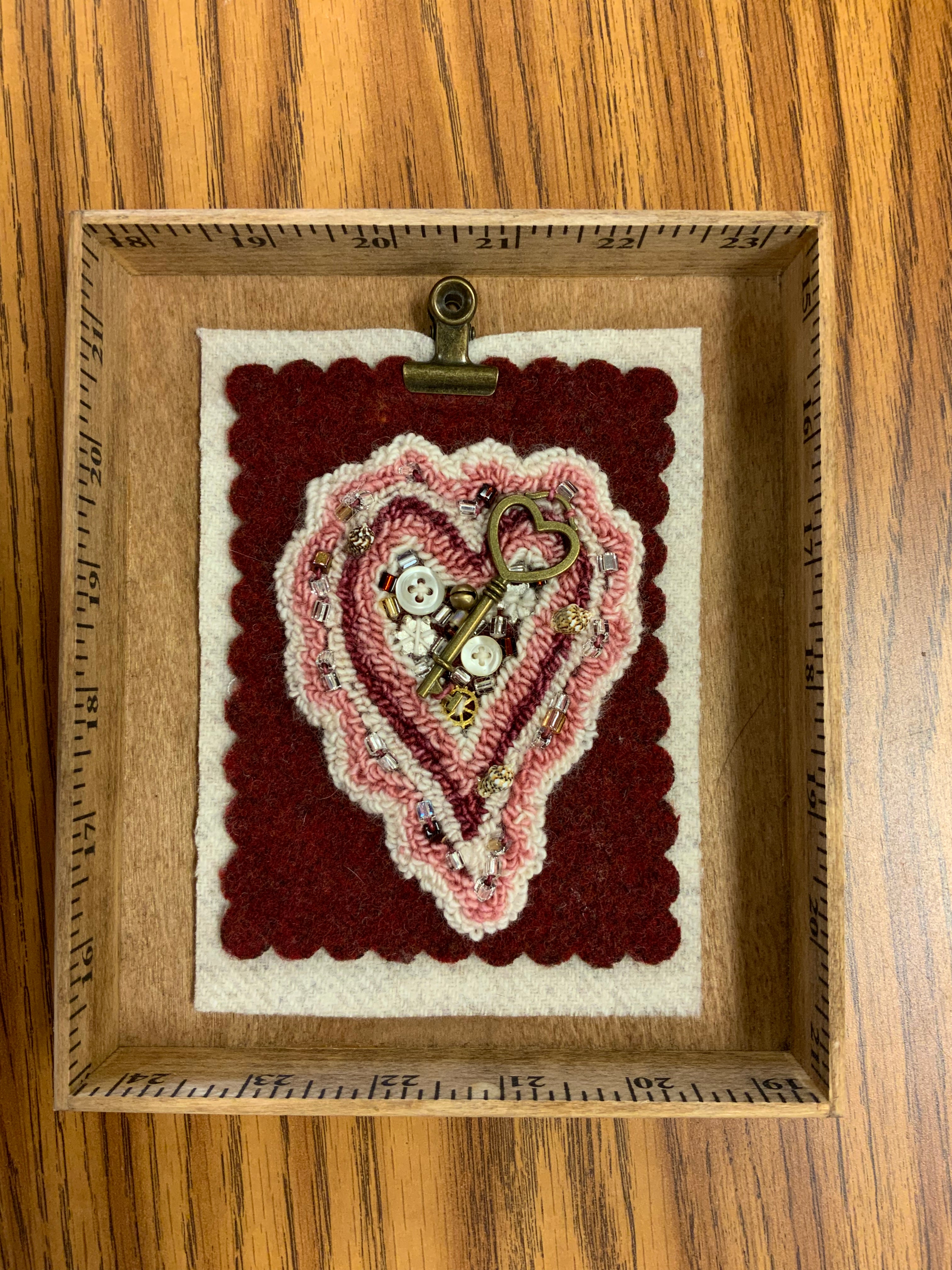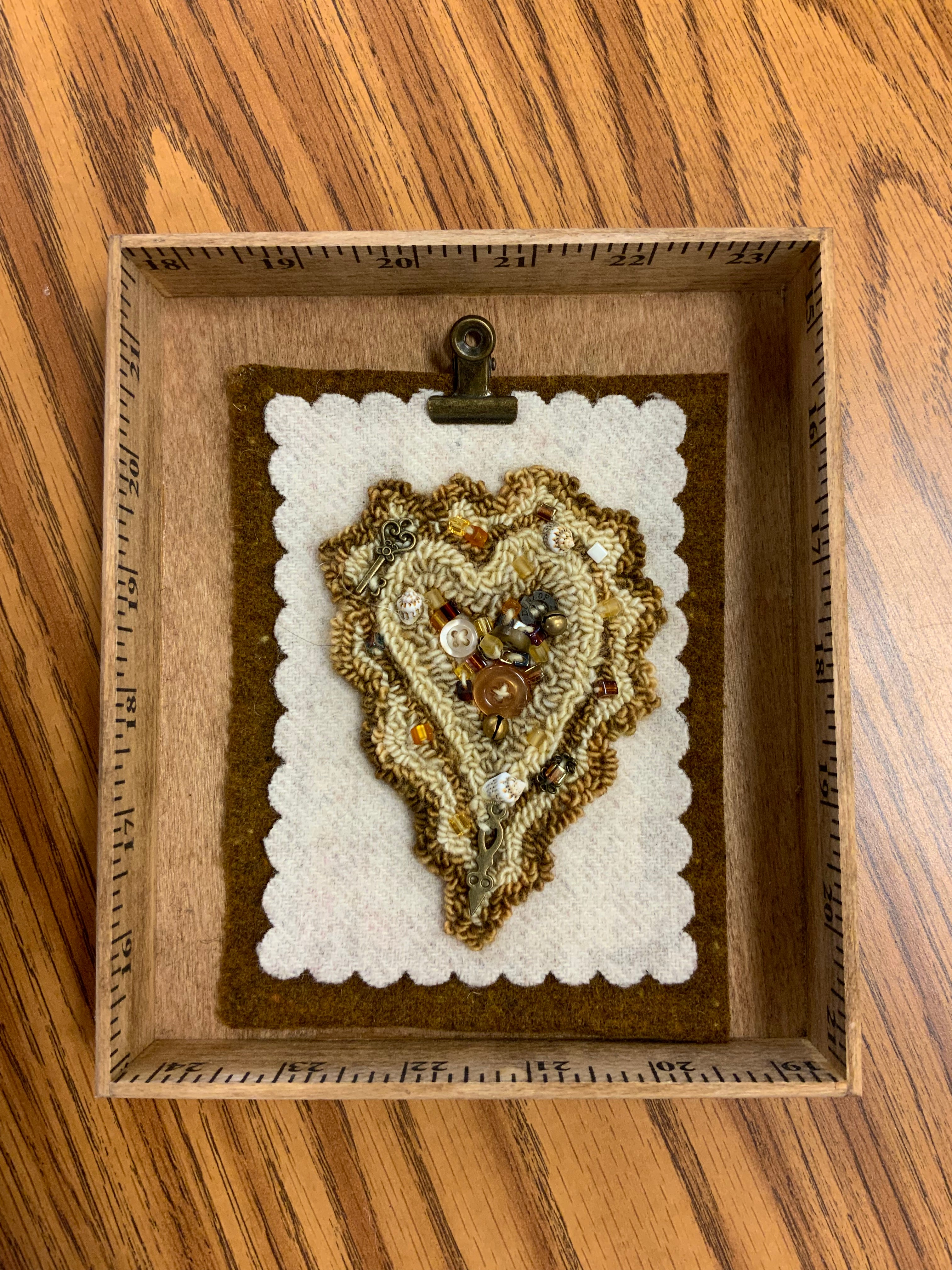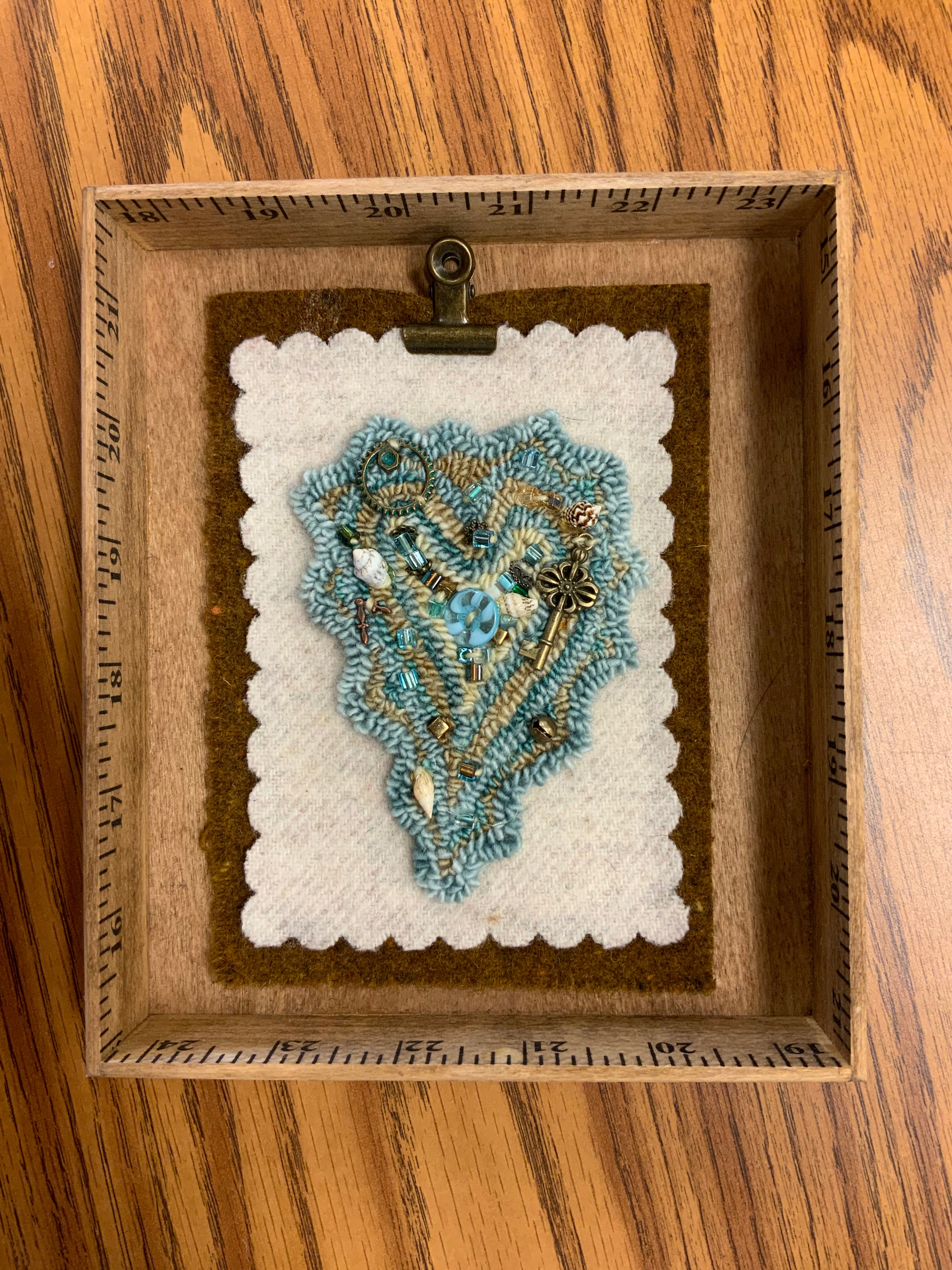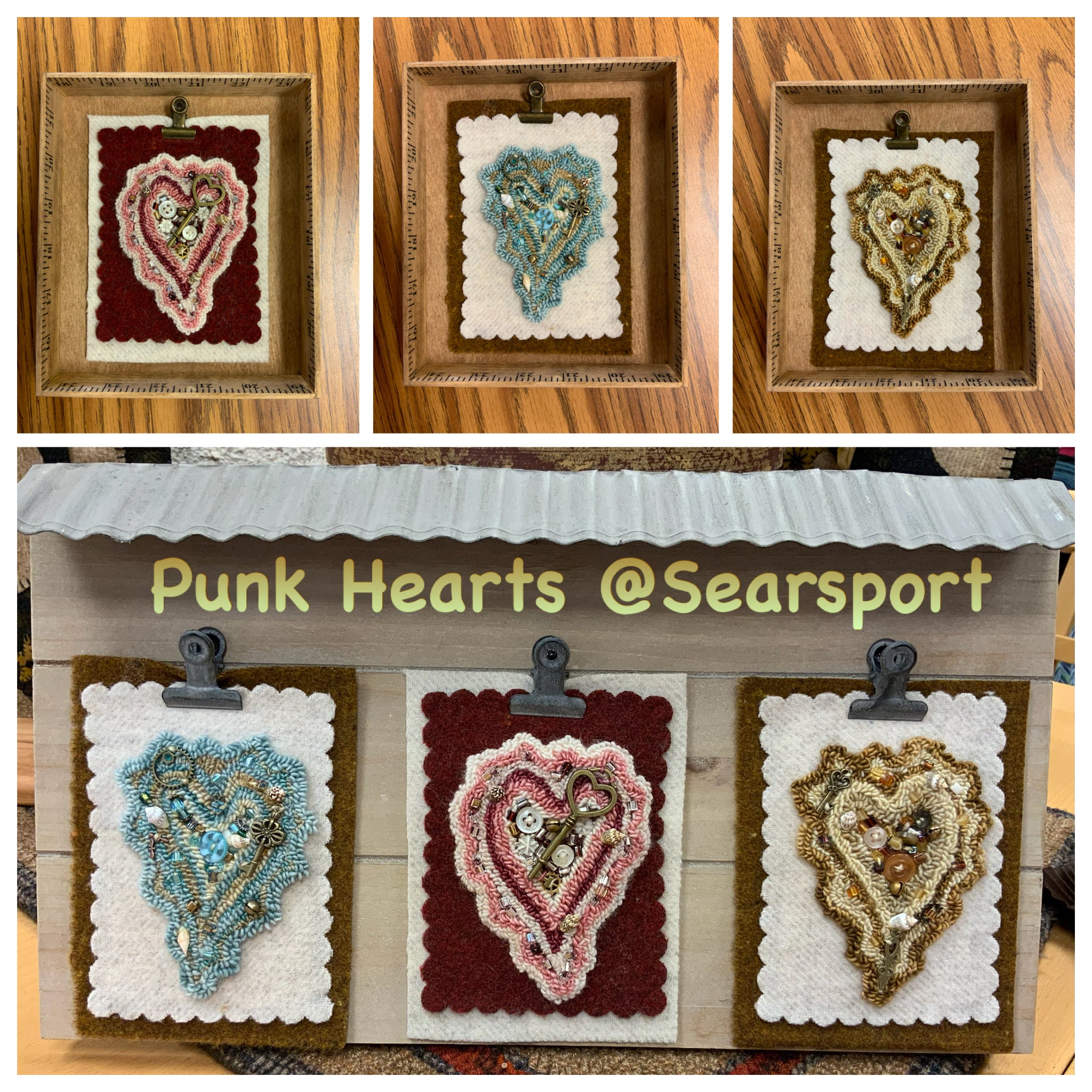 Wether you want to call it Victorian, Steam Punk, Embellished or Valentines these cute hearts are fun to punch up and decorate! You kit includes the fused pattern on wool, weavers cloth, your hand dyed merino yarns, the backing to mount it on and an assortment of embellishments that include beads, buttons, metal charms, shells and more. Your finished piece can be tucked in a card, framed, mounted in a shadow box or hung on our small banner hanger.