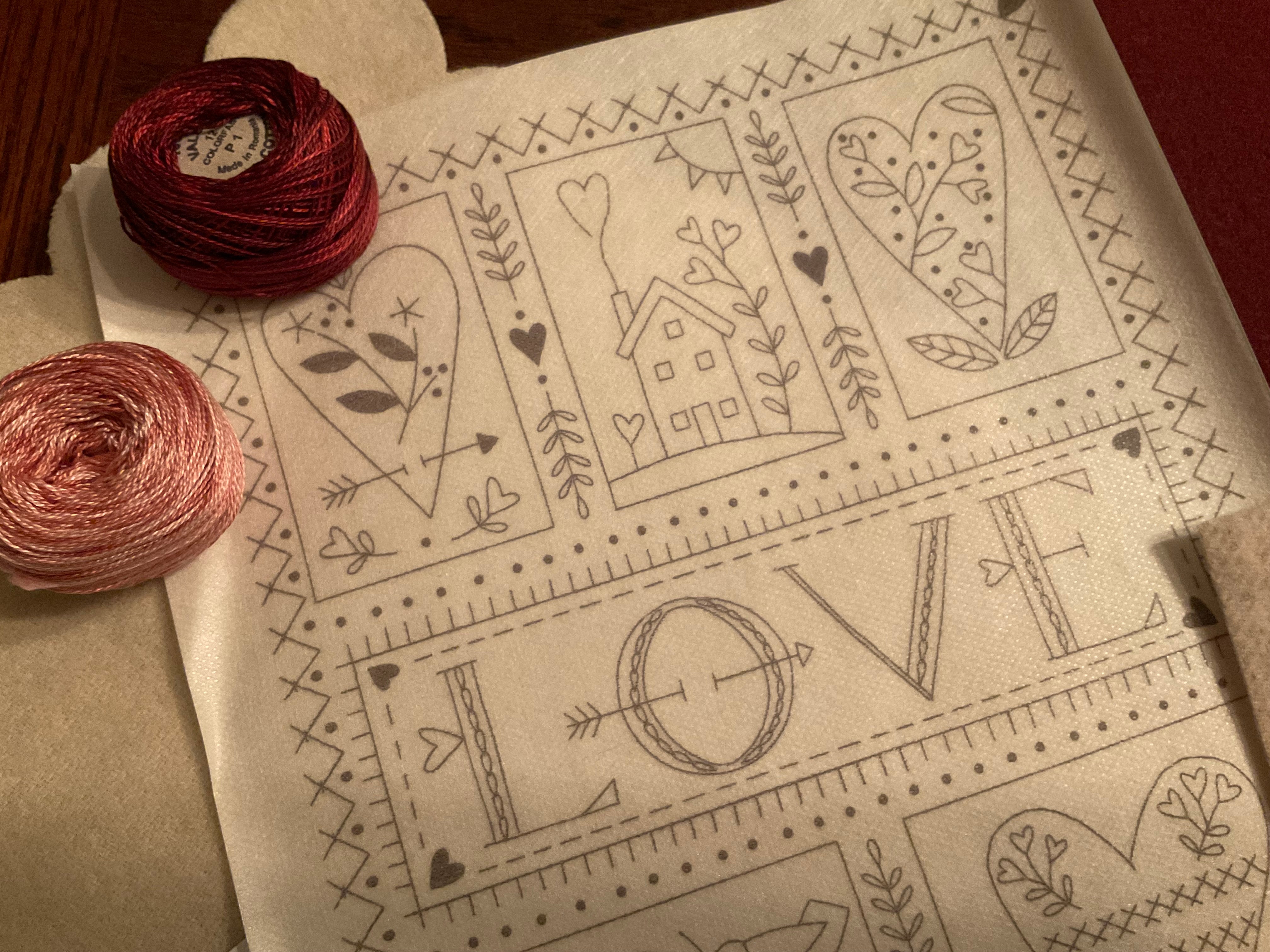 When you receive your order it will have the pattern and the pre printed sheet. You simply peel off the paper backing and press on the fabric of your choice for stitching. Weavers cloth, flannel, wool anything works great! Flannel is our favorite to use though.