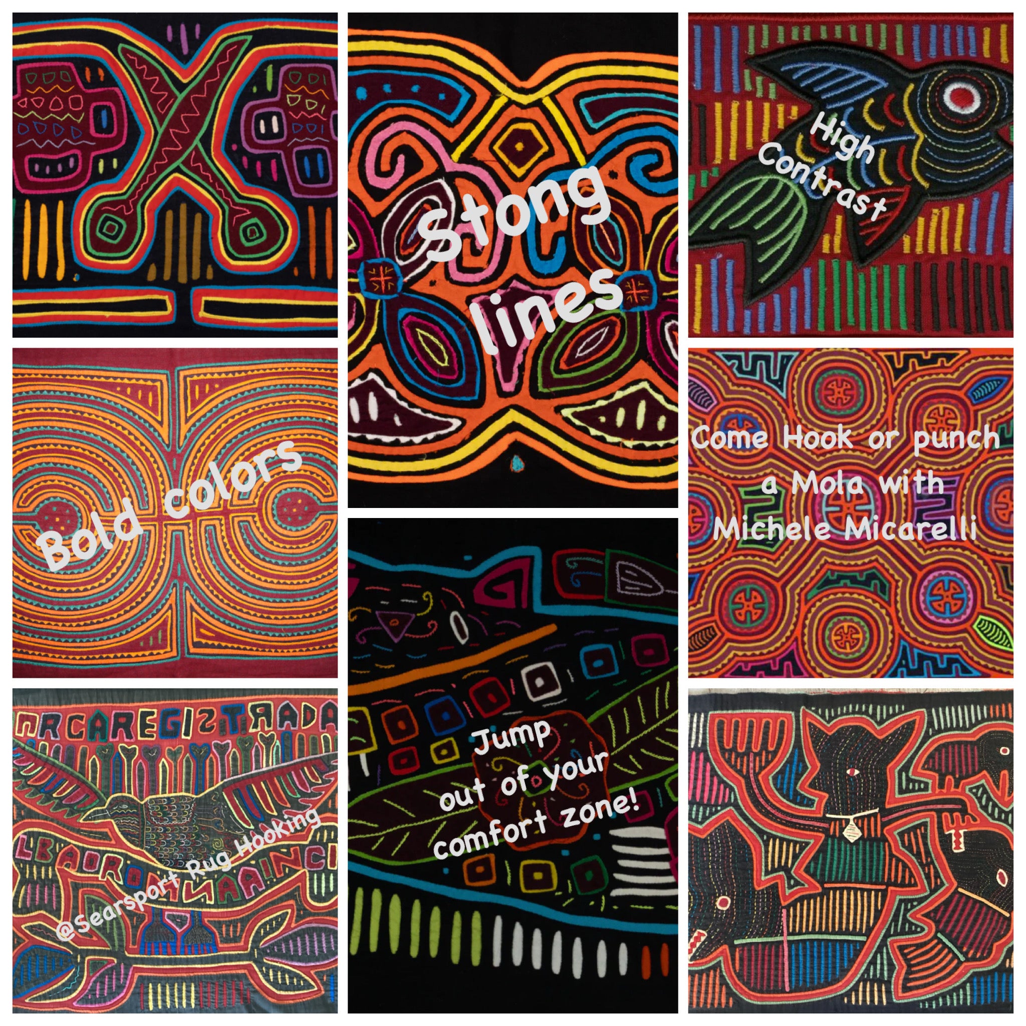 Please note the pictures are representative of the Molas style of quilting. We will be hooking patterns designed by Michele for the class or a custom design for you!