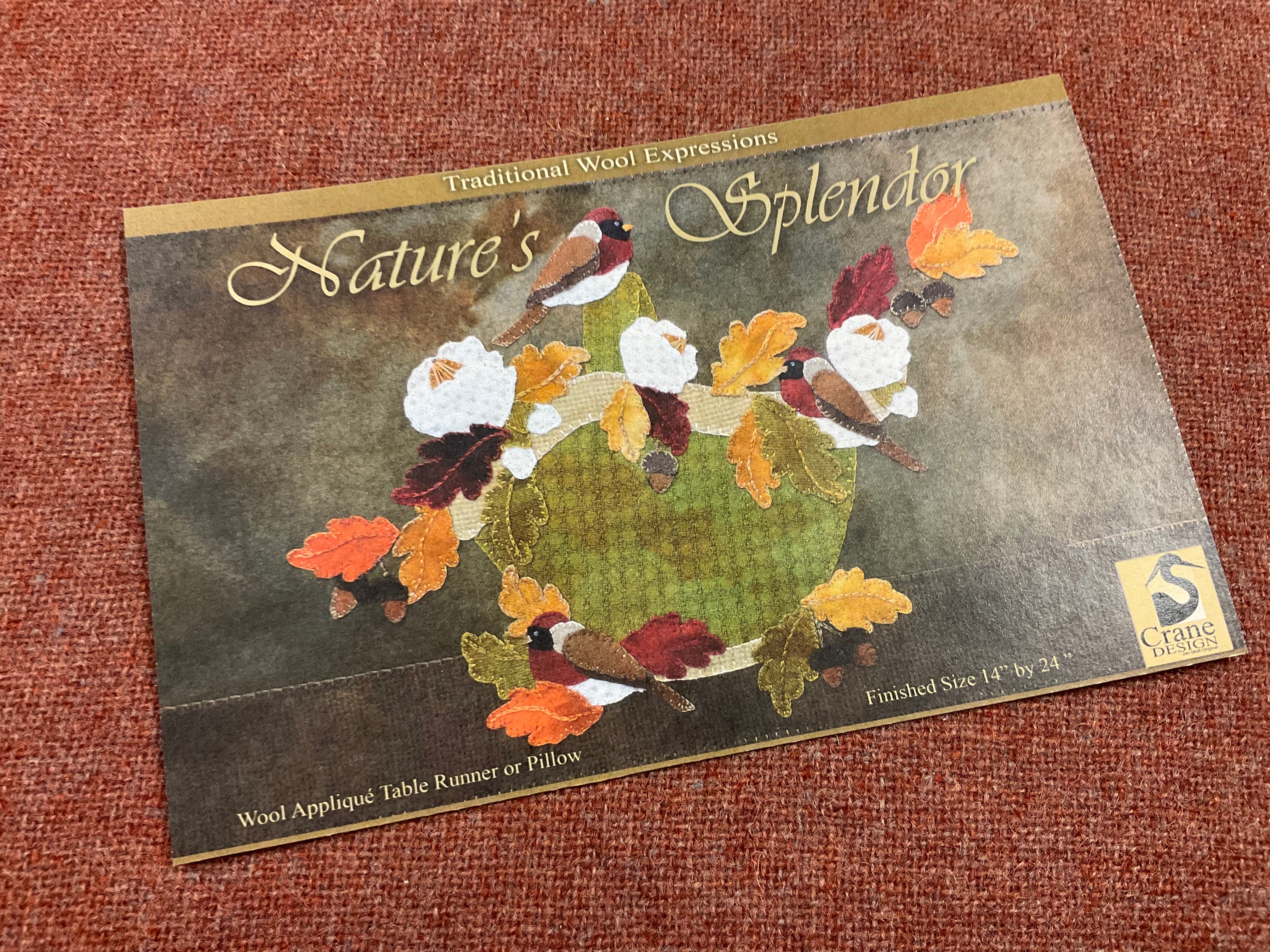 Natures Splendor, combines the beauty of fall and little song birds. It was created using deep and rich fall textured and hand dyed wools to welcome in the season. It measures 14" by 24". This versatile piece can be used as a wall-hanging or decorative pillow. The pattern comes with easy to follow instructions and step by step illustrations.