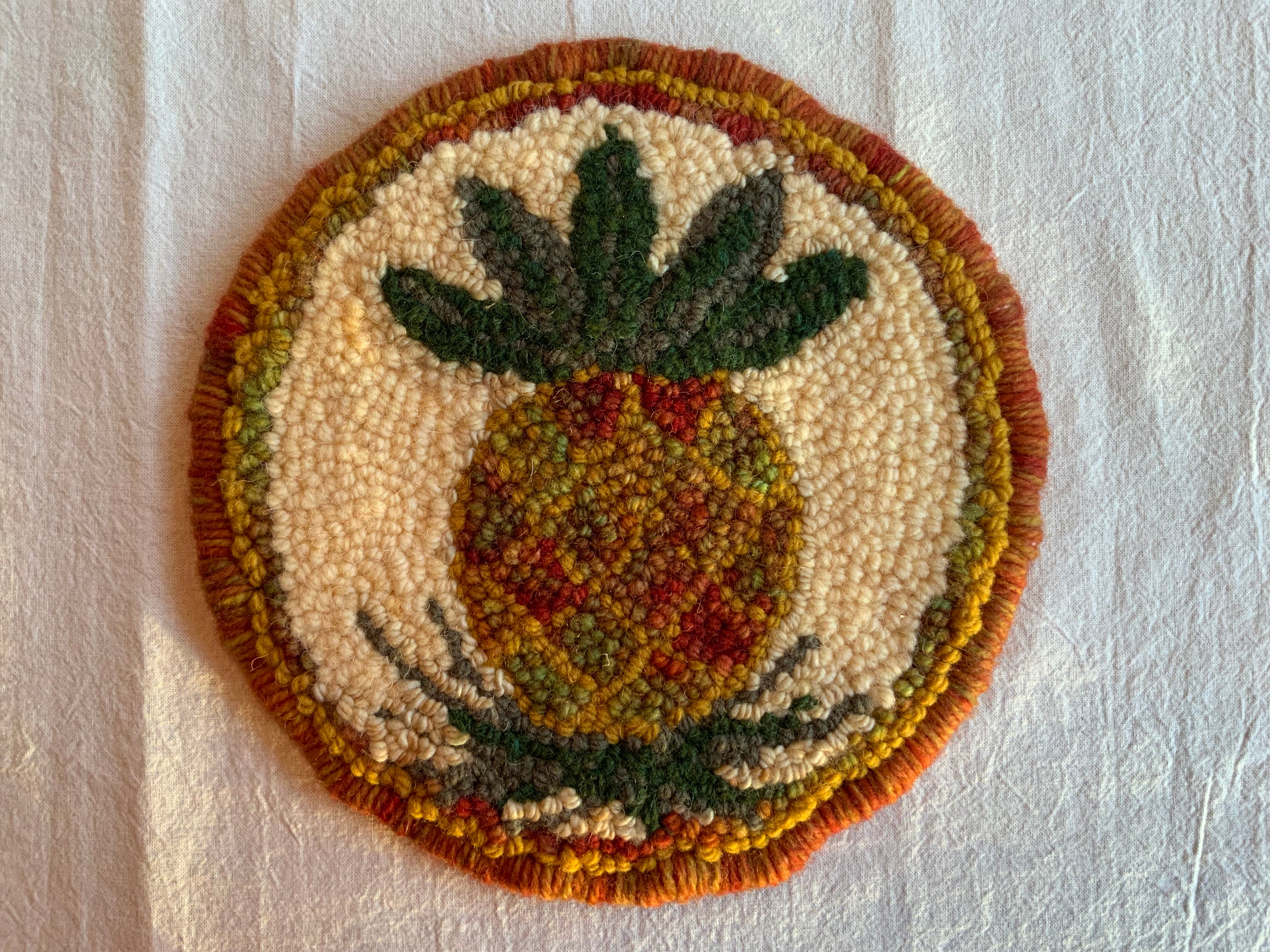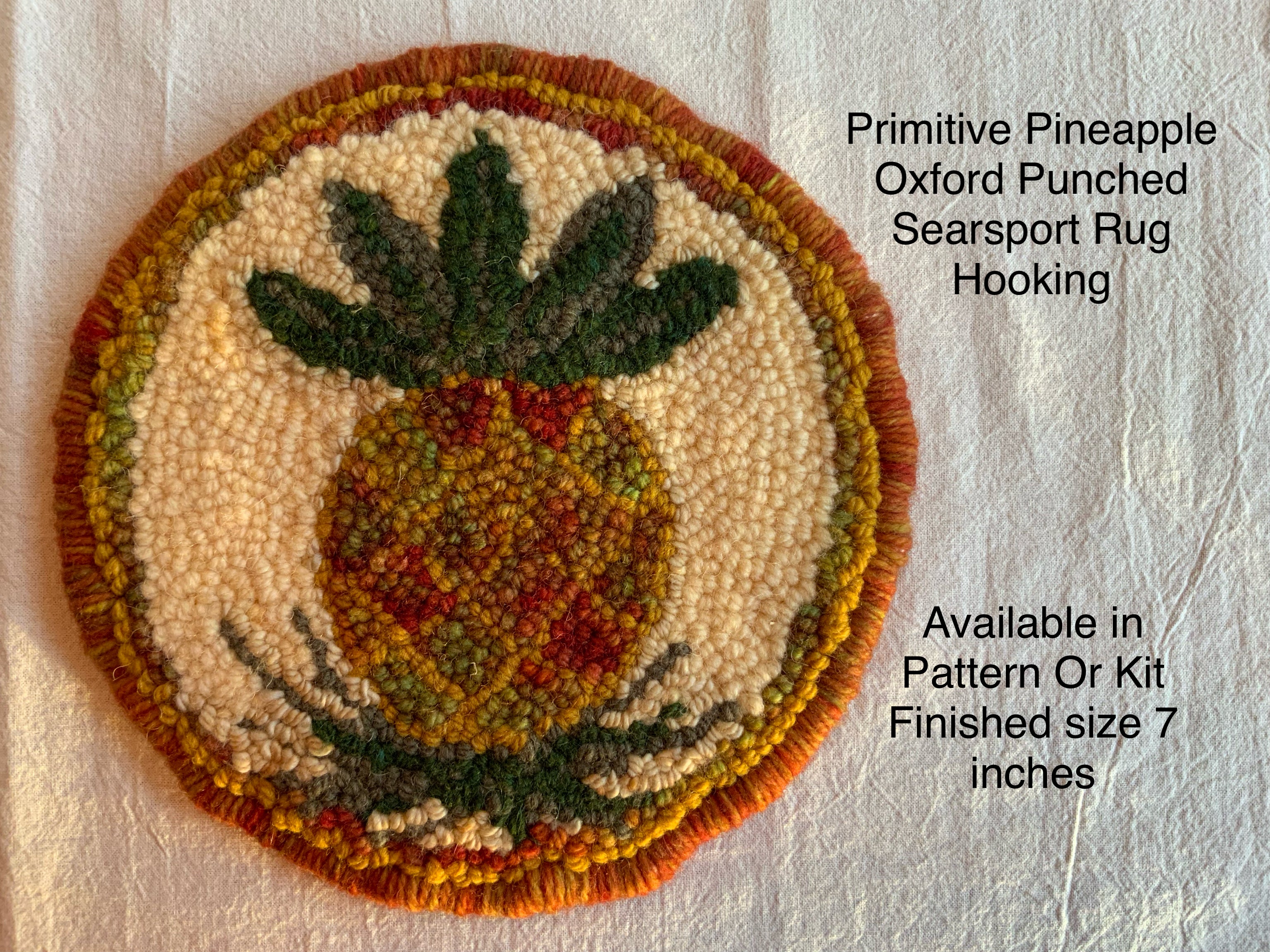 These sweet beginner kits are perfect to lean how to use the Oxford punch needle. It is a hand drawn pattern in a 7 inch circle on our monks cloth and you can order just the pattern to use your own yarns or wool strips or order the full kit with the yarn.