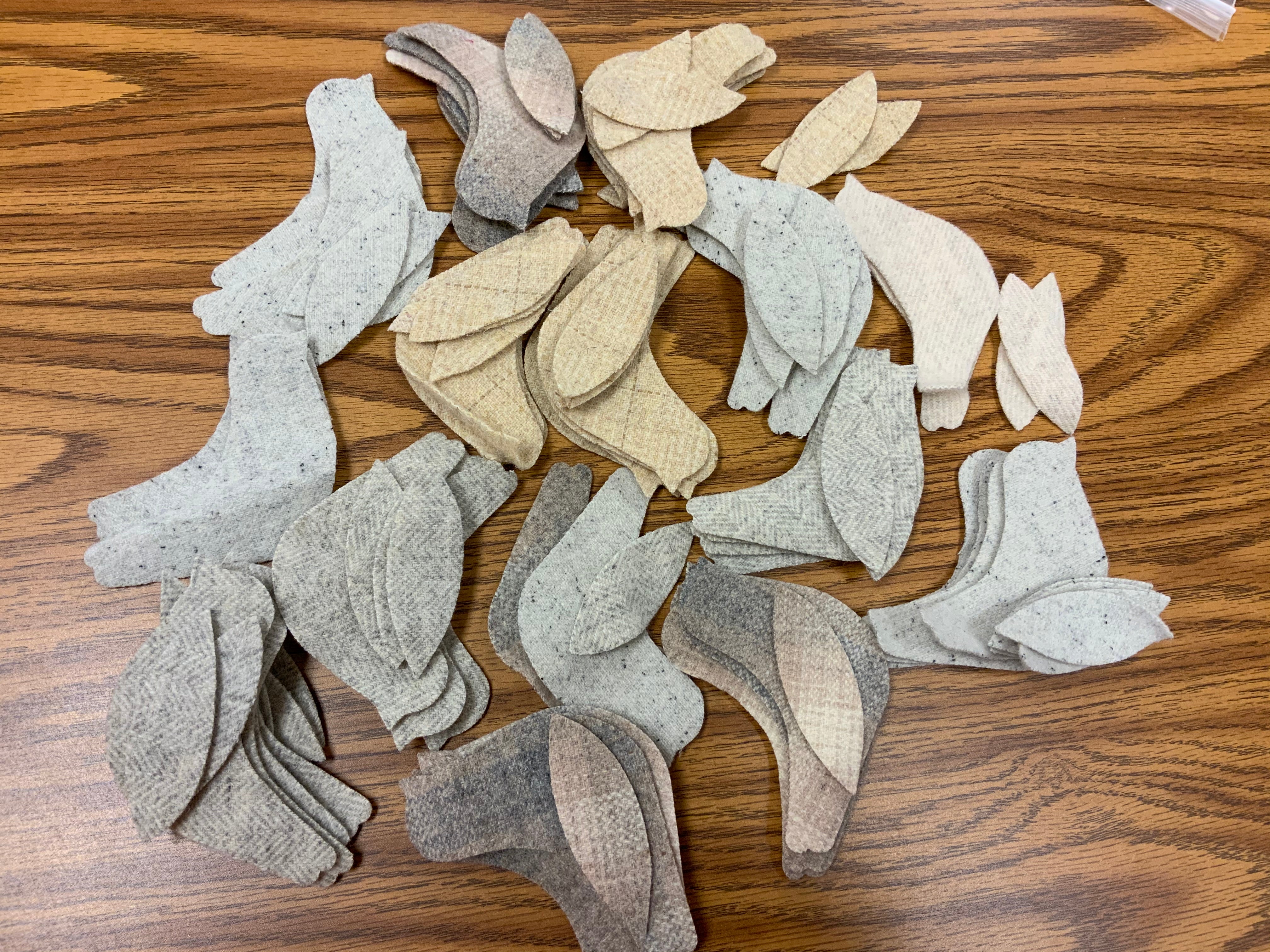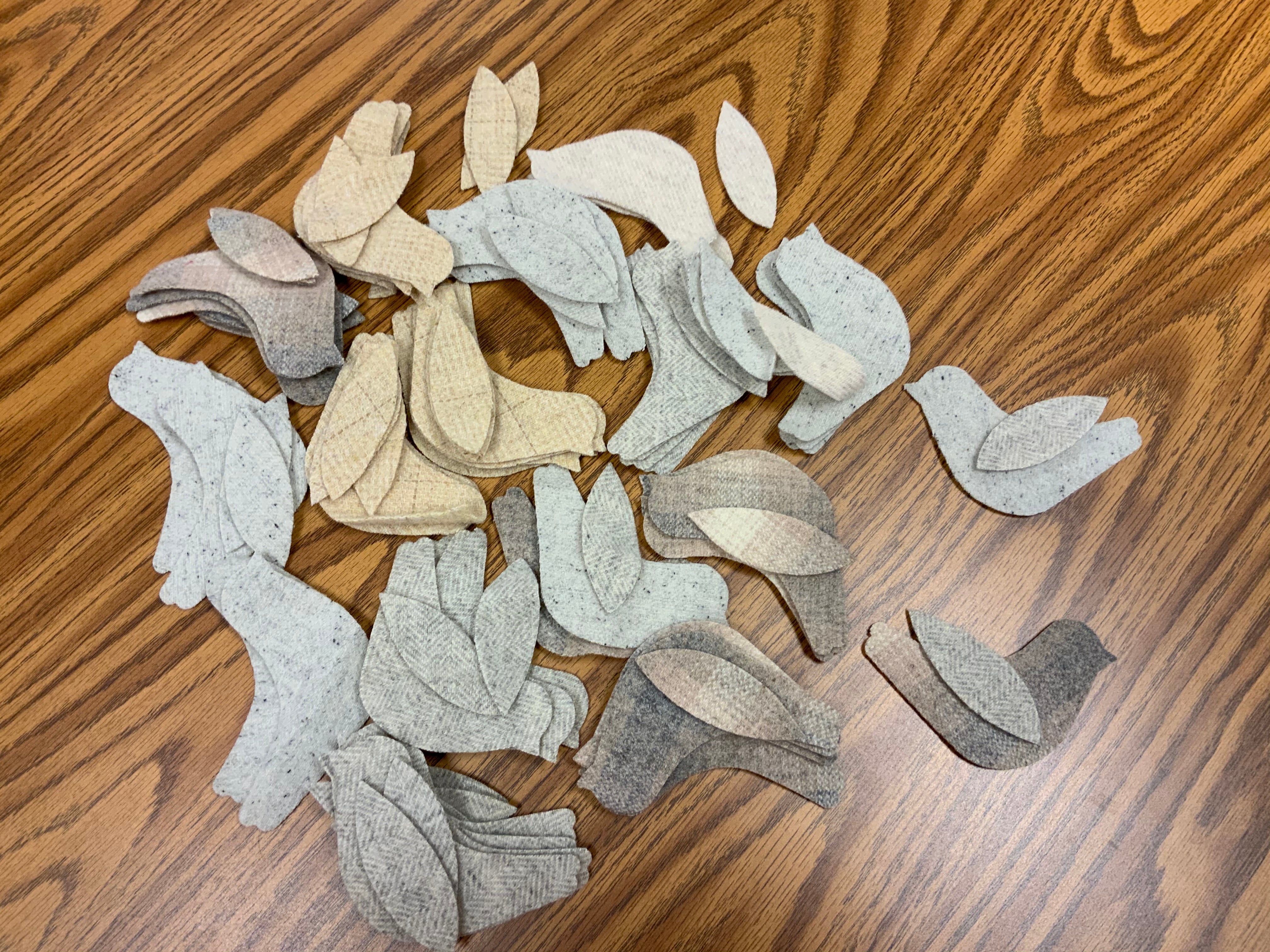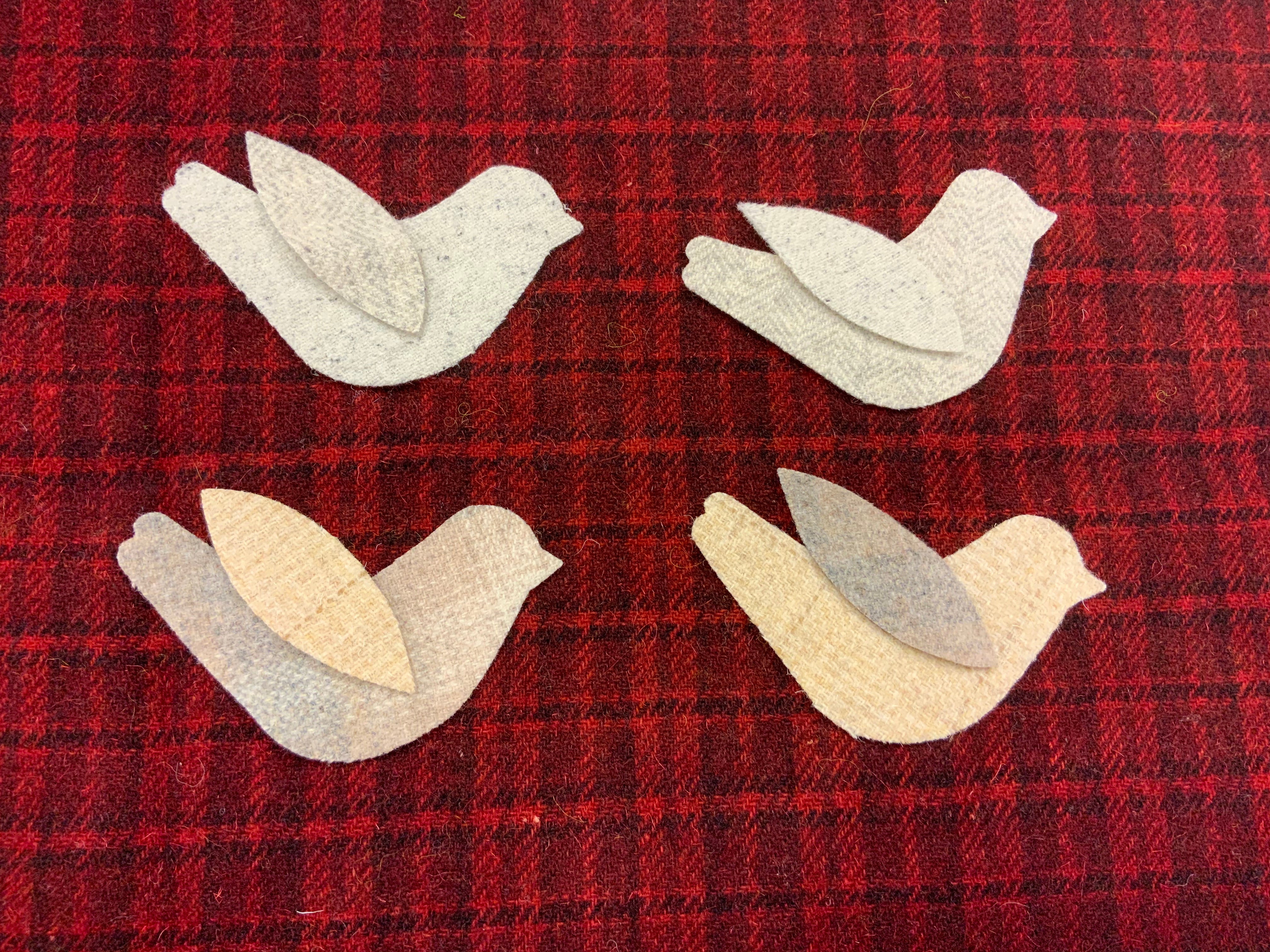 Pre cut doves with wings. Our dove is 4.25 inches long and we cut them out of assorted wools to add variety. You will receive 4 doves and 4 wings.