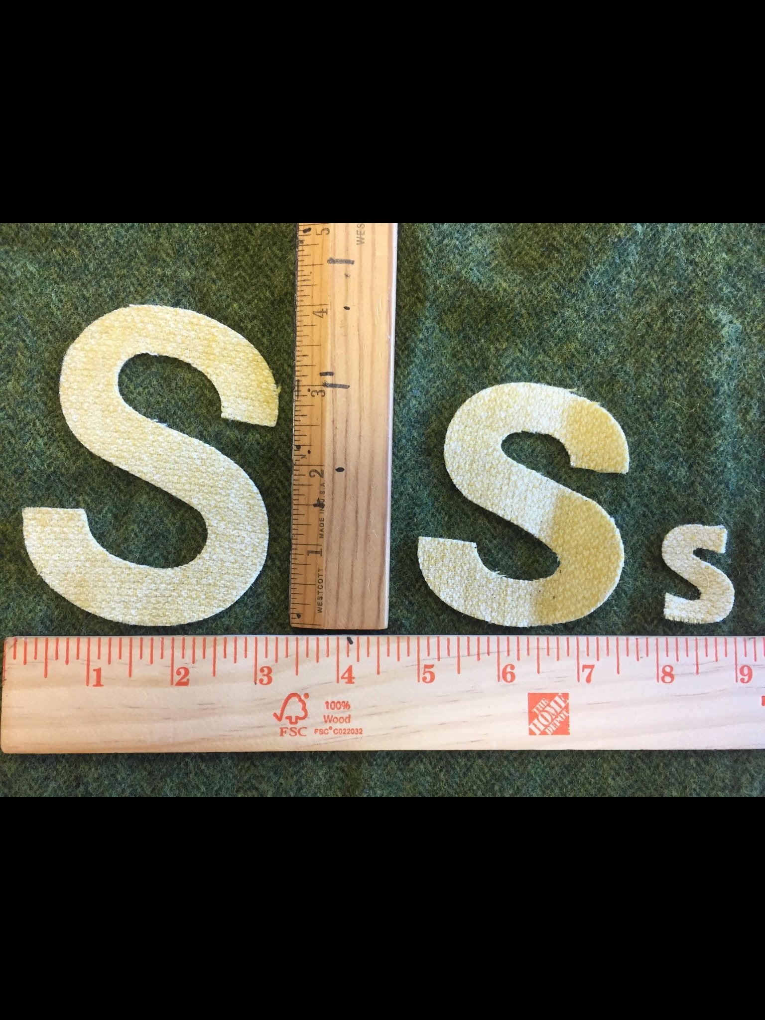 4 in upper, lower, numbers and 1.25 inch block letters, both upper case or lower case are available in any colors. You just check out with the number of letters you need then just message, email or call us for the specific colors you are looking for. Refer to our bolt wool to pick colors.