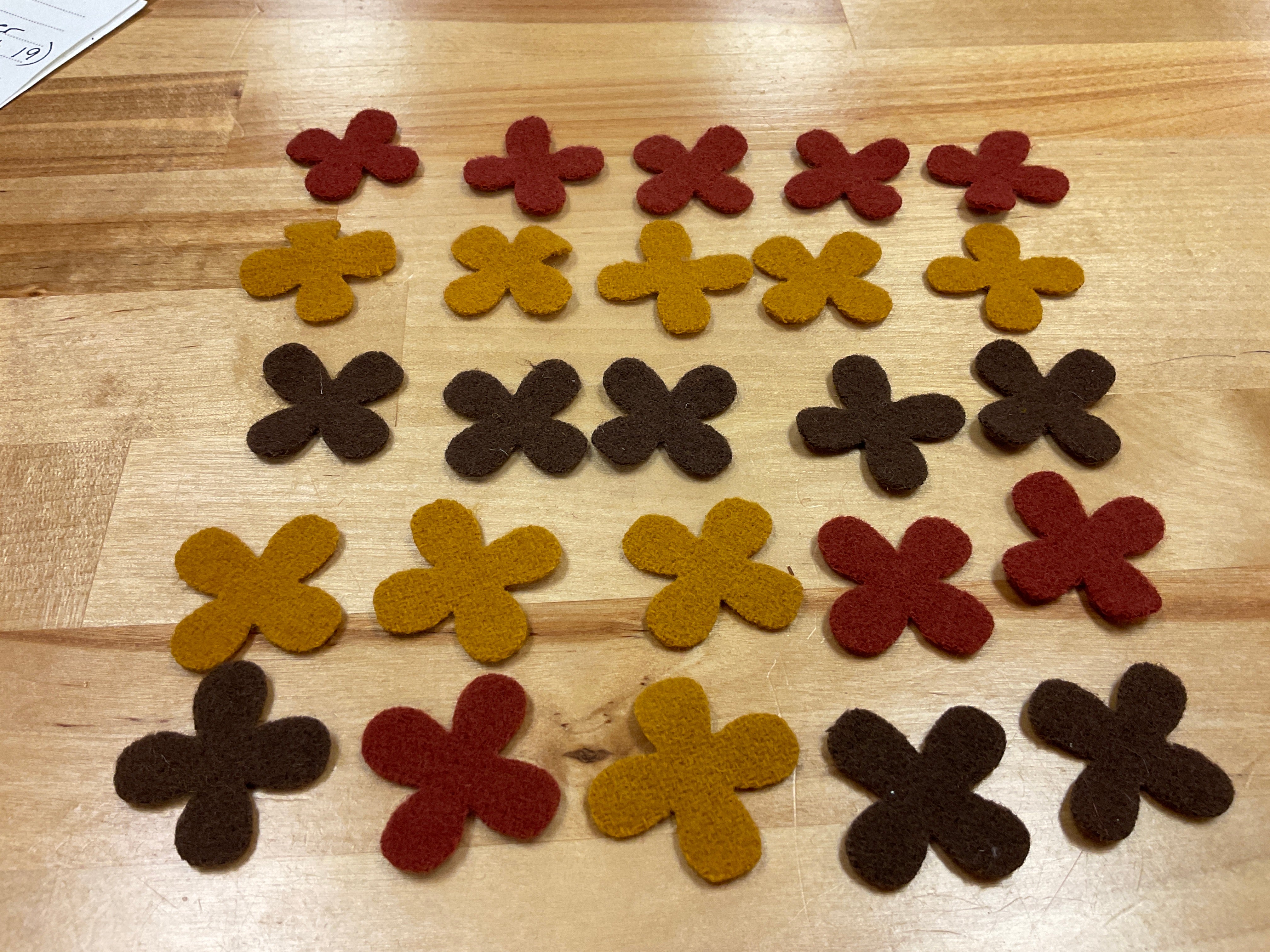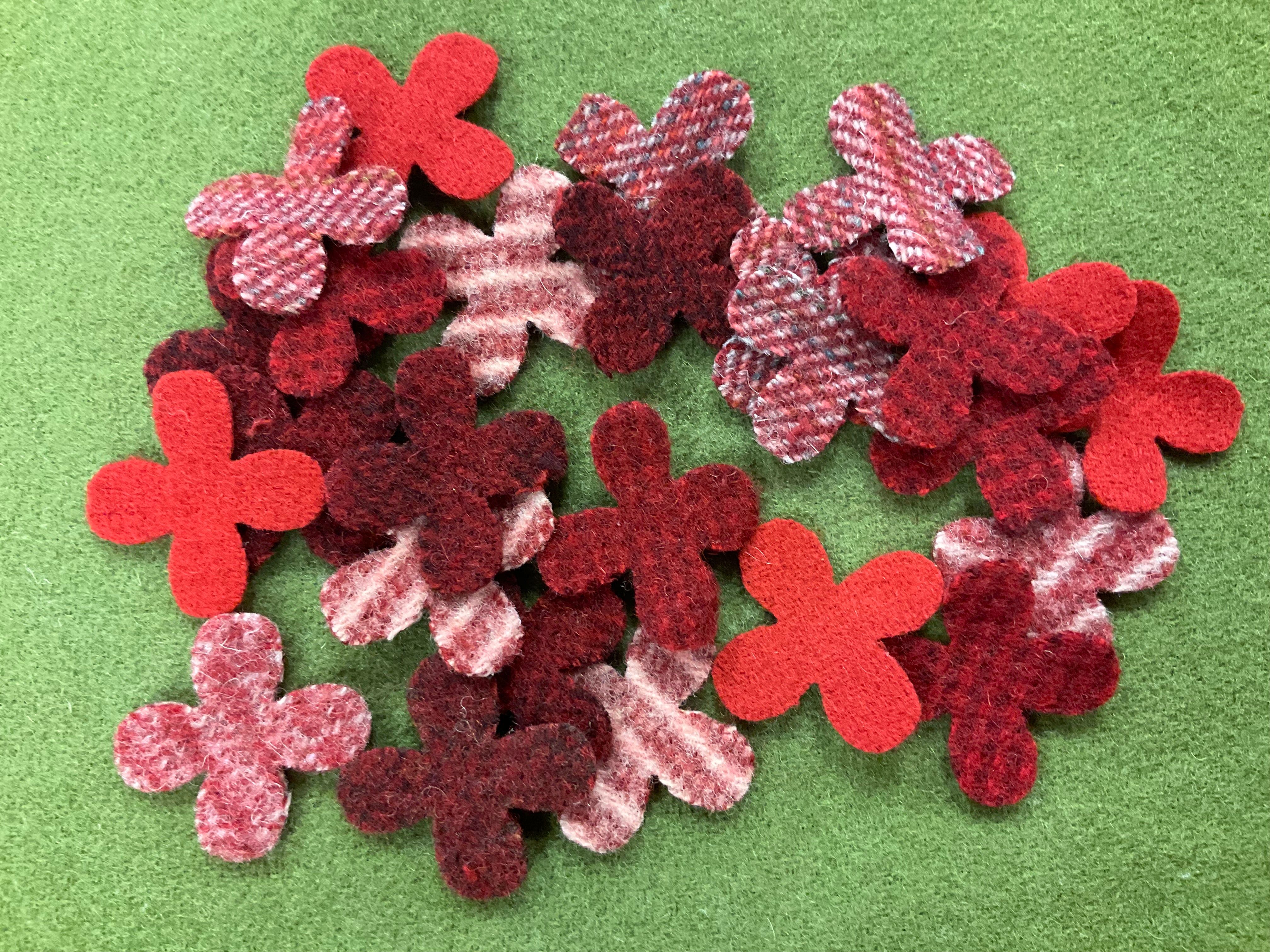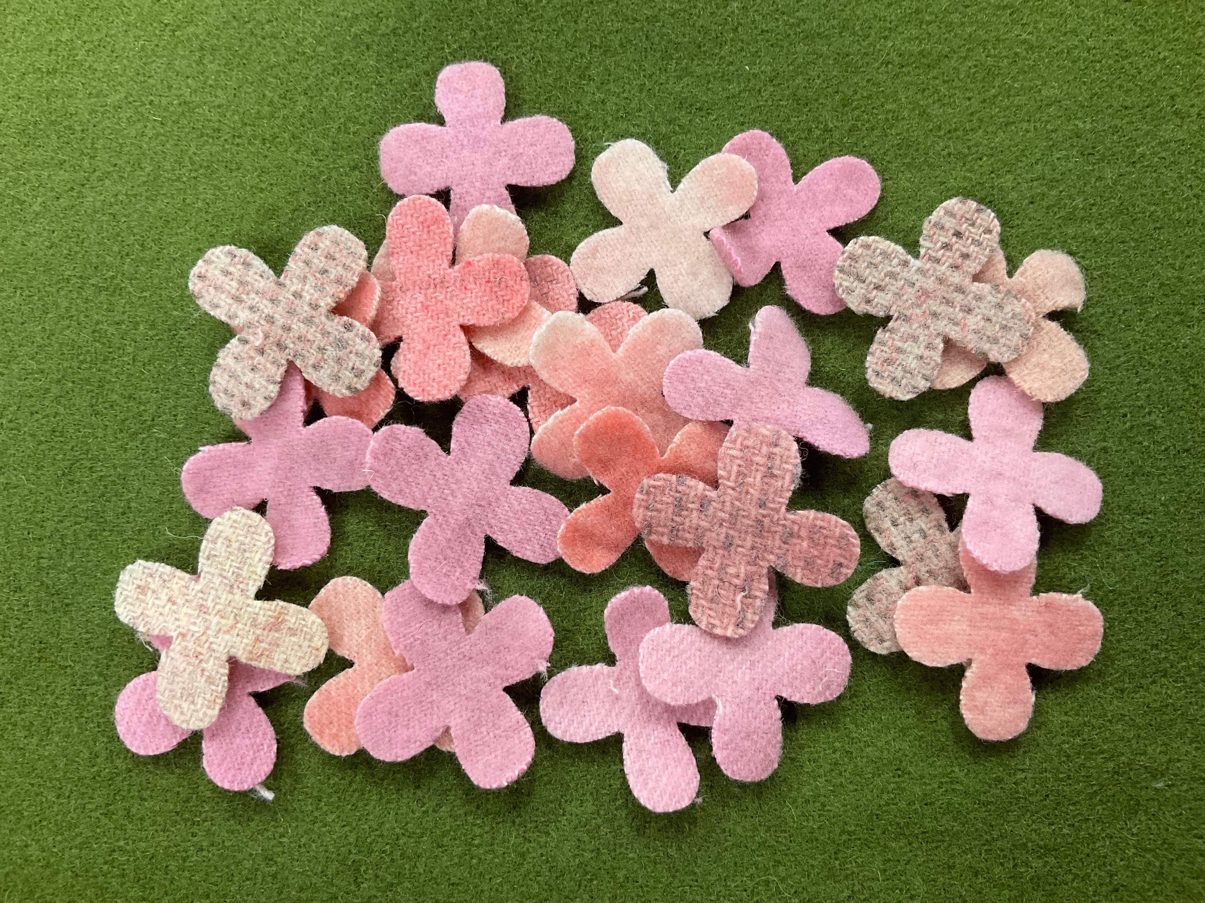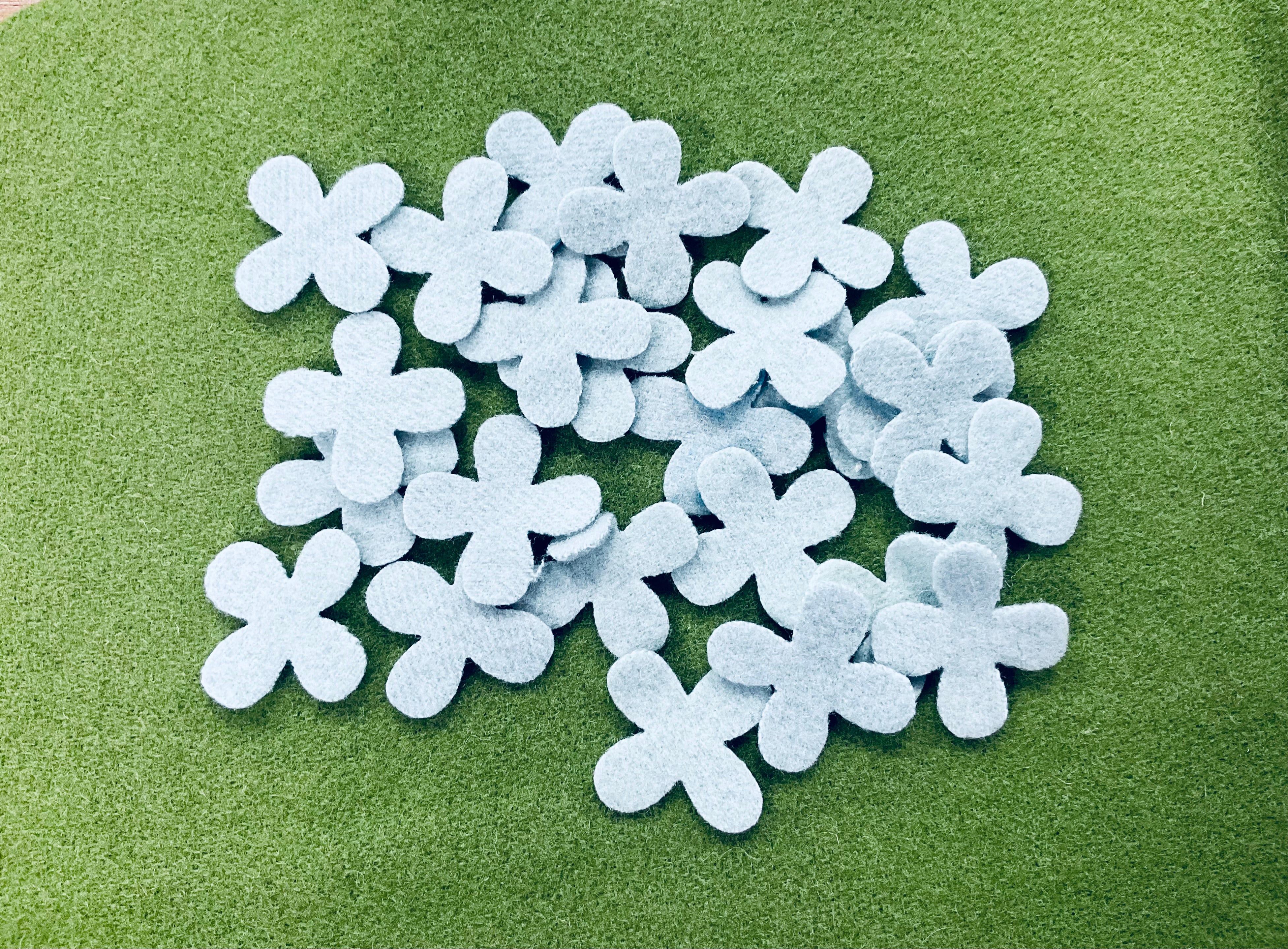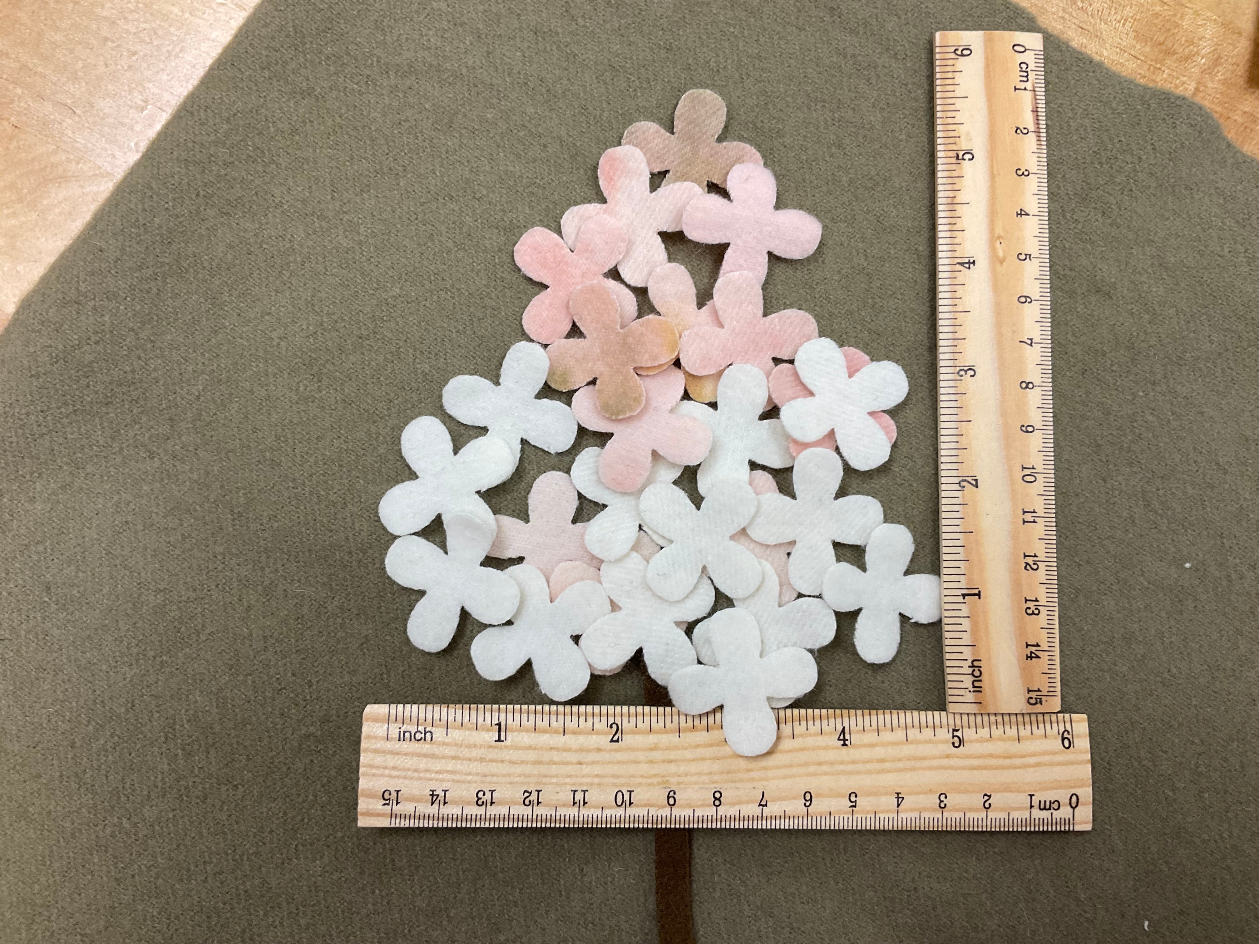 25 single tiny flowers. Stack them and make filler flowers, stitch close together for clusters of hydrangeas, lilacs or geraniums. Don’t forget to add a pack of stems and leaves to create even more! French knots or beads make great centers. Each pack will do a single large cone flower like the hydrangea show or 3 smaller clusters. We will be adding more layout ideas soon.