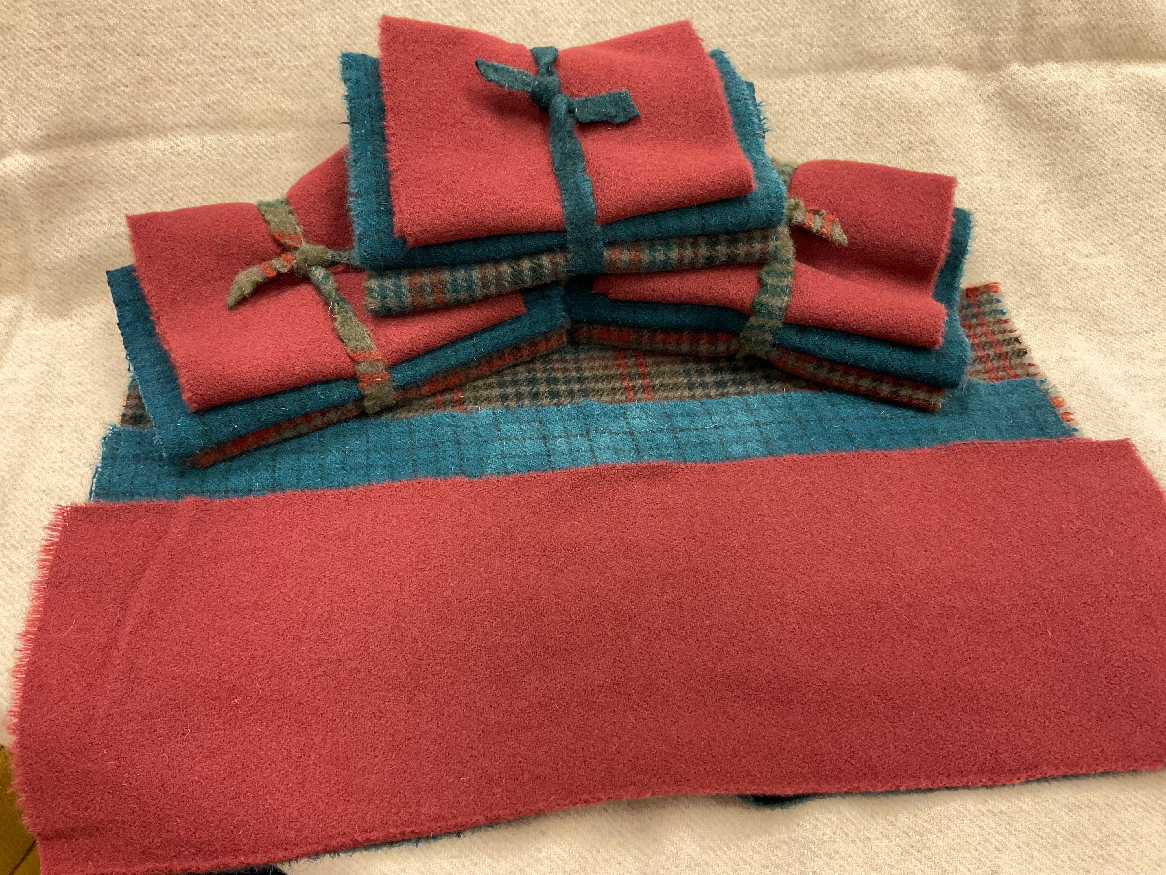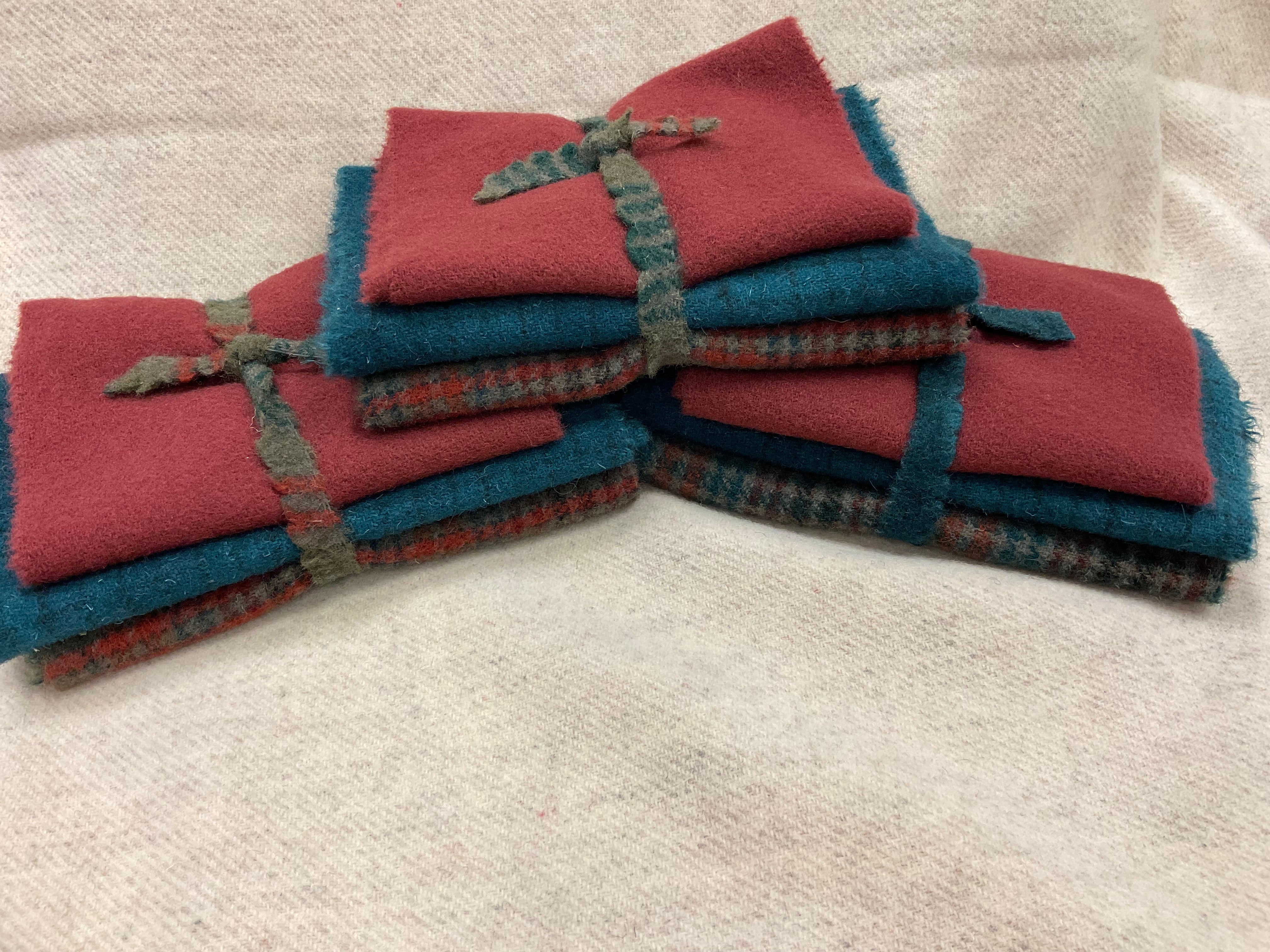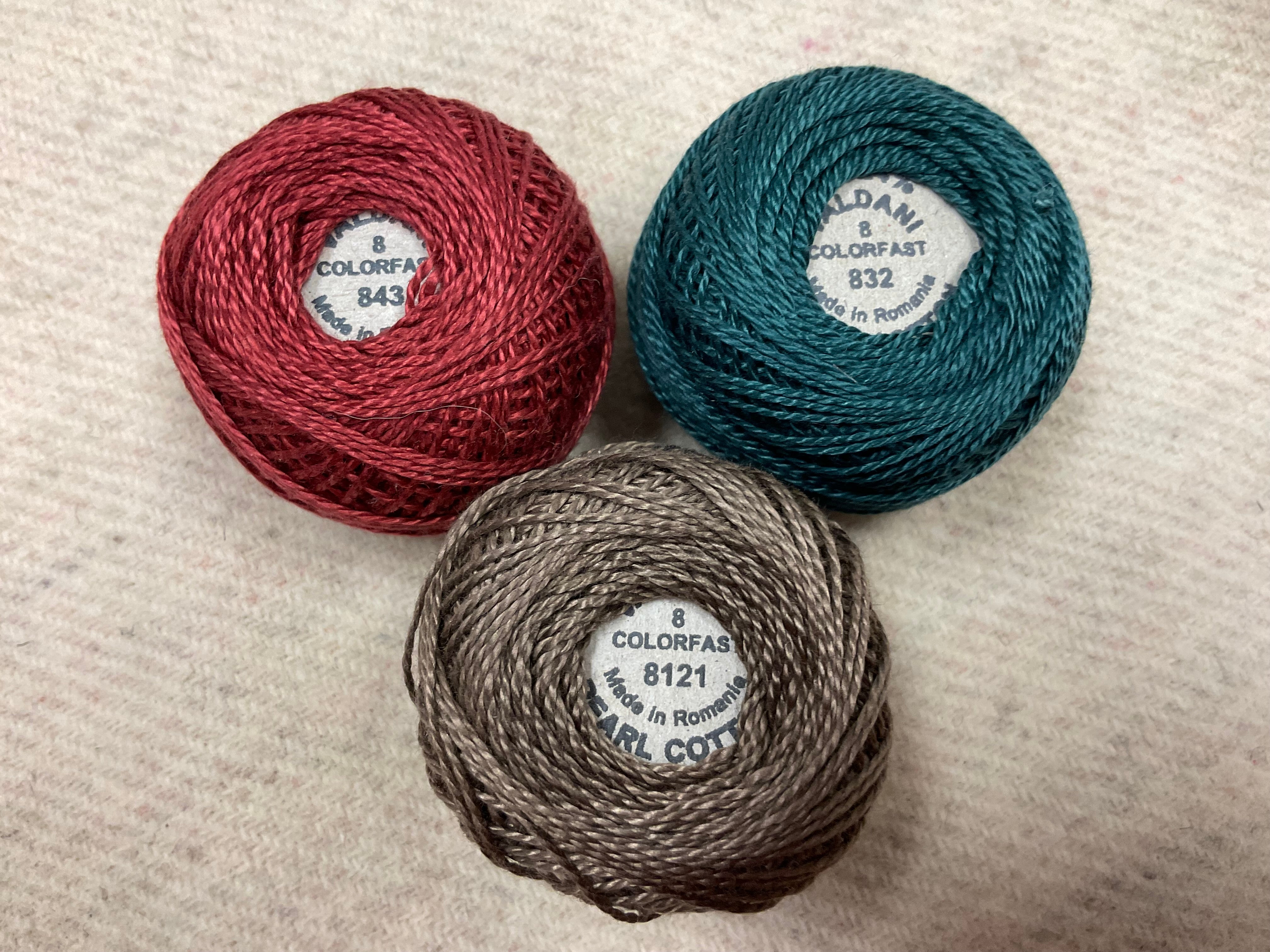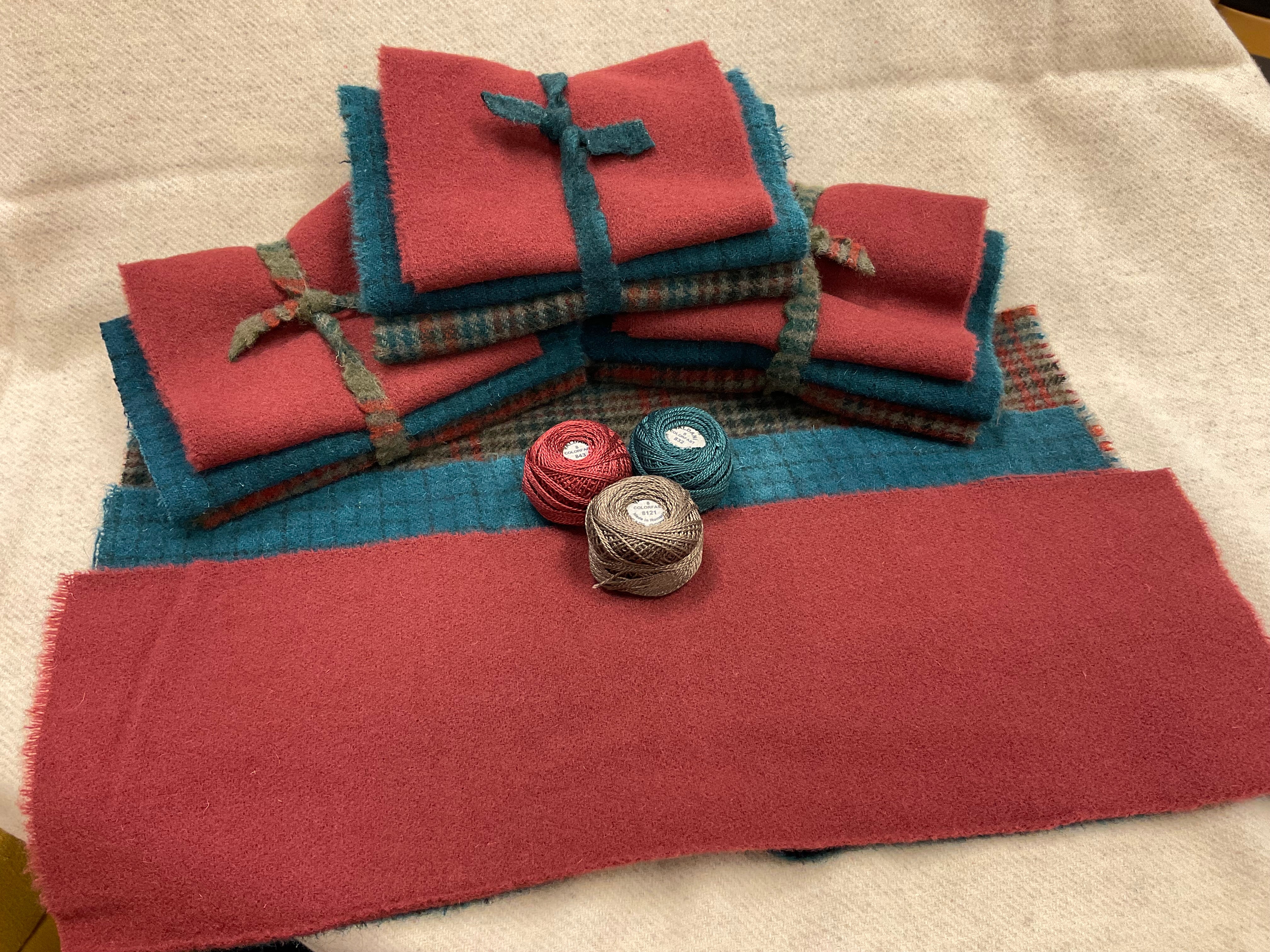 Our newest Bundle of washed wools ready to work with! These are fat 1/16 of a washed as is wool 7.5x17, an over dyed wool roughly 7.5x17 and a solid 5.5x17 from the Rebekah Smith wools. We have picked 3 coordinating valdani threads in #8 to go with your stitching if you like.