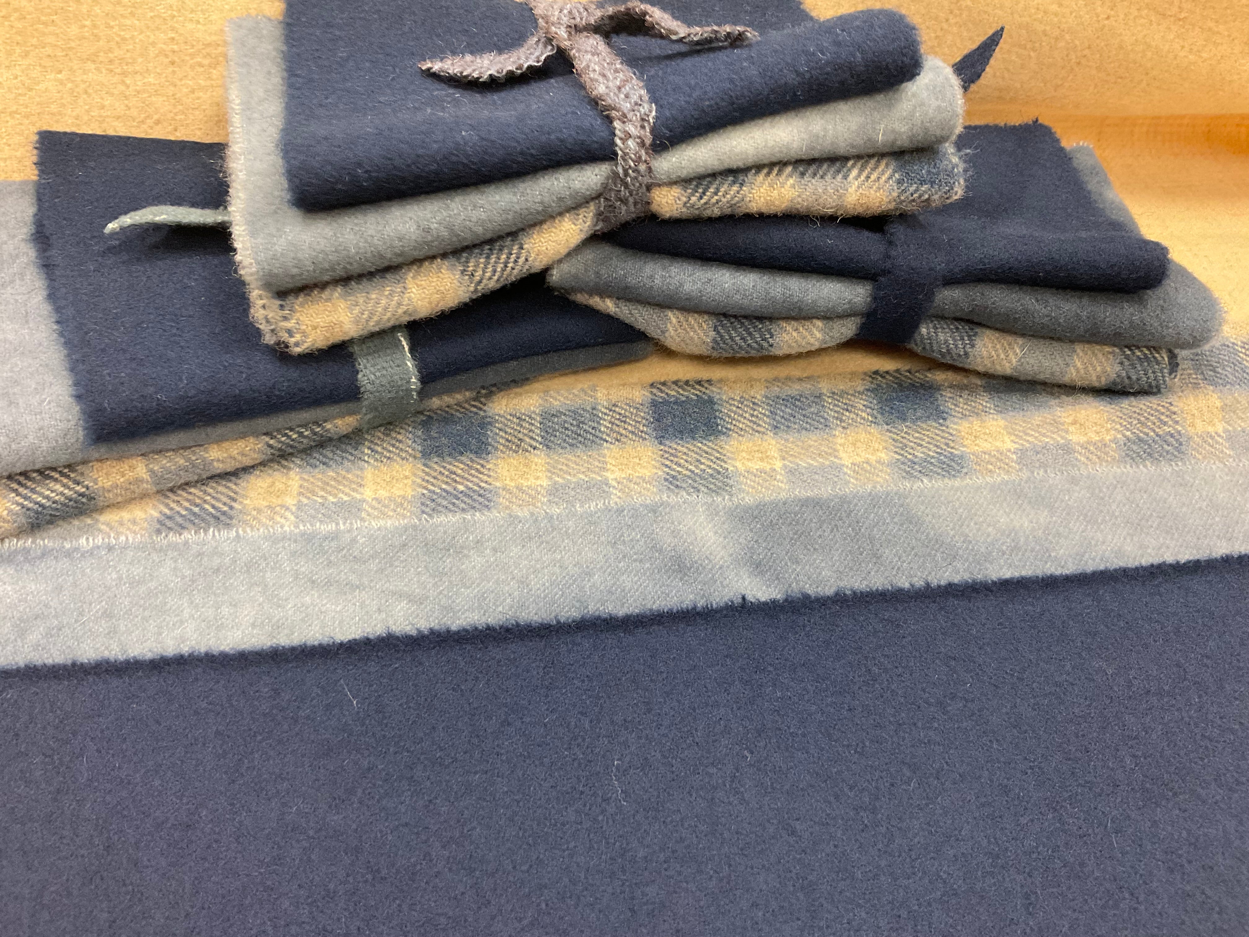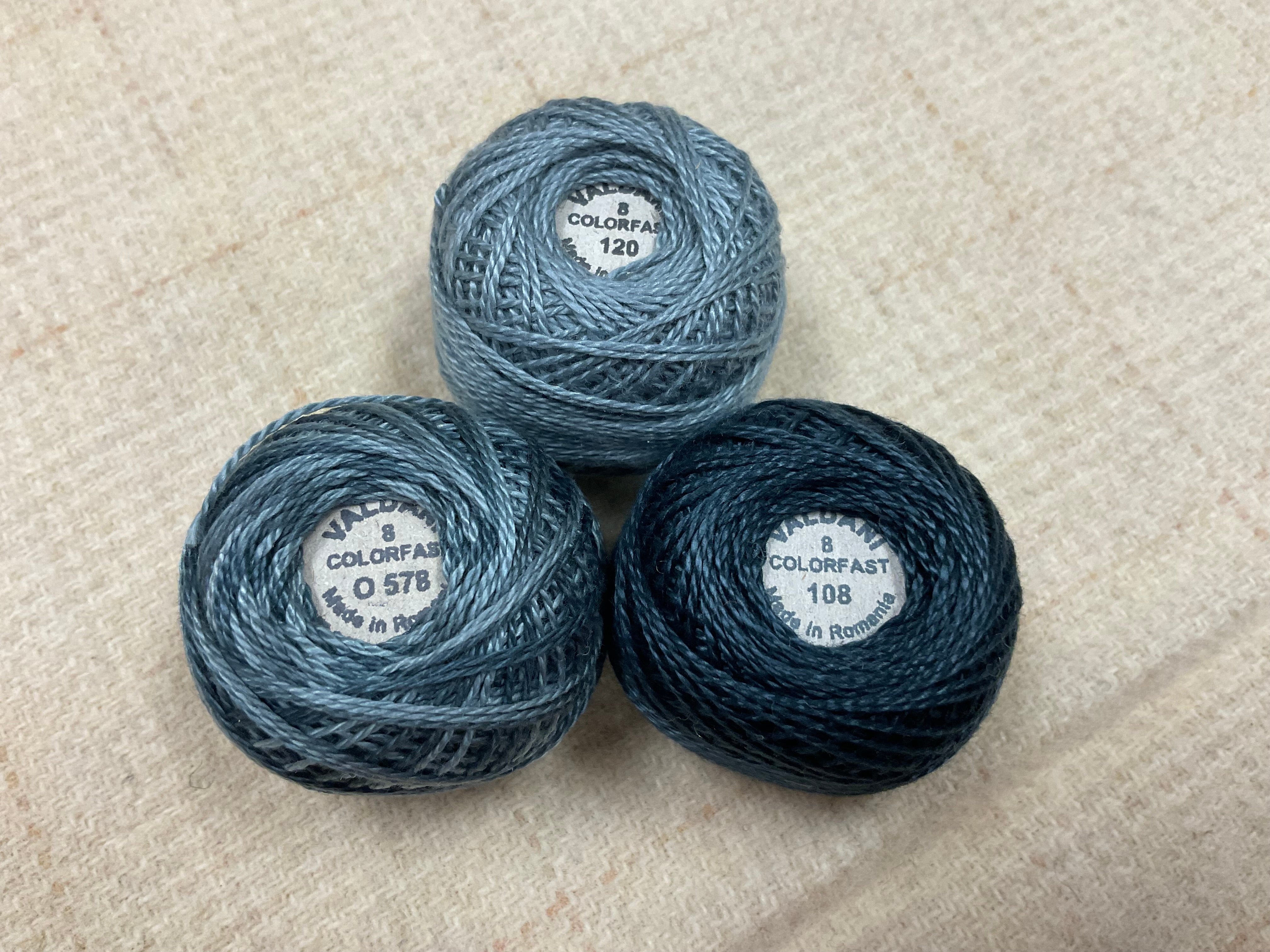 Our newest Bundle of washed wools ready to work with! These are fat 1/16 of a washed as is wool 7.5x17, an over dyed wool roughly 7.5x17 and a solid 5.5x17 from the Rebekah Smith wools. We have picked 3 coordinating valdani threads in #8 to go with your stitching if you like.