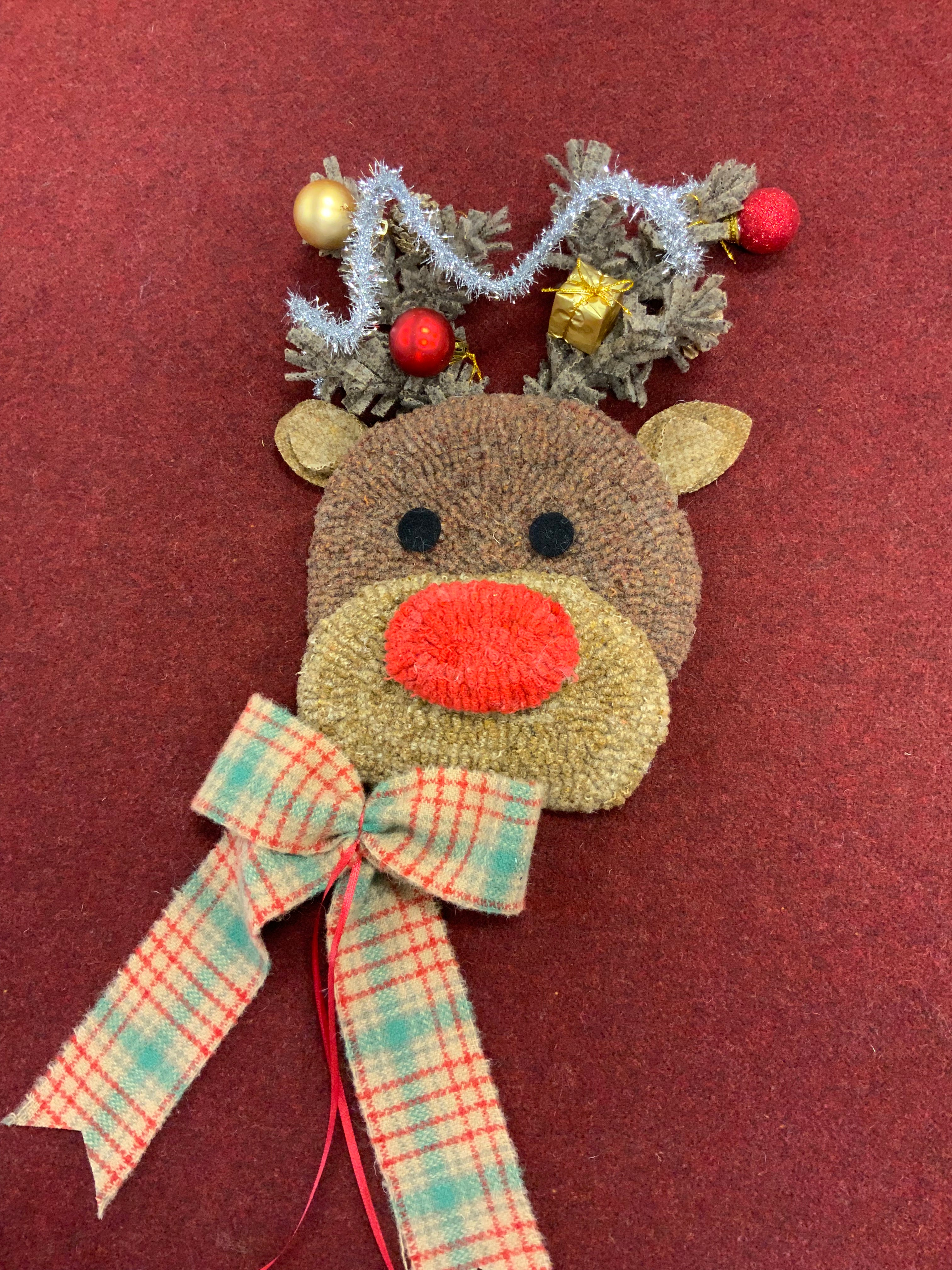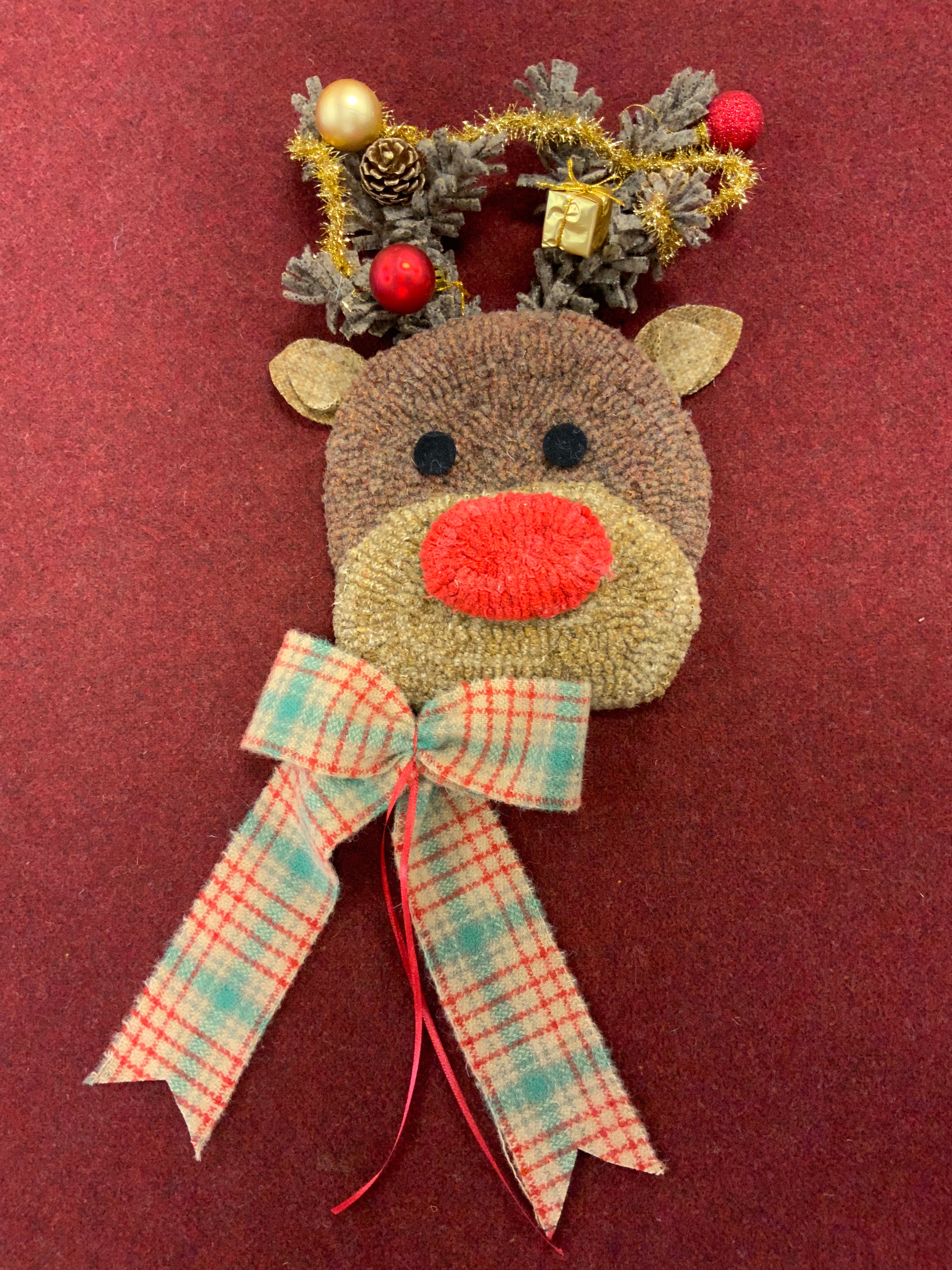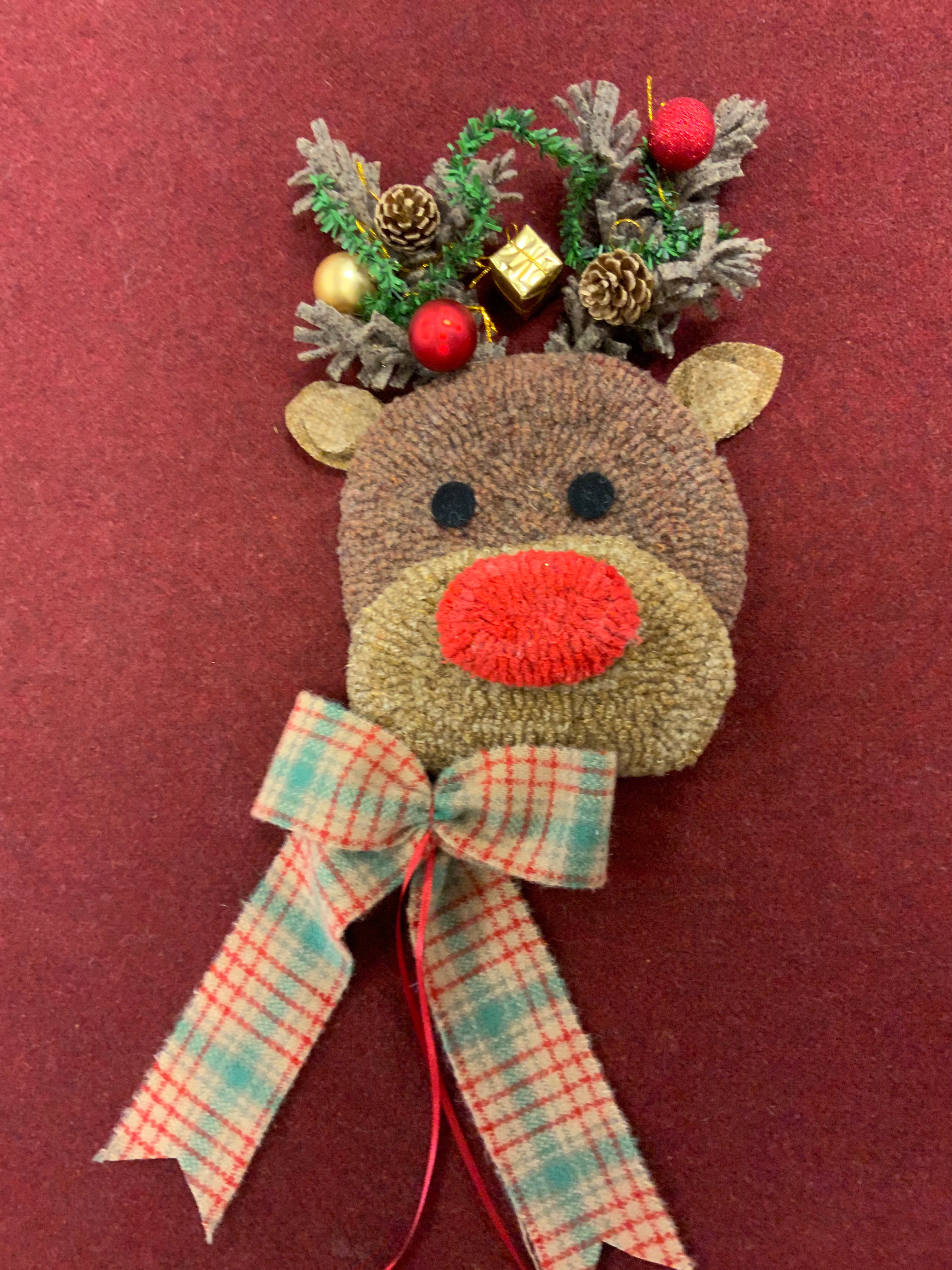 Here is number 6 in our Flattie series. Rudy will look wonderful tucked in a wreath, or just hanging on your wall or door. He’s Very easy to hook and finish.