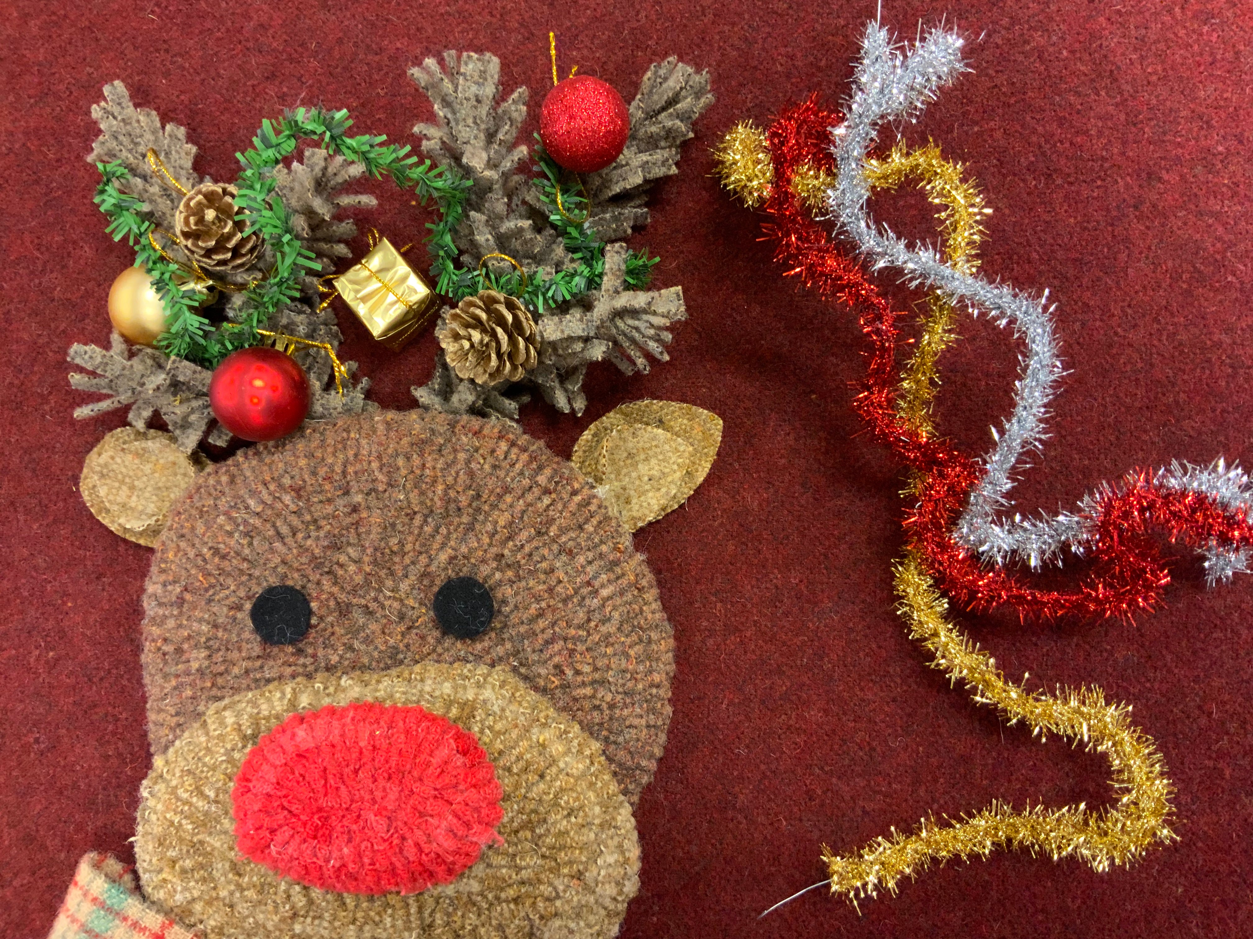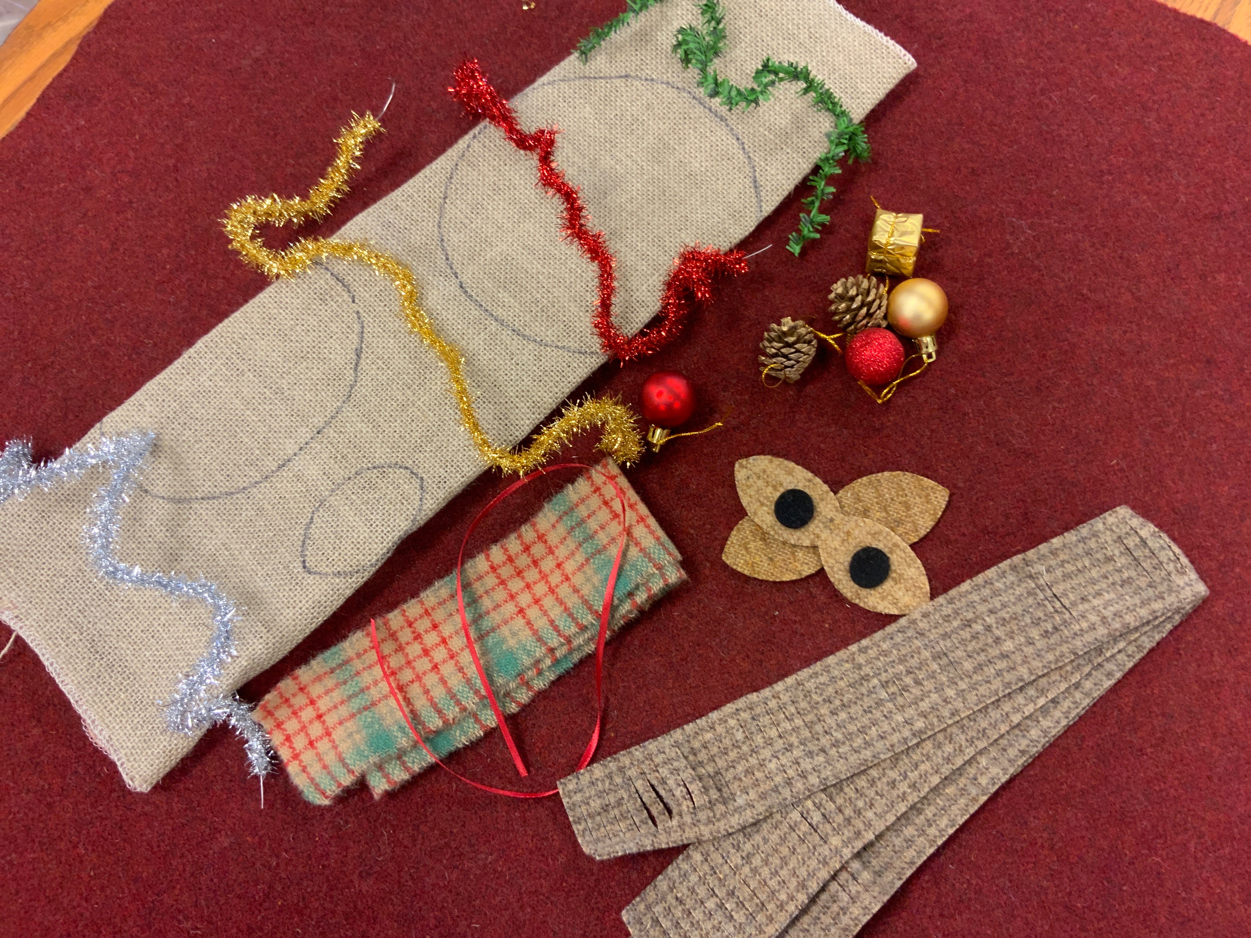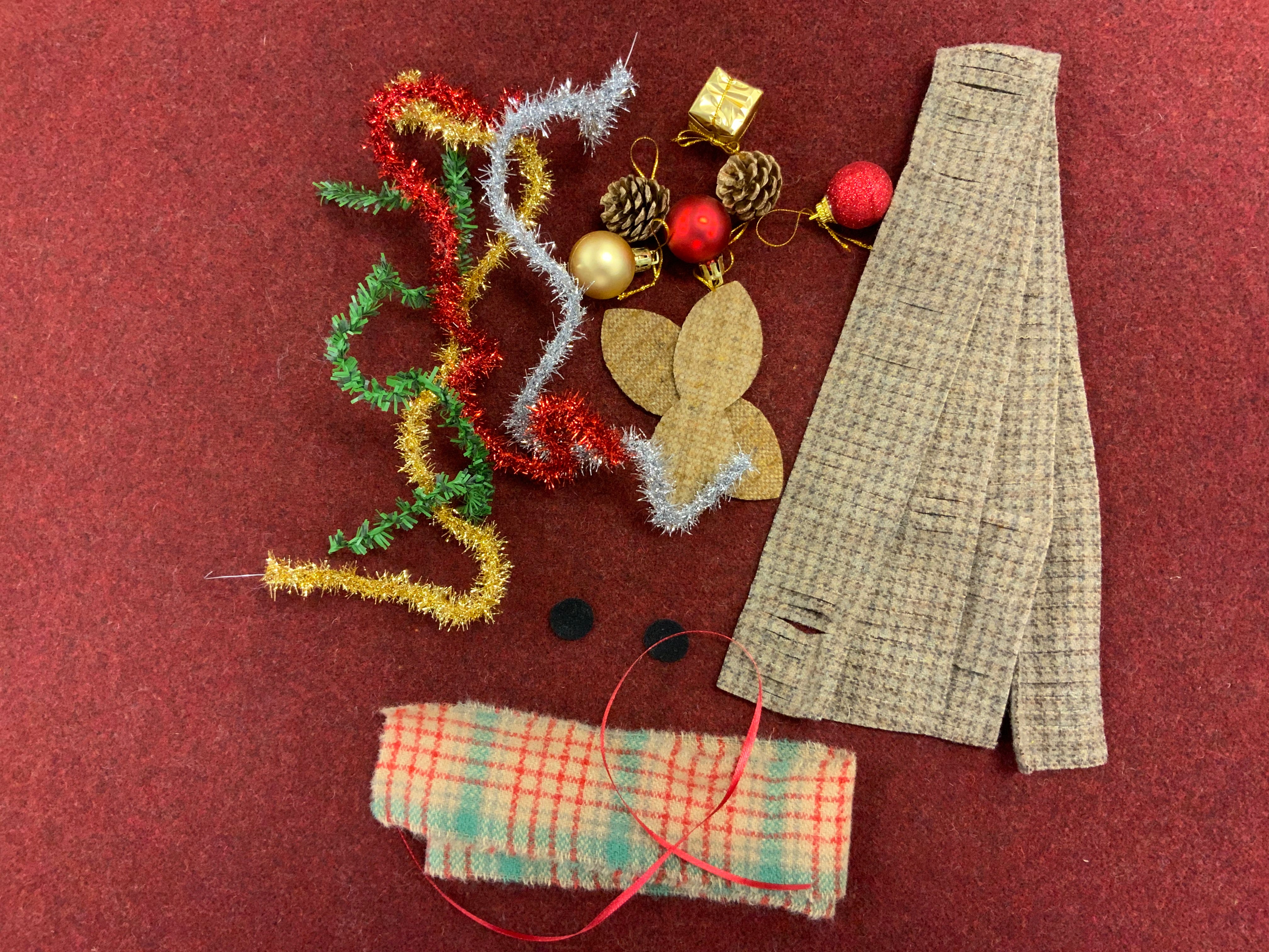Your kit includes the pattern on linen, the scarf wool, pre cut ears, twisting wires and pre cut antler wool, garland and ornaments. Garland colors vary.