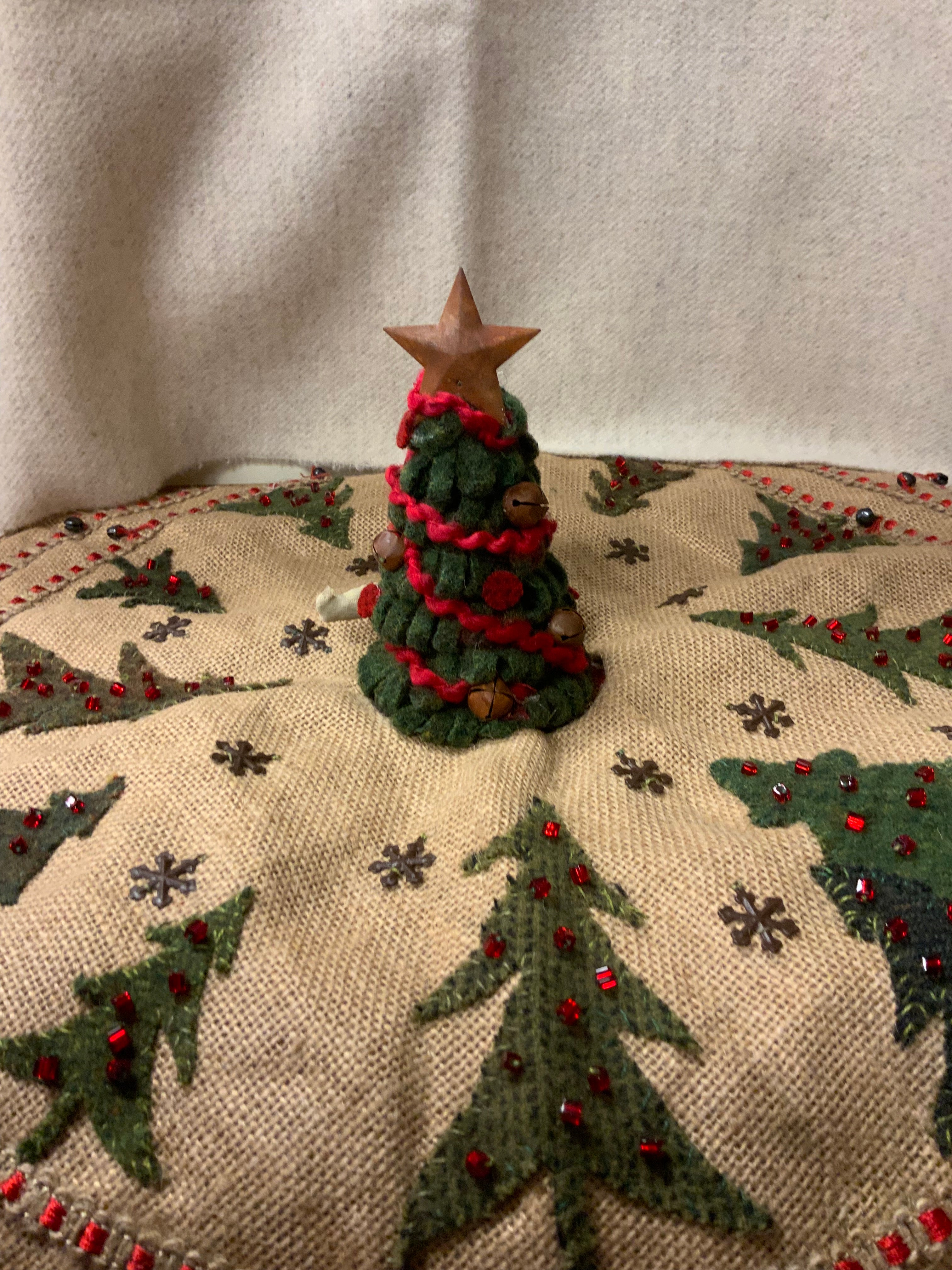 Our most popular trees are our simple cone trees, no cutting wool, no snipping wool feathers, twisting on to wires, no cutting or measuring wires, no tape to wrap or branches to bend and no tree stand needed! It’s cute, primitive, easy to do and will add holiday cheer to any display. Your kit includes all your pre cut green wool, pre cut red pennies, red hand dyed yarn, tiny bells and med bells, rusty stars for the top and your cone. You will need a glue gun and a pair of scissors.