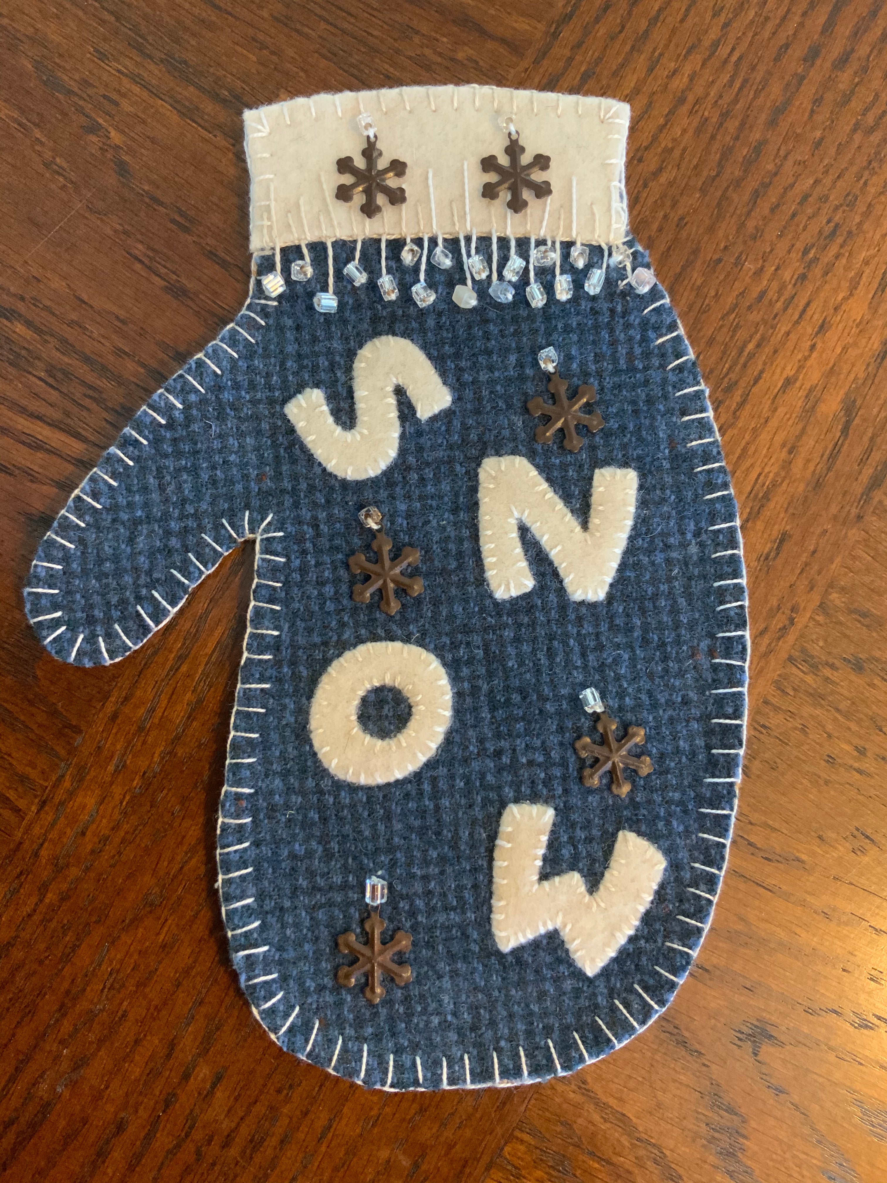 Another mitten to add to your collection! You can add dowel hangers or a stand if you need them. Kit in coeds everything you need to stitch it as shown. All the pre cut wool, thread, glass beads, bells and embellishments.