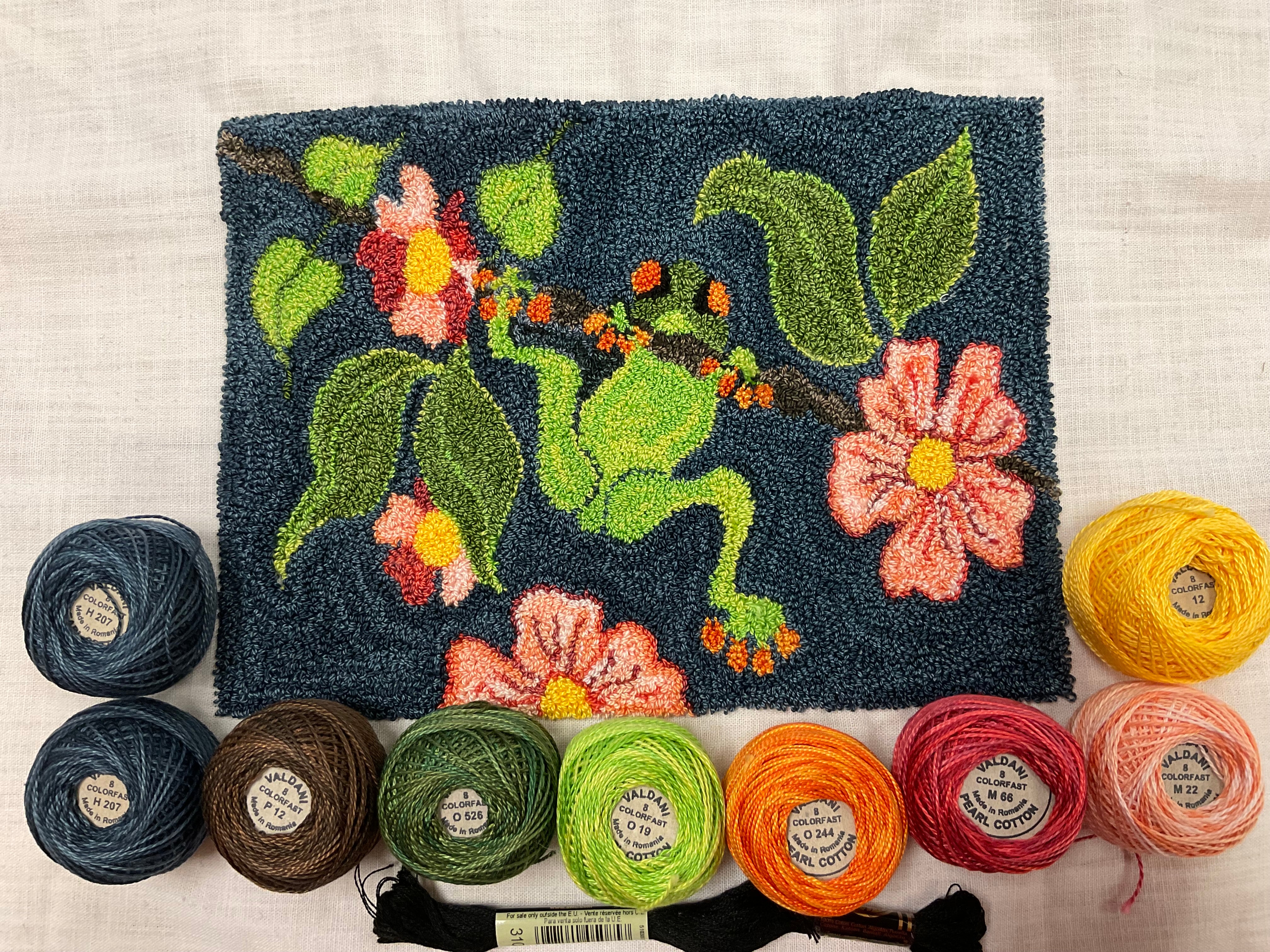 All of our punch needle patterns are Hand drawn on weavers cloth. We use the ultra punch punch needle. And love to work with our hand dyed merino or Valdani #8 pearls cotton. As we get samples punched we will add them to each piece. If we have a hooked version we will show it also for color planning. Thank you Denise B for the cute sample you punched us