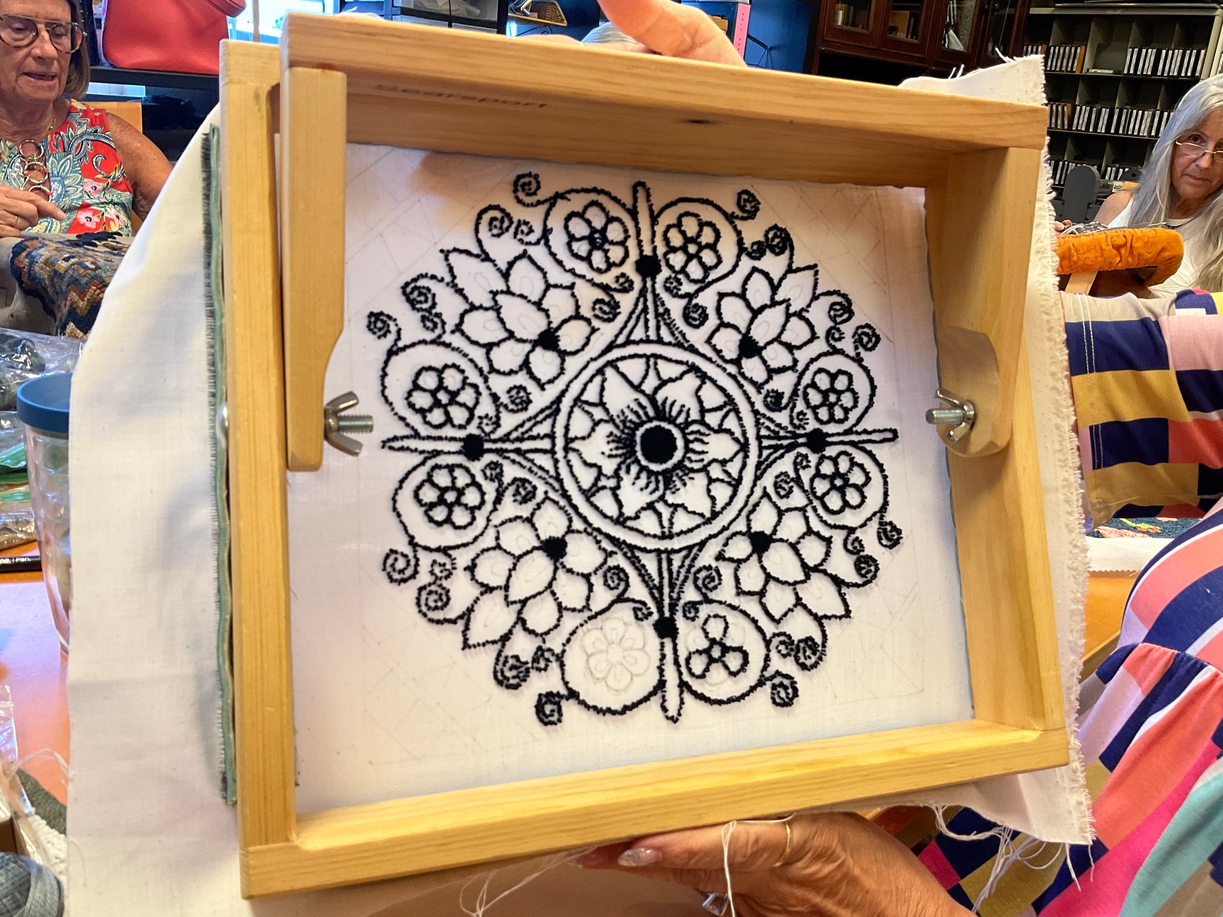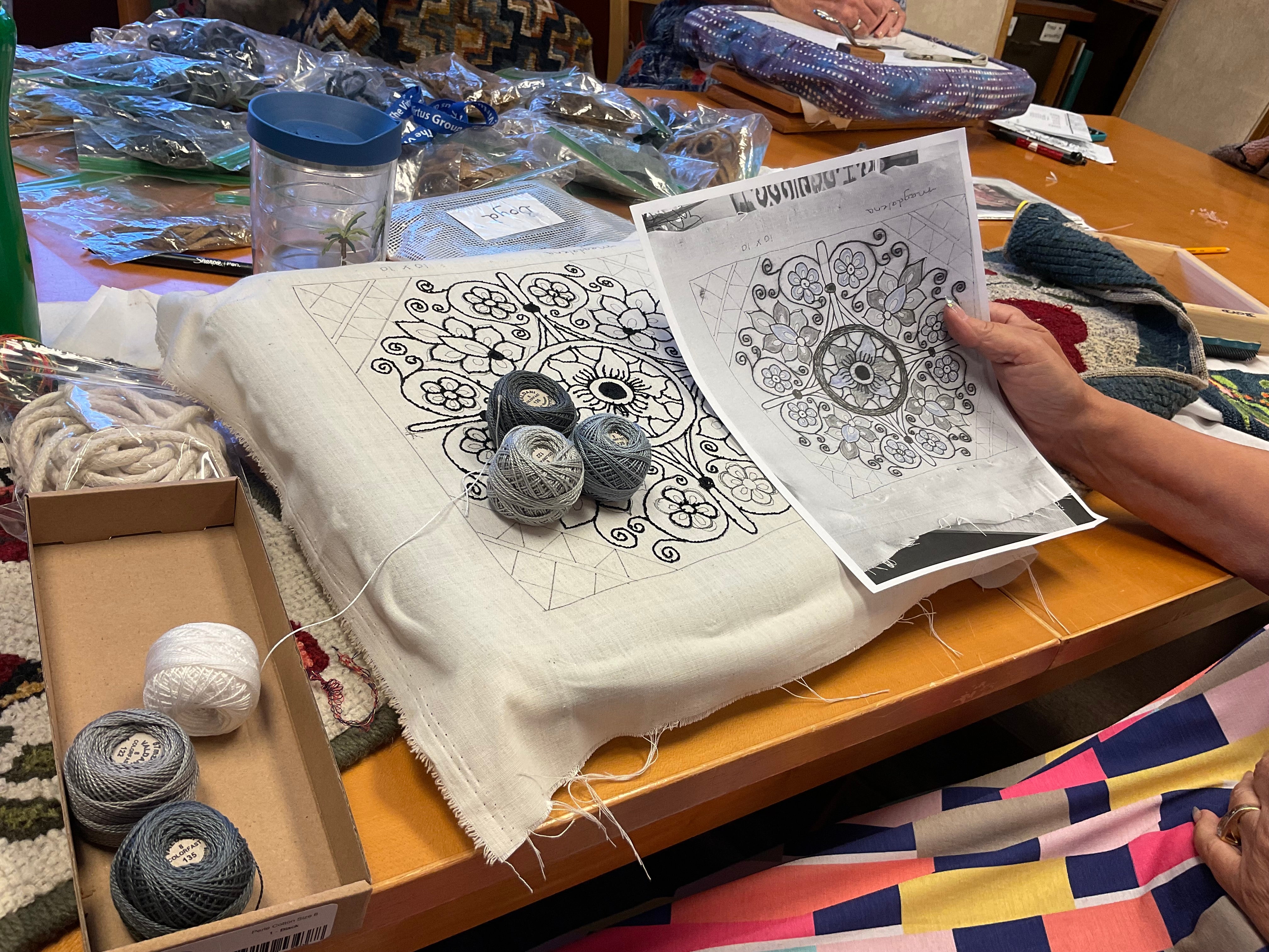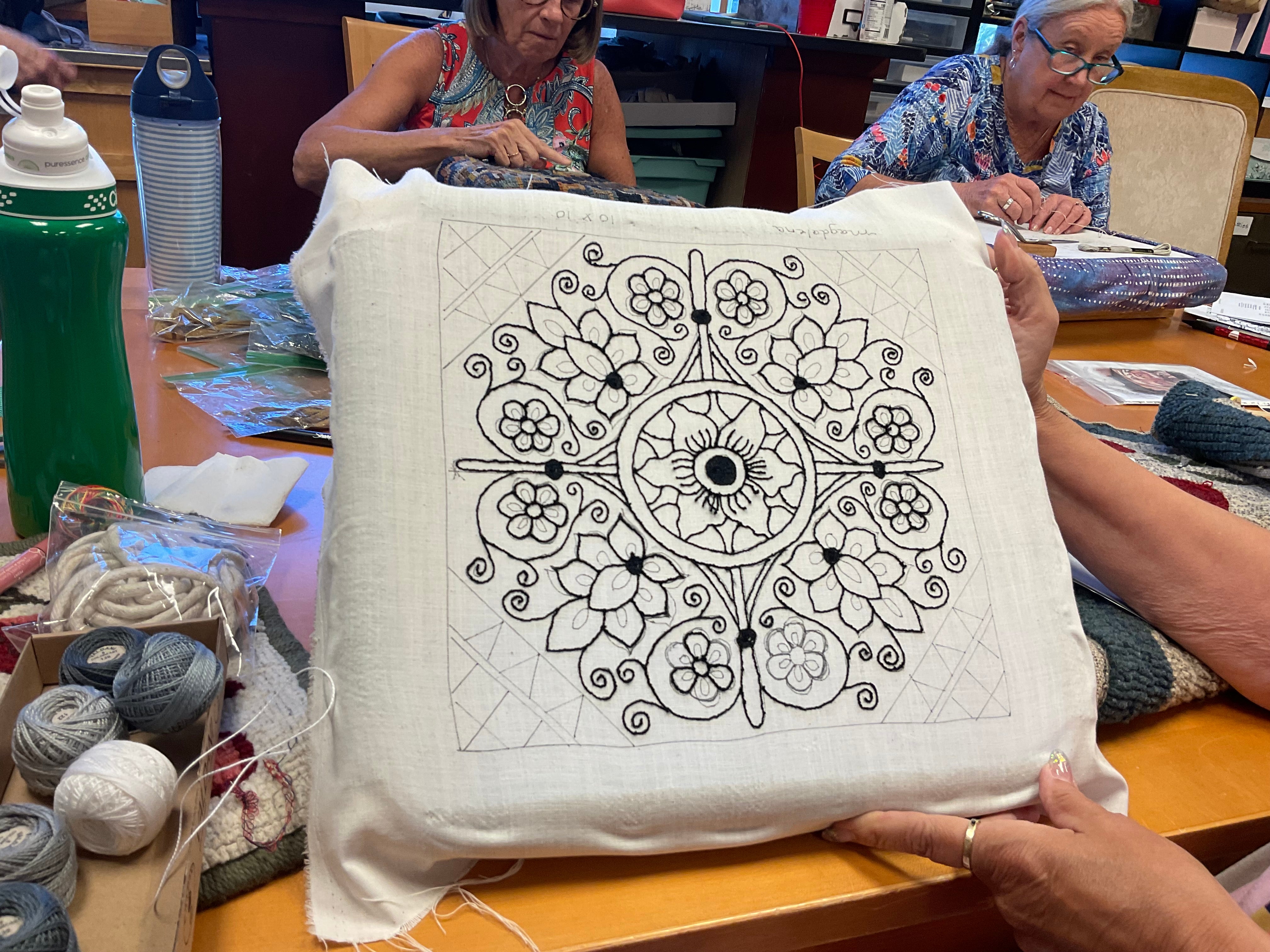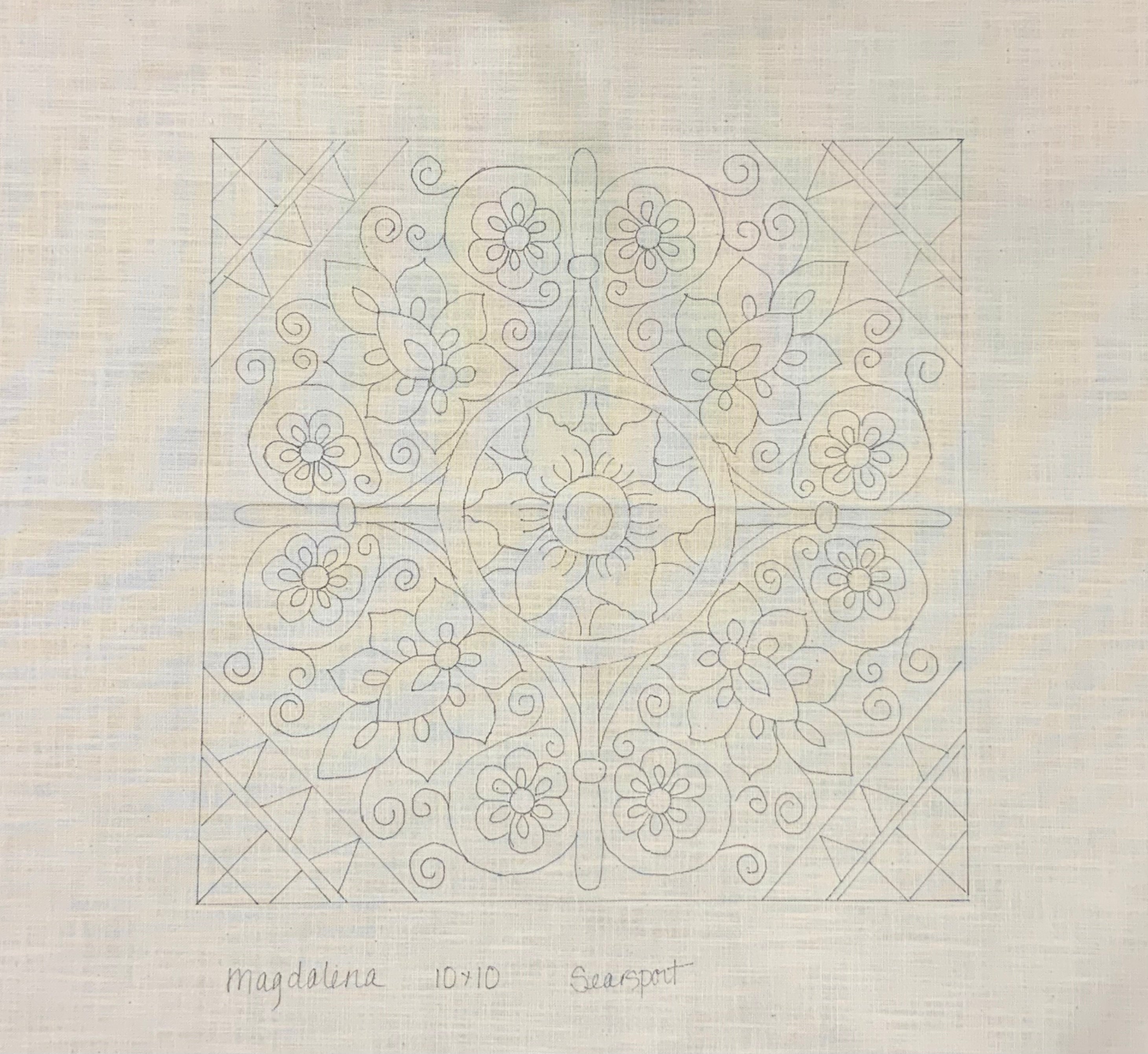 Denise B is punched our Magdalene pattern in #8 Valdani pearl cotton. She’s working from white to black. As always color plans are a work in progress as you work on a piece. We have seen this punched in so many pretty color combos!