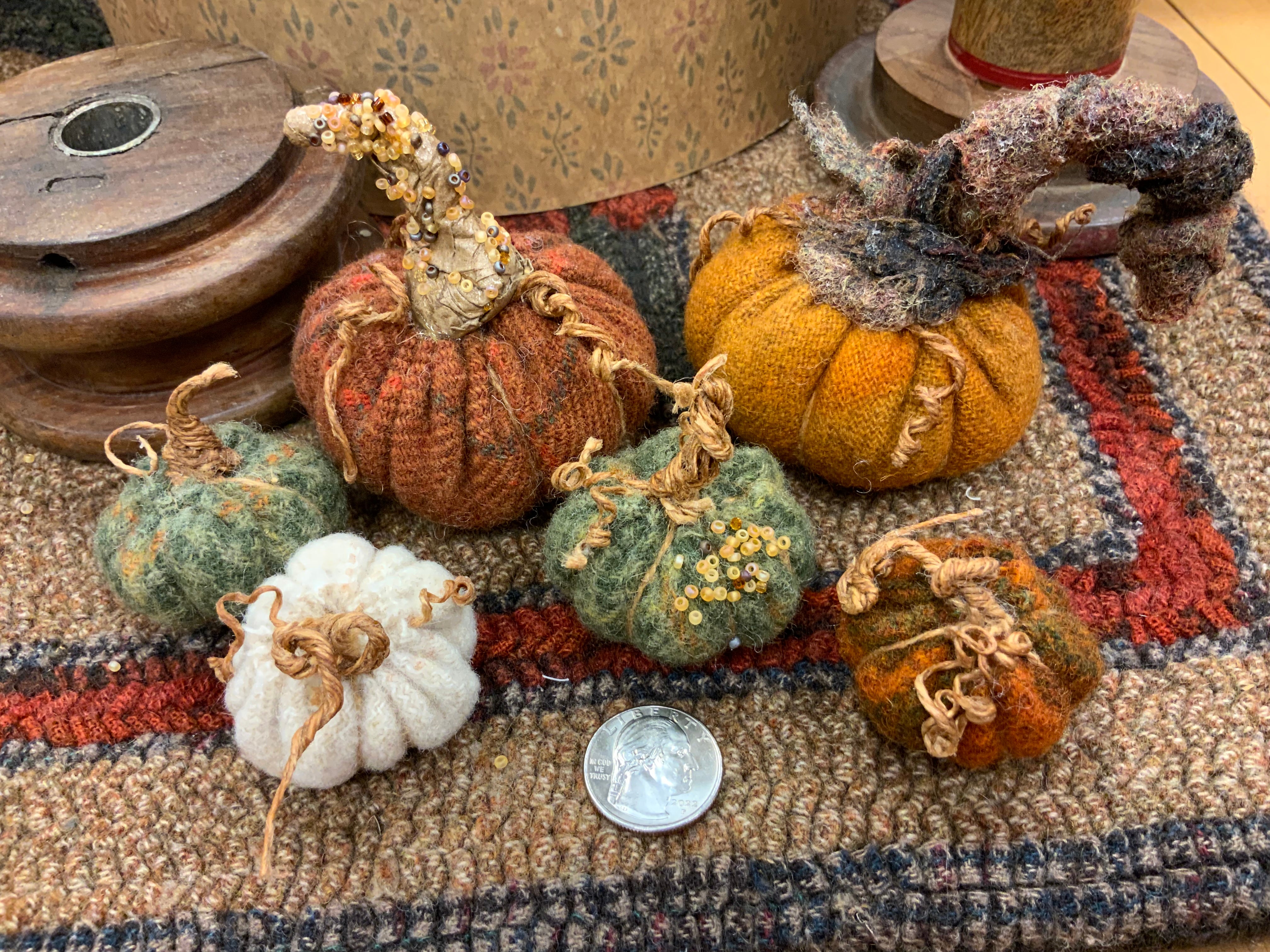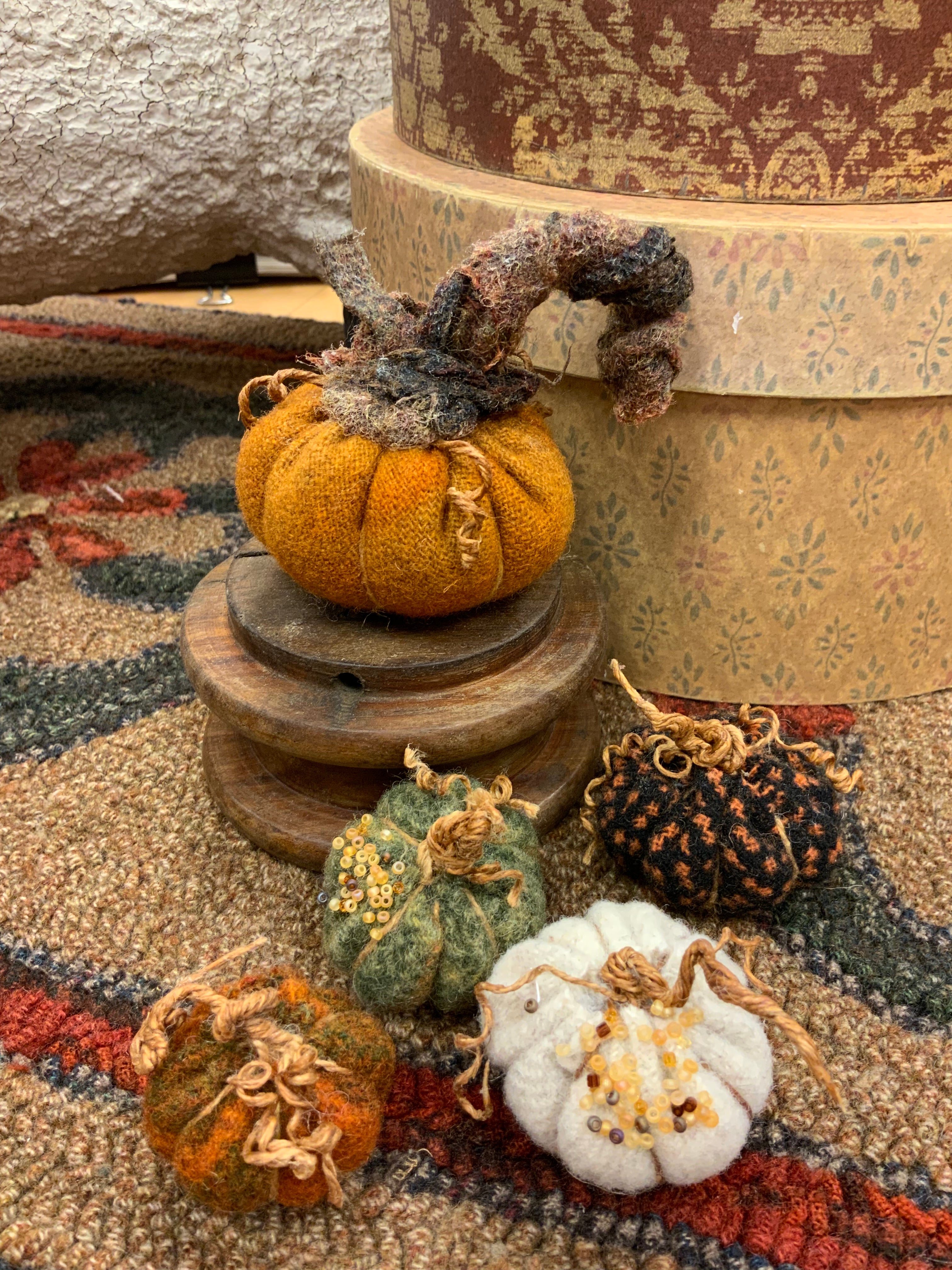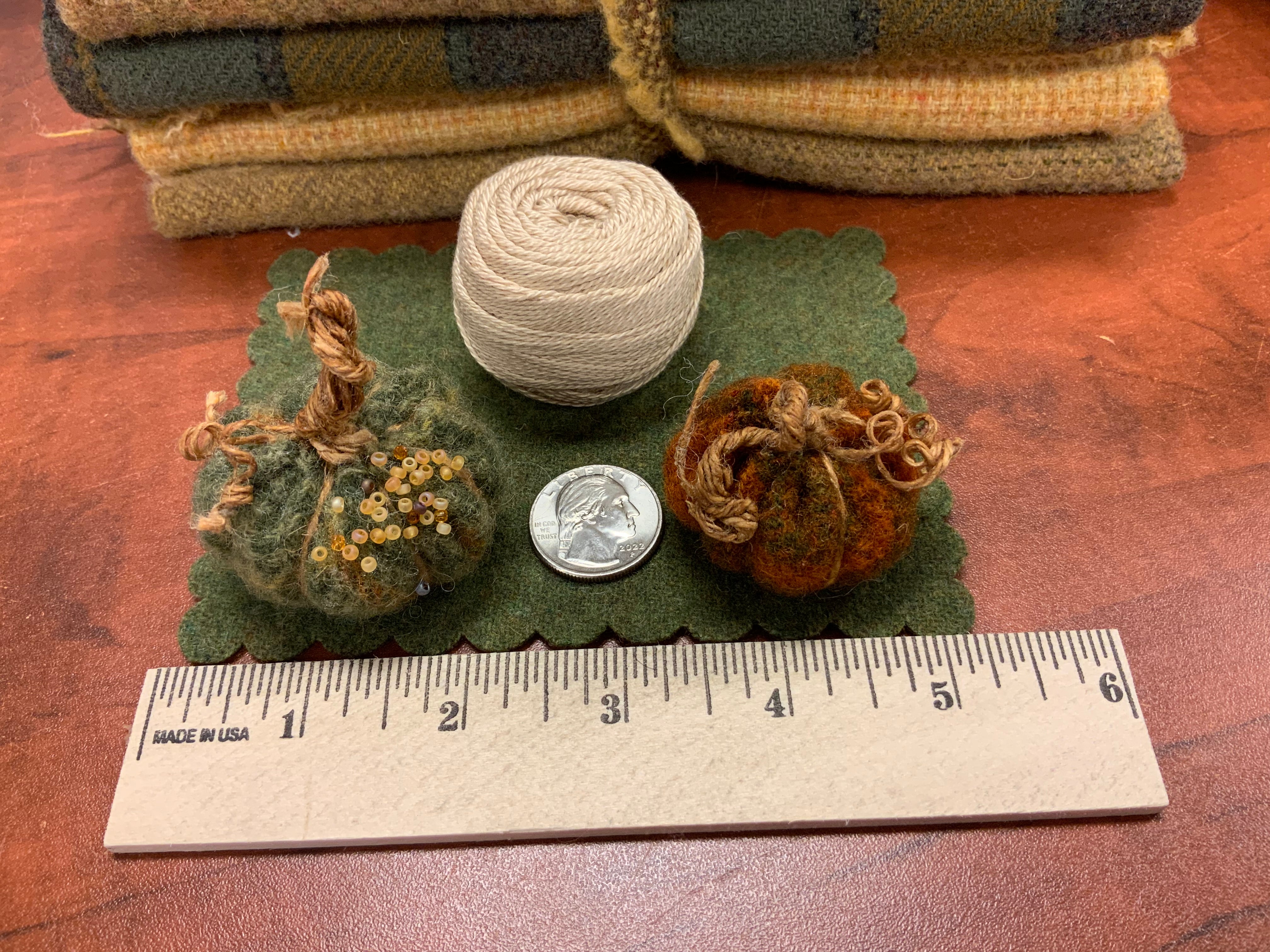 The kit makes five pumpkins, two  1.5-2 inch,  two 2-2.5 inch and a three inch. The kit includes the pre cut circles in assorted colors, the bent tip needle, enough threads, beads, foam brush, plus the wool and paper to make your choice of stems for the “large” pumpkin and of course directions to do it all, with colored pictures. You will need scissors, stuffing and modge podge. Colors are assorted with a mixture of orange, cream, green and rust.