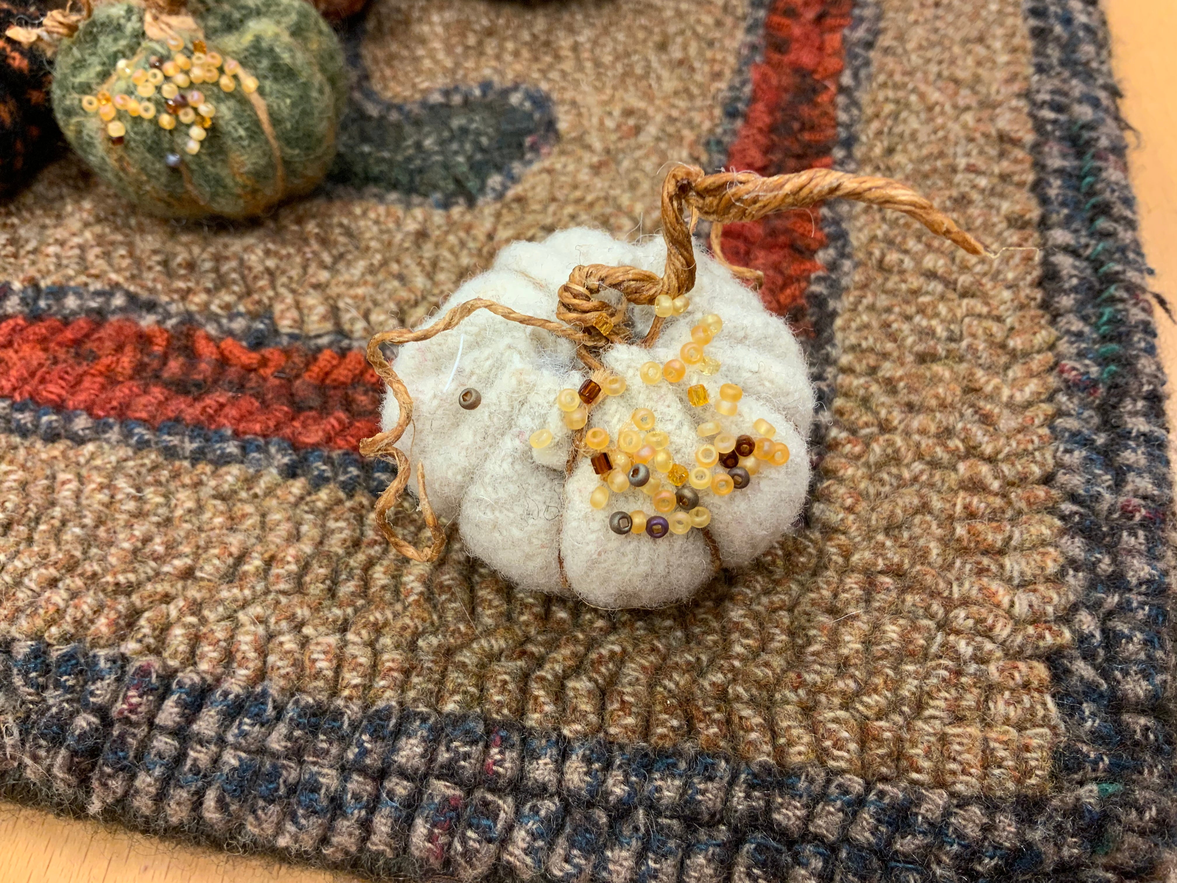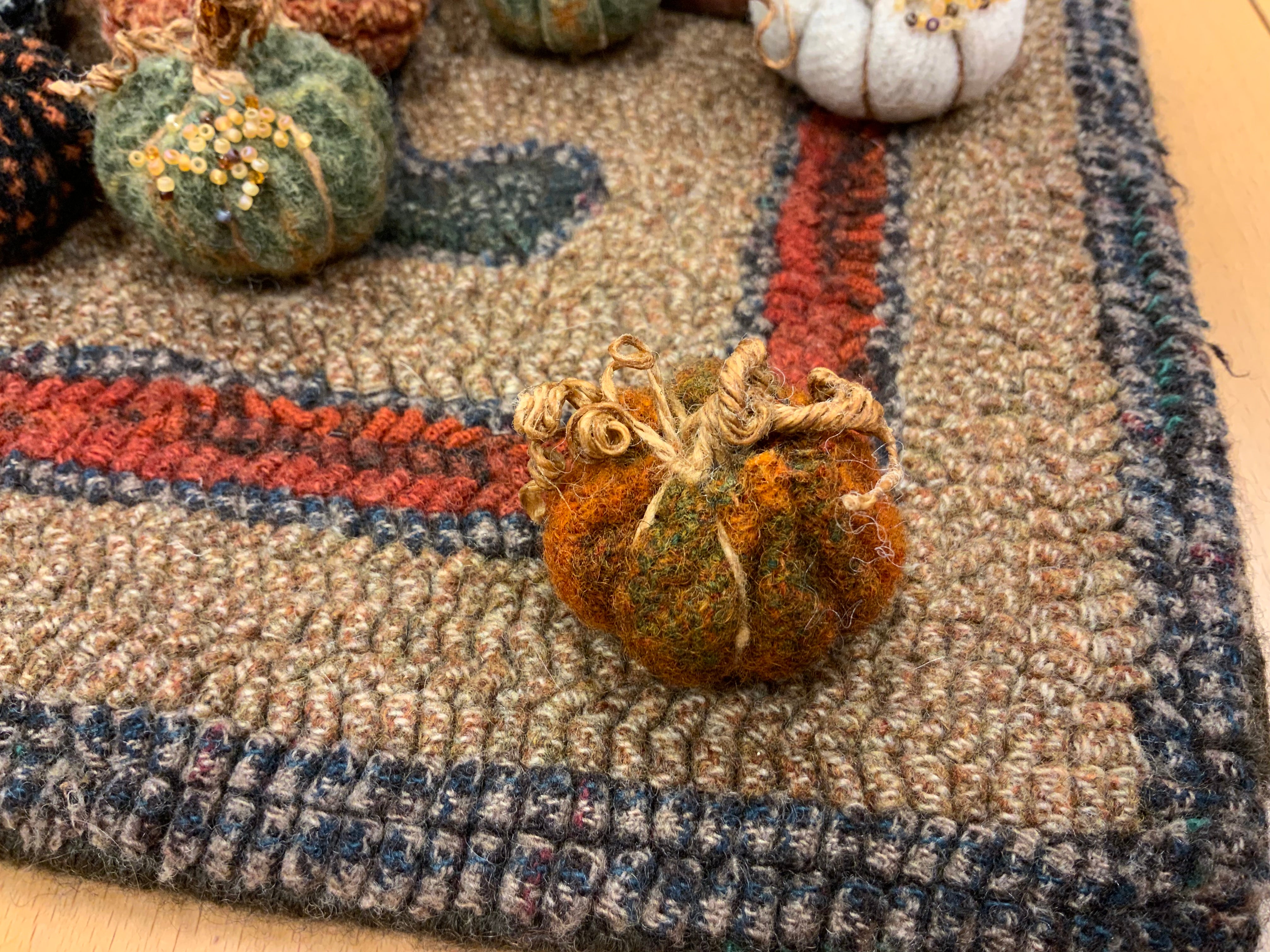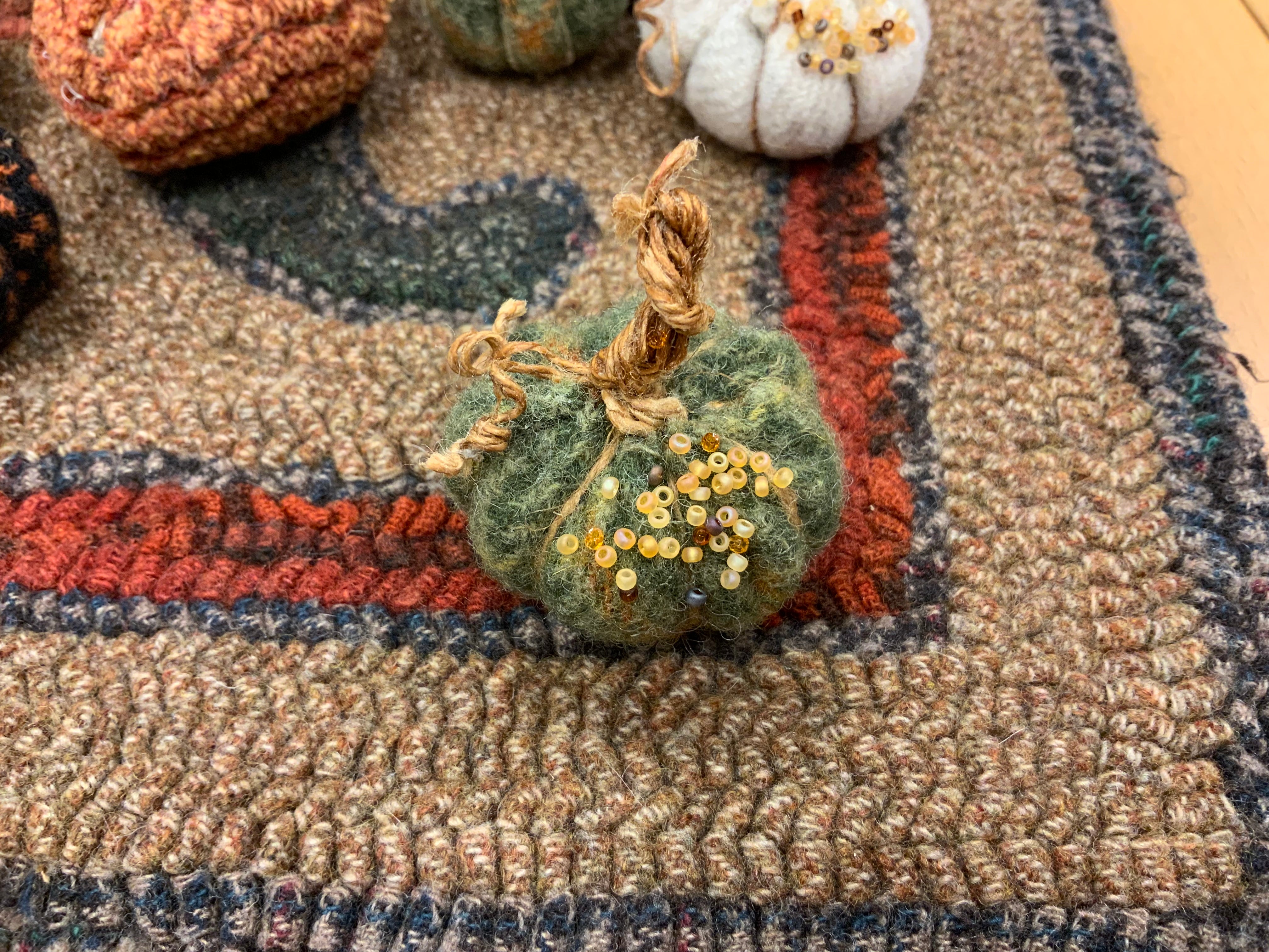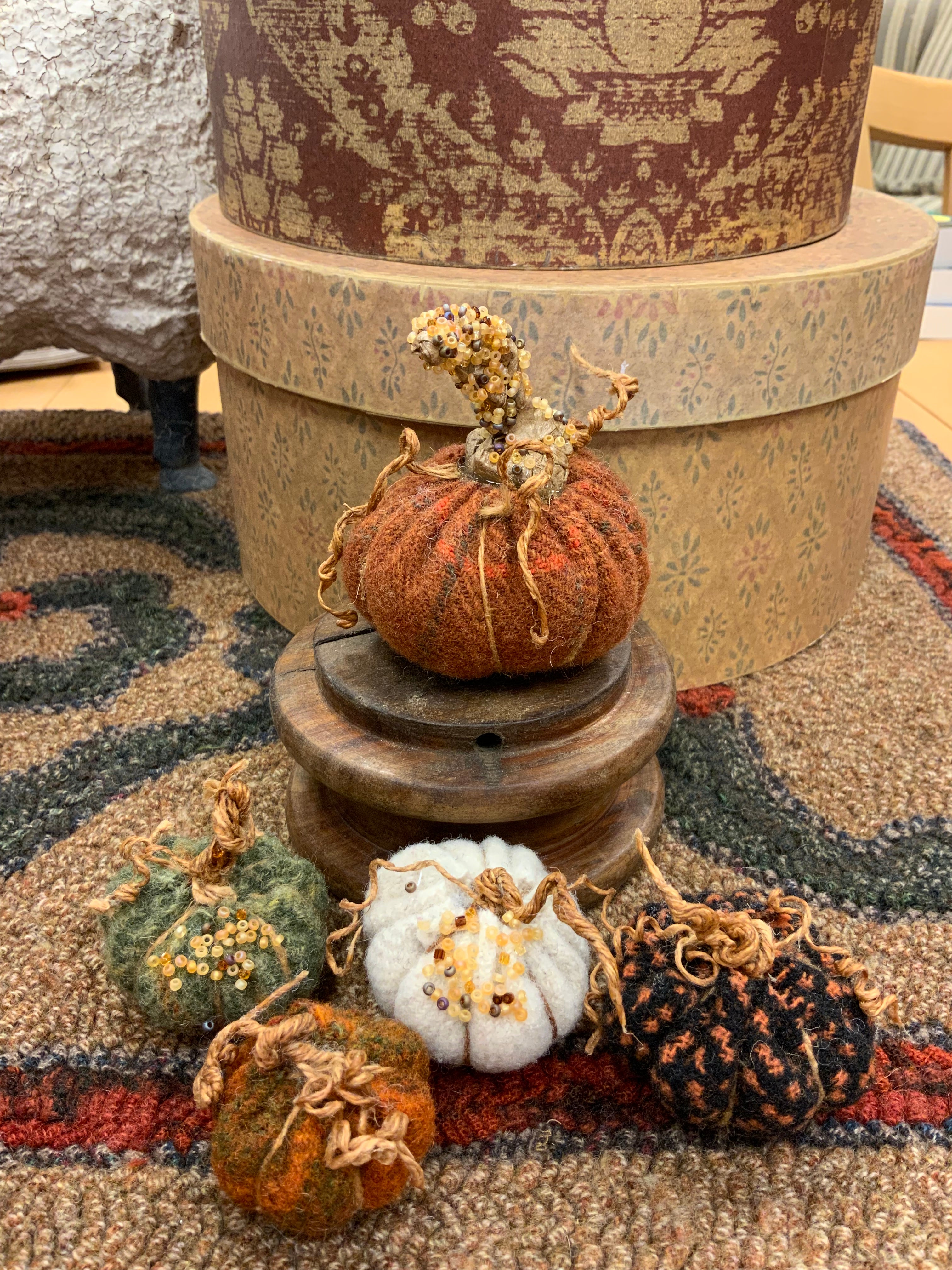 The kit makes five pumpkins, two  1.5-2 inch,  two 2-2.5 inch and a three inch. The kit includes the pre cut circles in assorted colors, the bent tip needle, enough threads, beads, foam brush, plus the wool and paper to make your choice of stems for the “large” pumpkin and of course directions to do it all, with colored pictures. You will need scissors, stuffing and modge podge. Colors are assorted with a mixture of orange, cream, green and rust.
