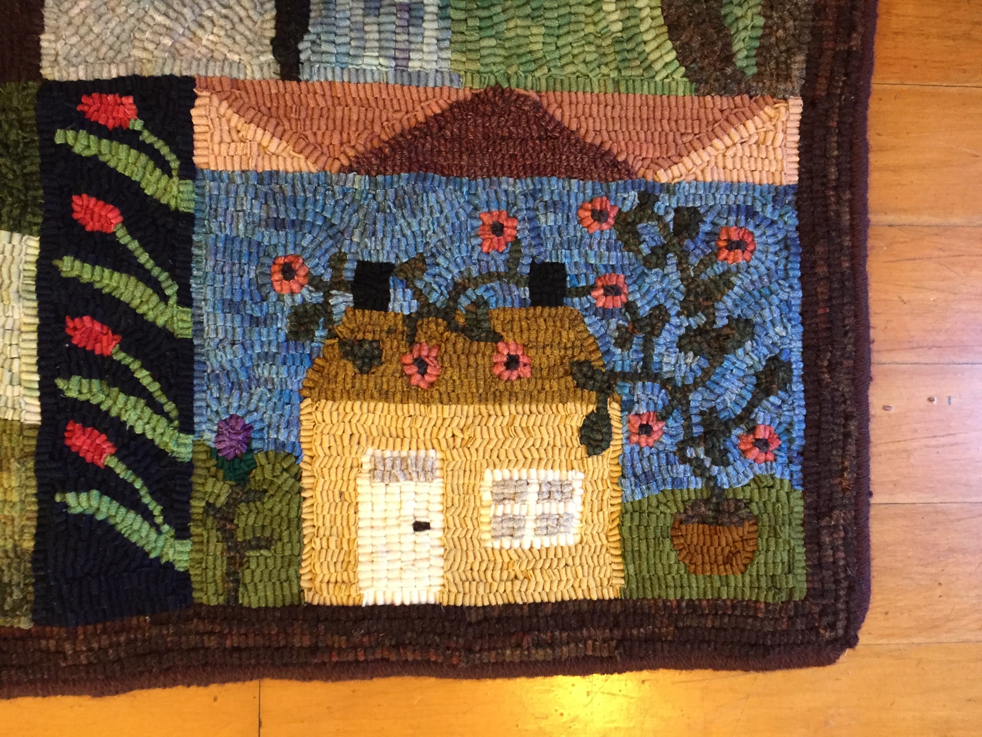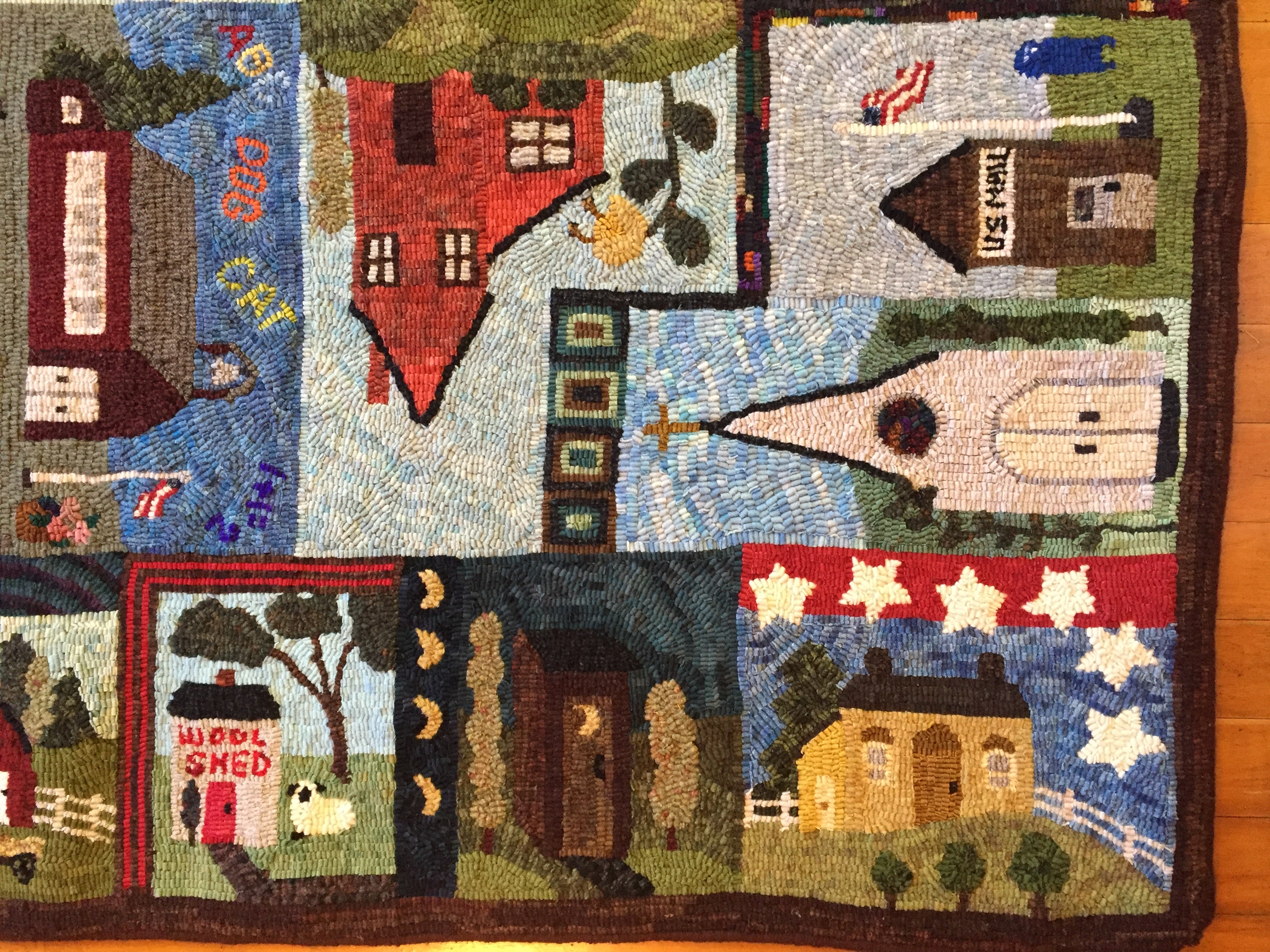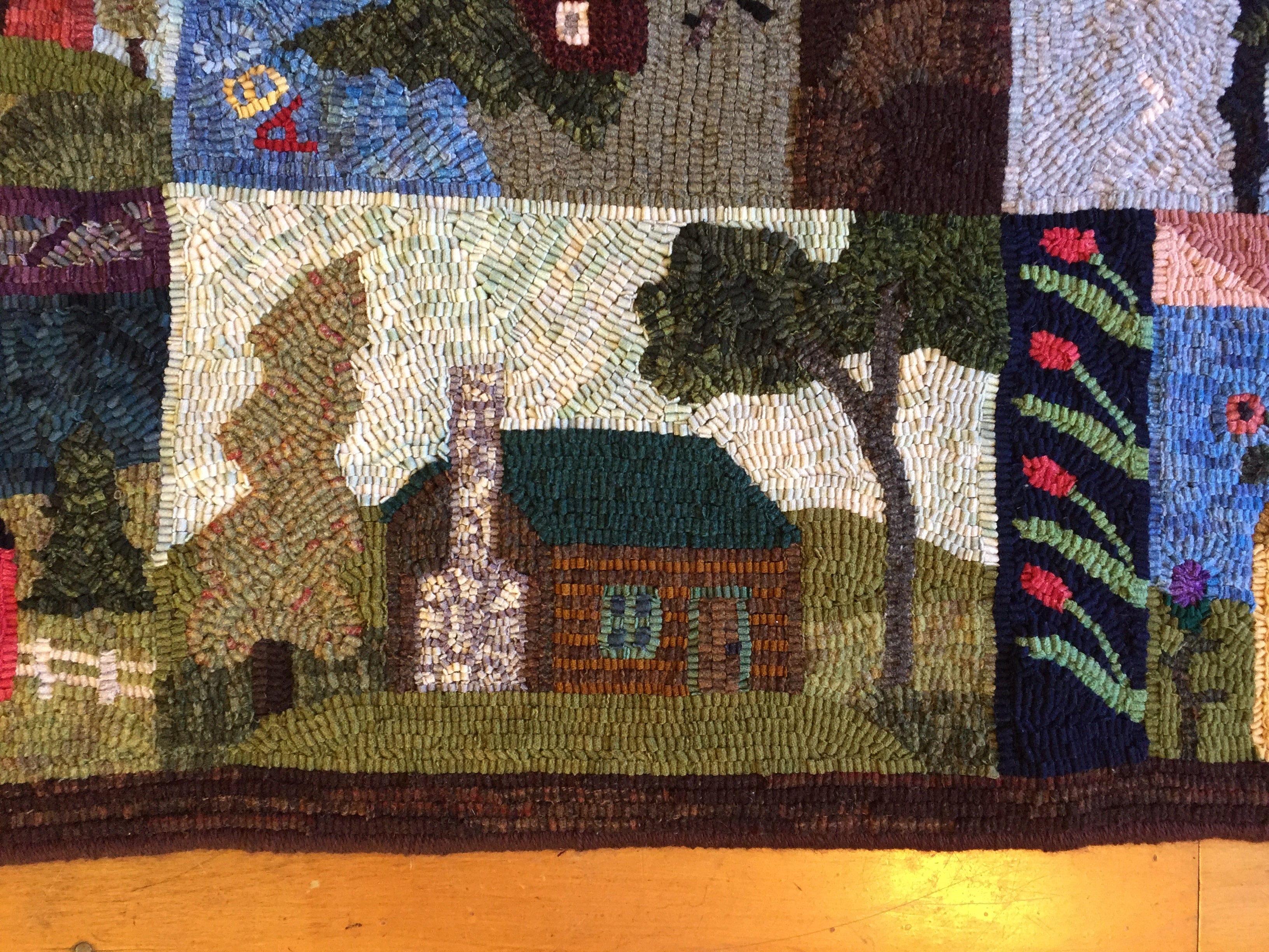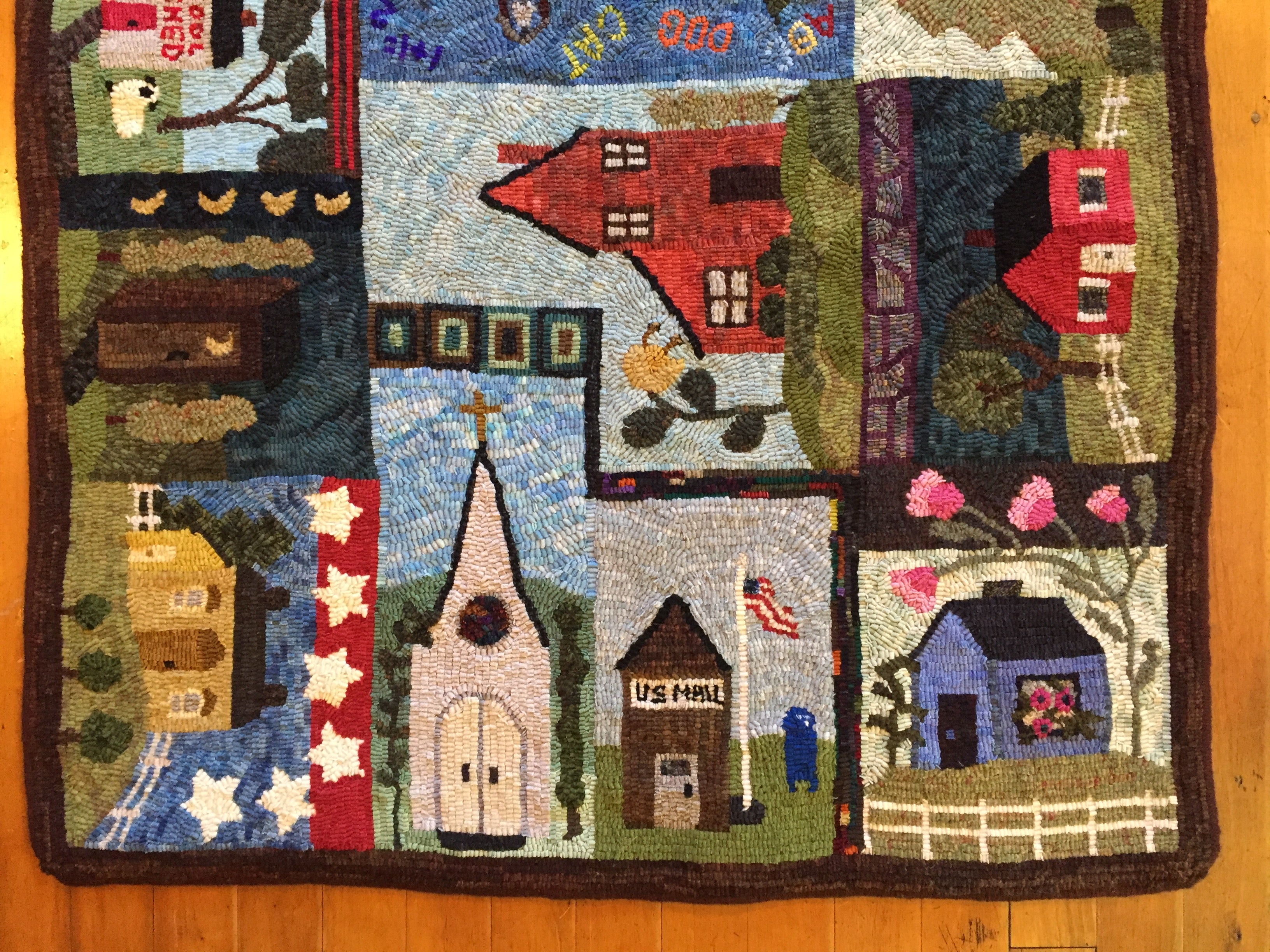 This is a FUN rug! Do not let the big size intimidate you. This is just a series of little mats. Each block is a different size and features a different house or building. All kinds of trees, fences and plants make each one fun to hook and use up those small scraps with little bits here and there. Like all of Chris's big patterns they are fun vied from any direction as she hates "one way" rugs! 14 buildings with assorted blocks and boarders make it work up fast, block by block! Thank you Cindy T for the pictures of your incredible rug.
