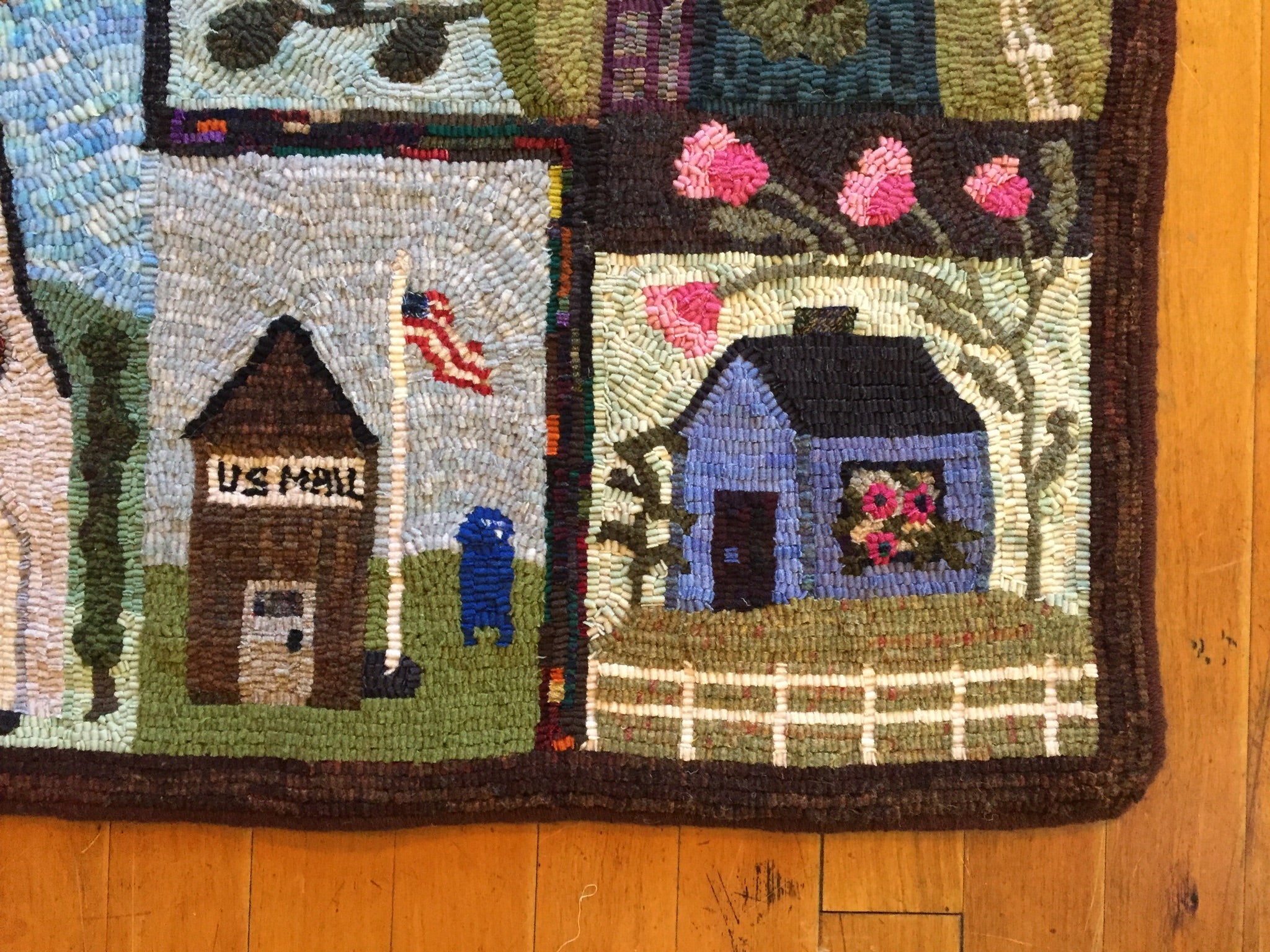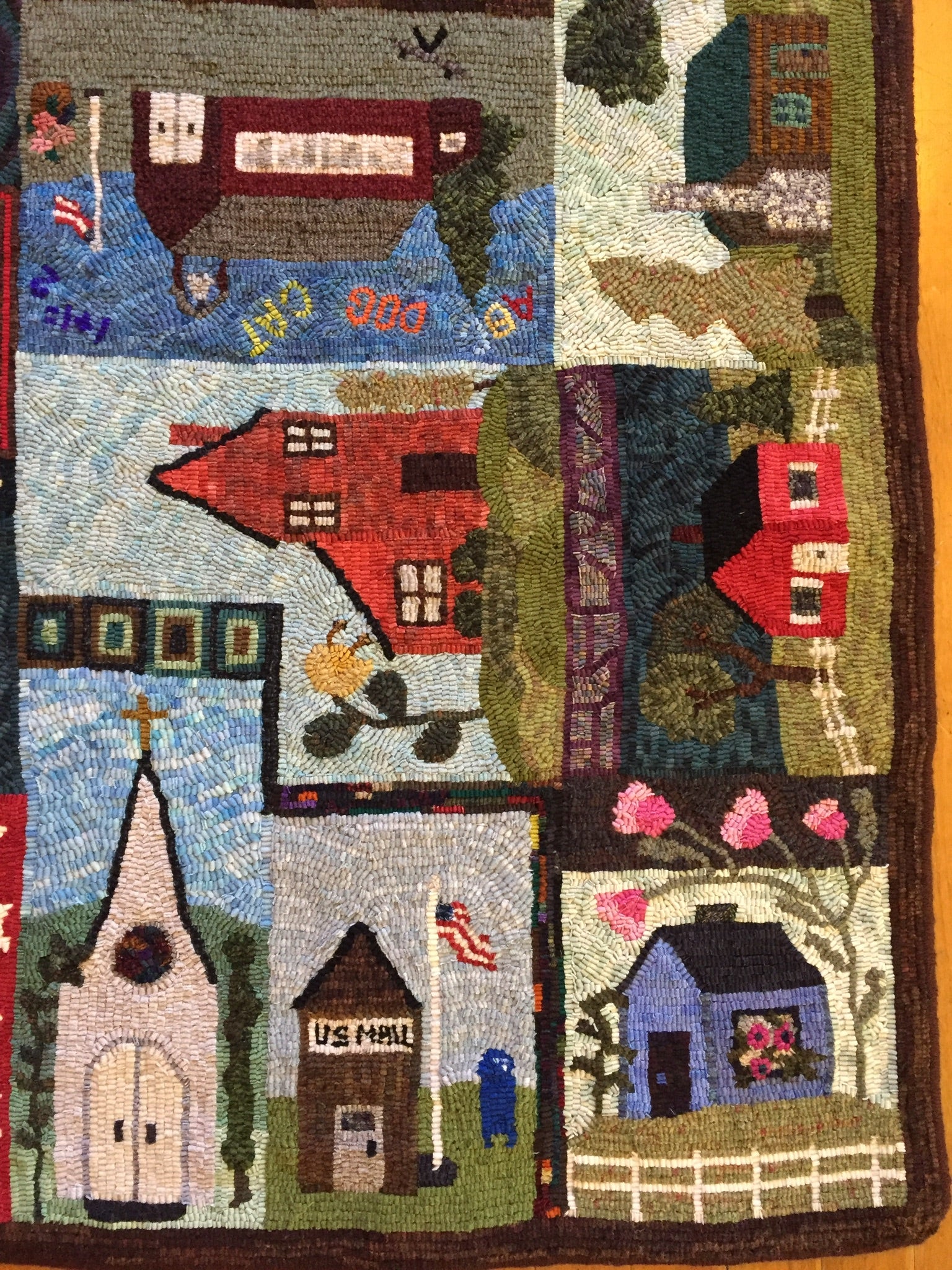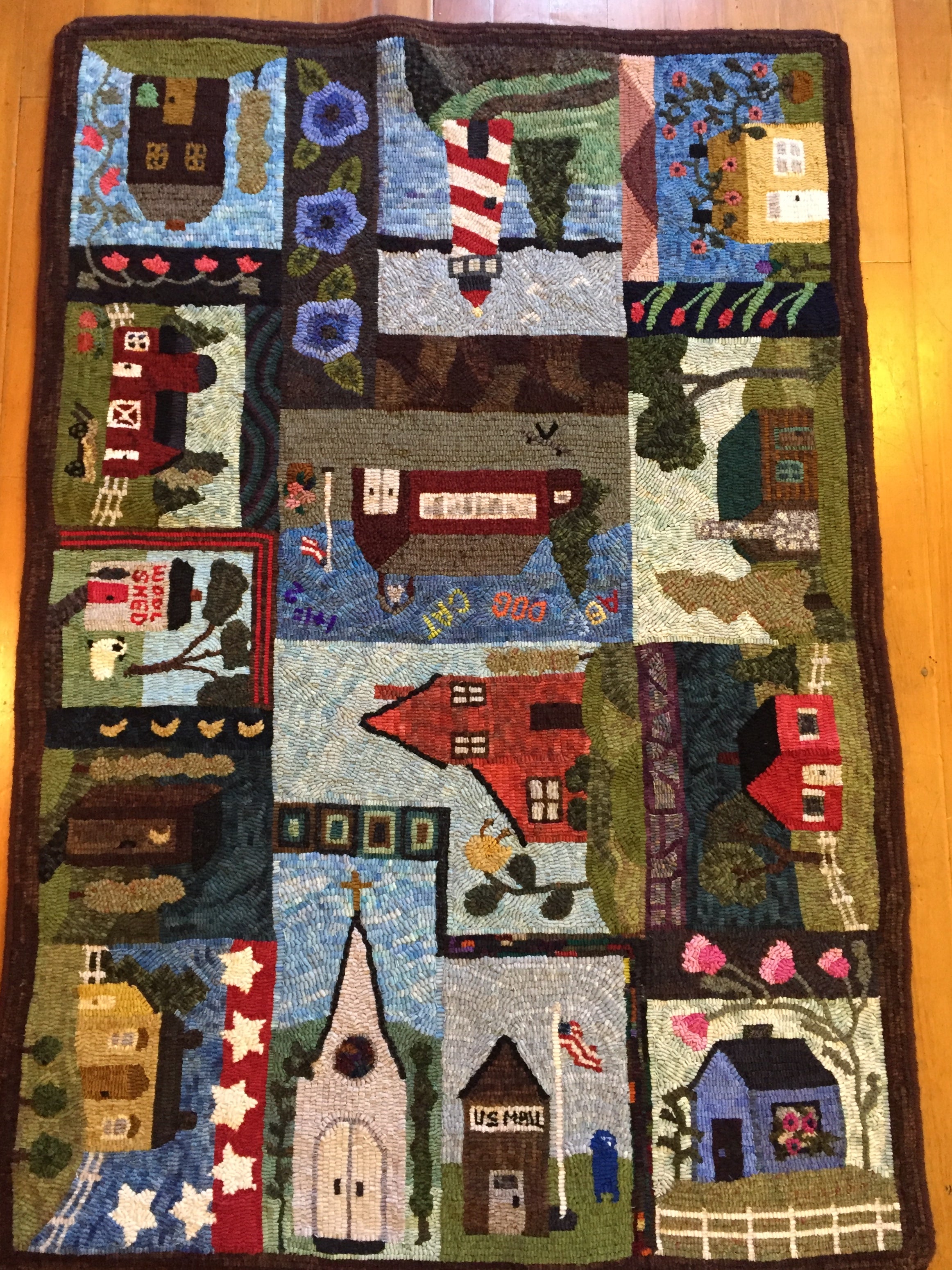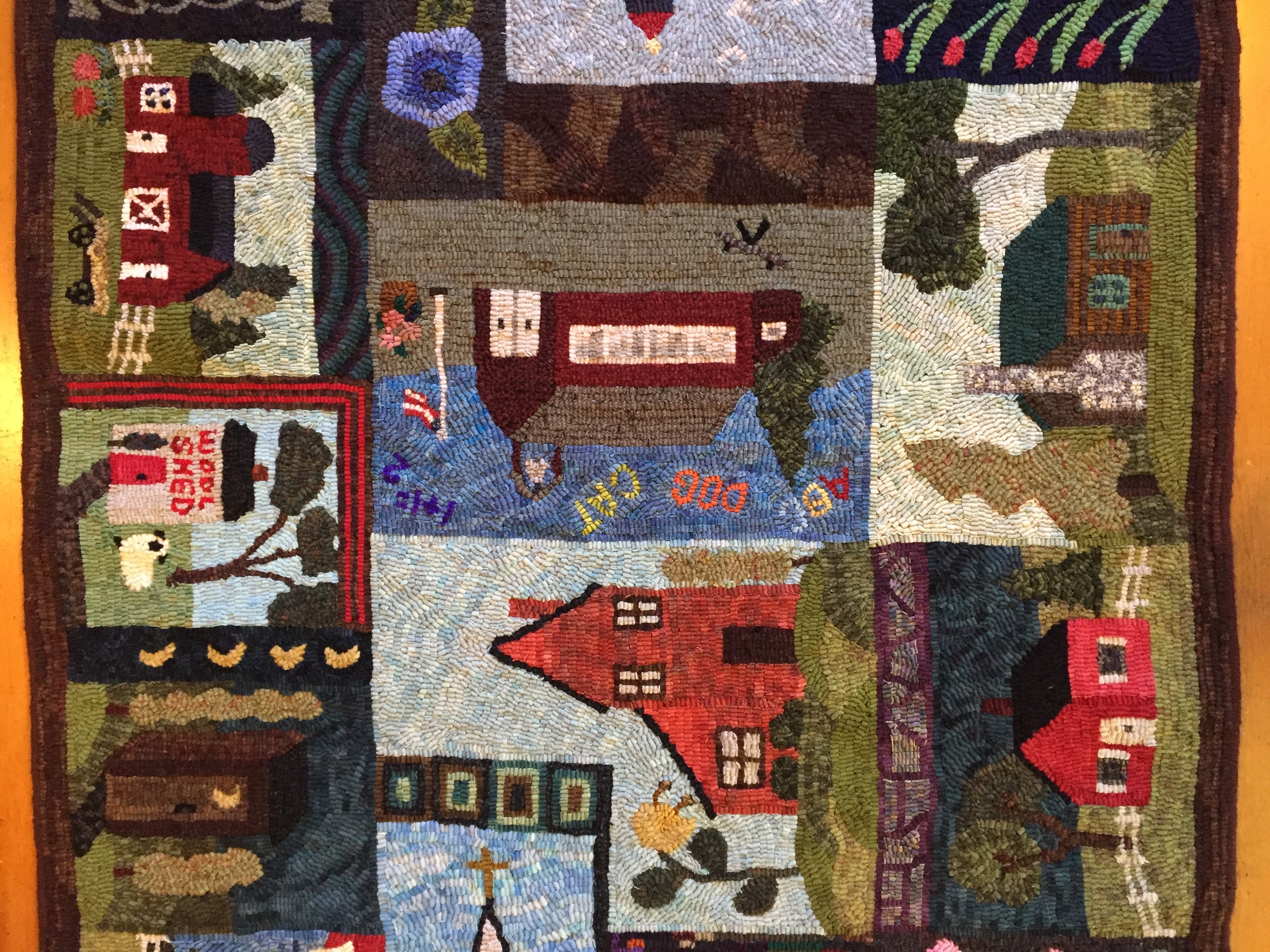 This is a FUN rug! Do not let the big size intimidate you. This is just a series of little mats. Each block is a different size and features a different house or building. All kinds of trees, fences and plants make each one fun to hook and use up those small scraps with little bits here and there. Like all of Chris's big patterns they are fun vied from any direction as she hates "one way" rugs! 14 buildings with assorted blocks and boarders make it work up fast, block by block! Thank you Cindy T for the pictures of your incredible rug.