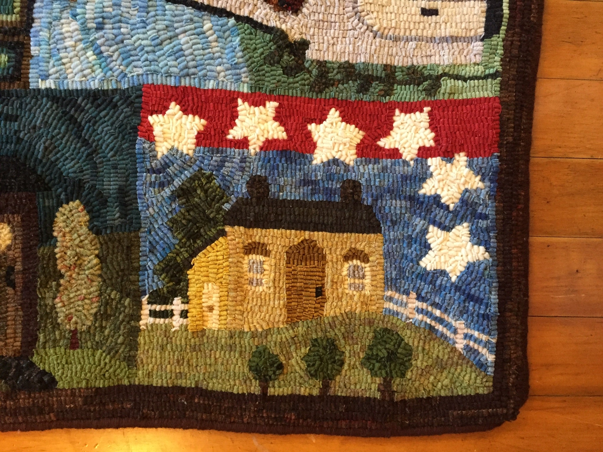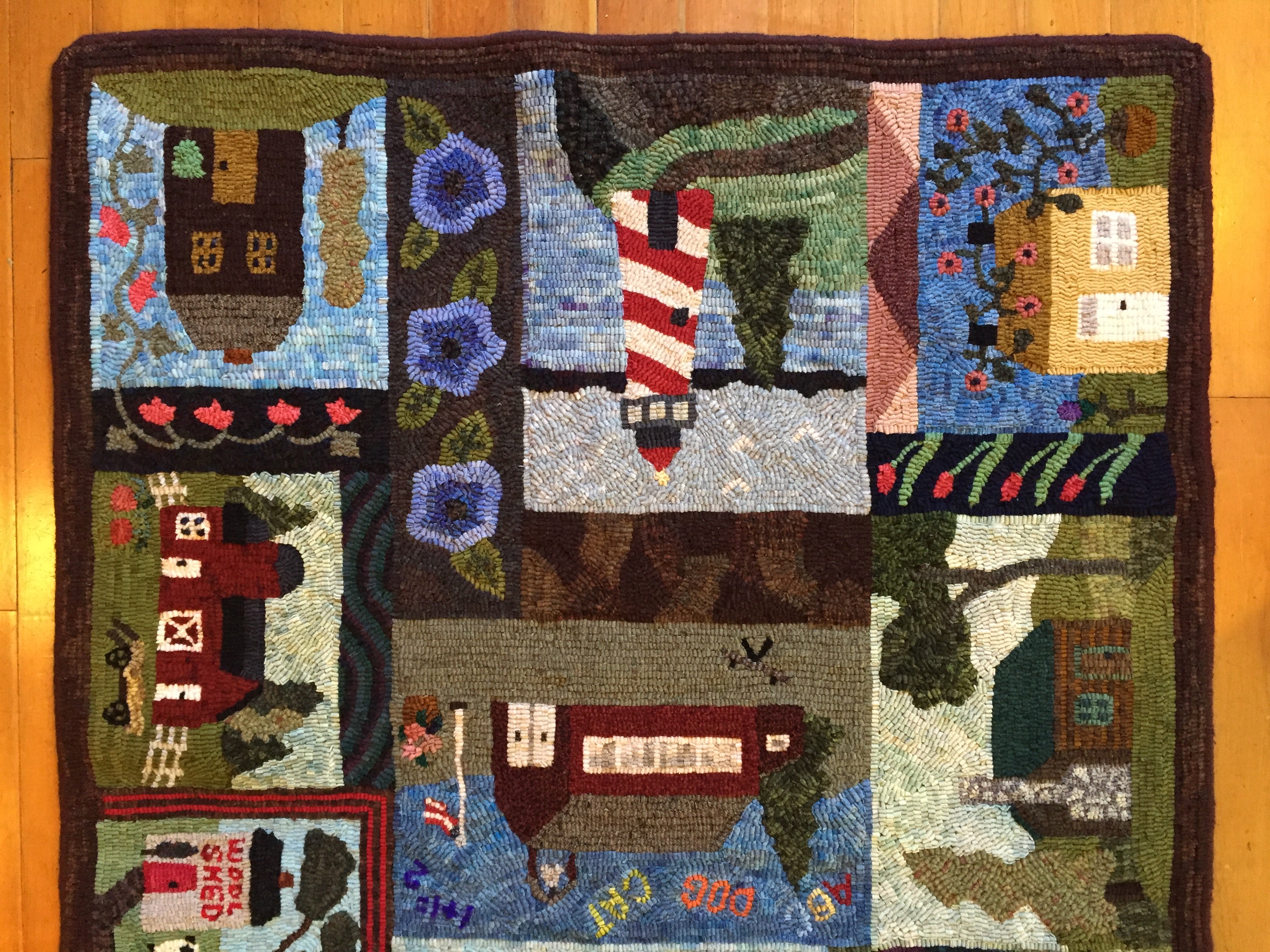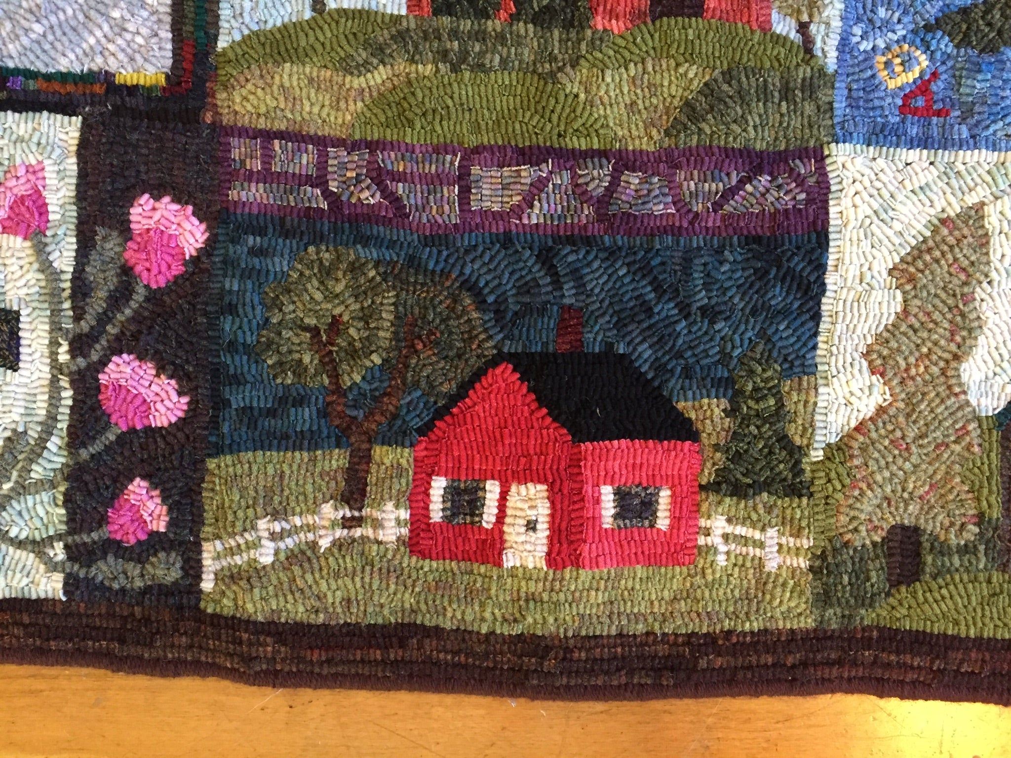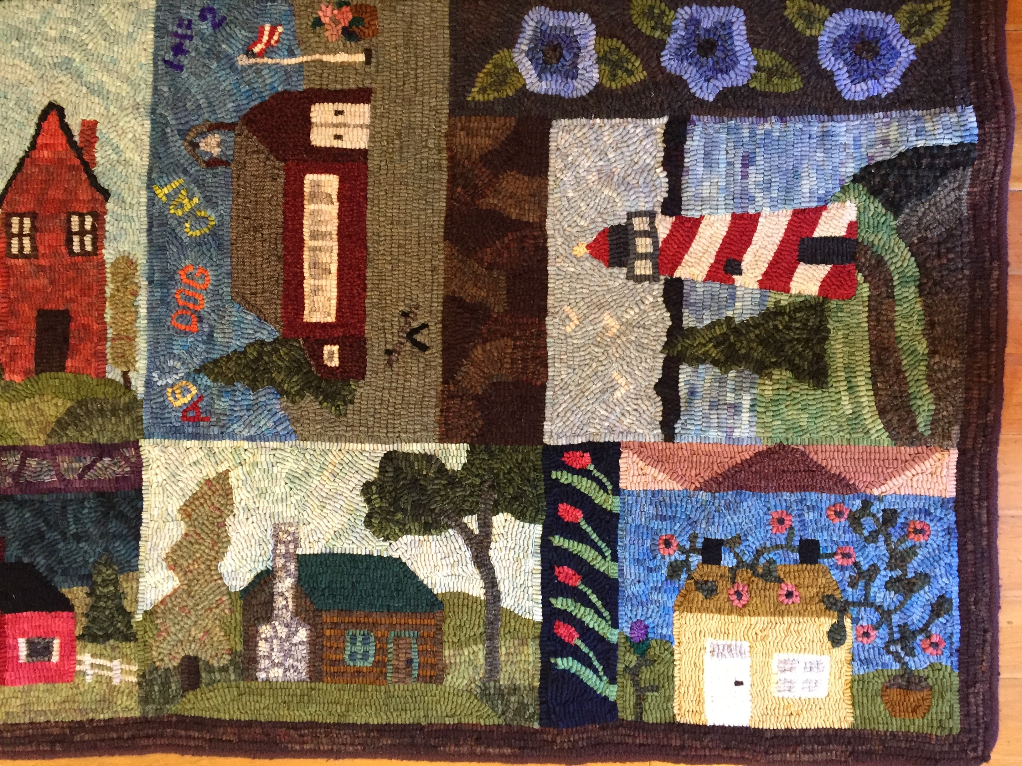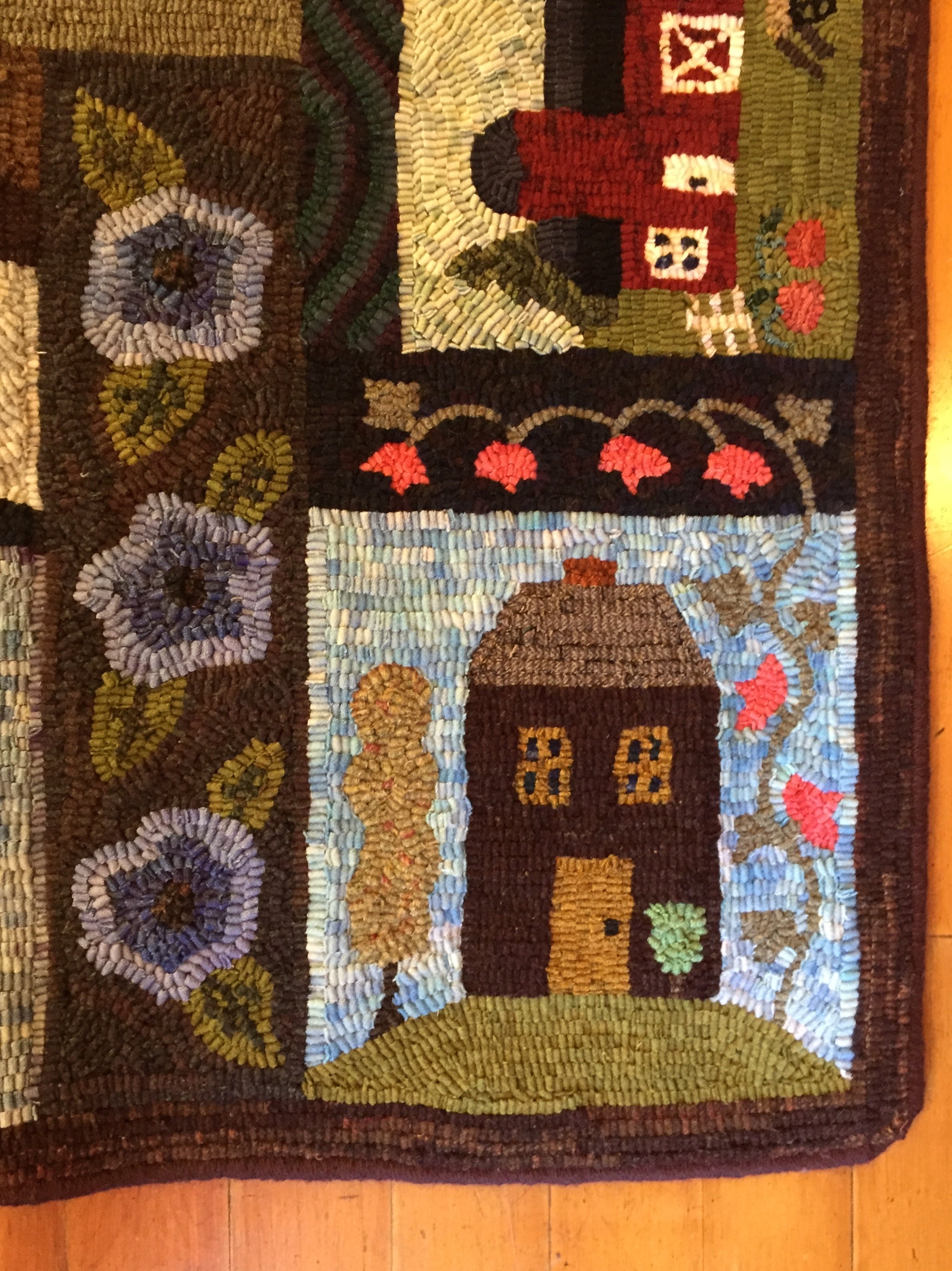 This is a FUN rug! Do not let the big size intimidate you. This is just a series of little mats. Each block is a different size and features a different house or building. All kinds of trees, fences and plants make each one fun to hook and use up those small scraps with little bits here and there. Like all of Chris's big patterns they are fun vied from any direction as she hates "one way" rugs! 14 buildings with assorted blocks and boarders make it work up fast, block by block! Thank you Cindy T for the pictures of your incredible rug.