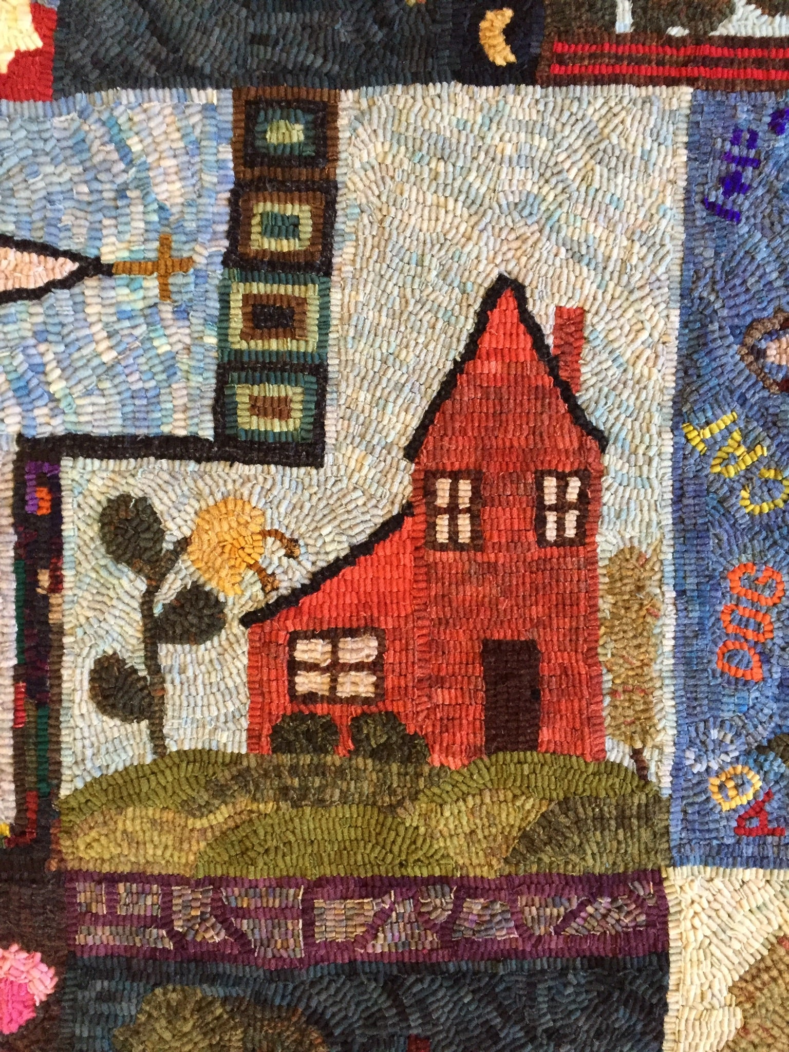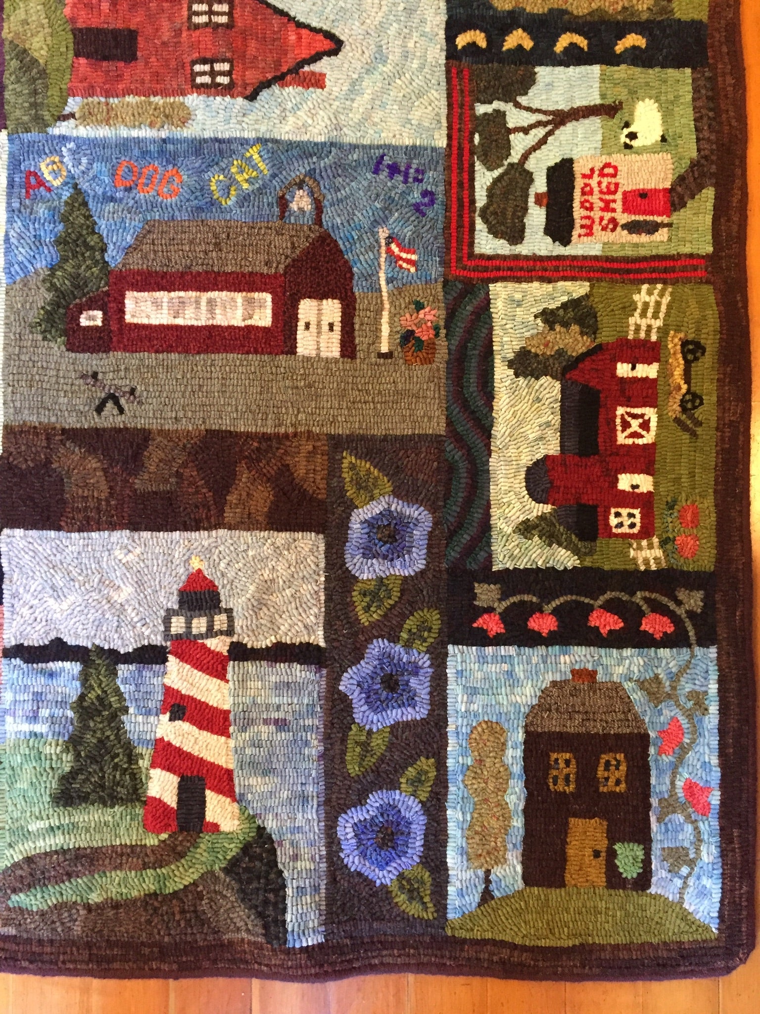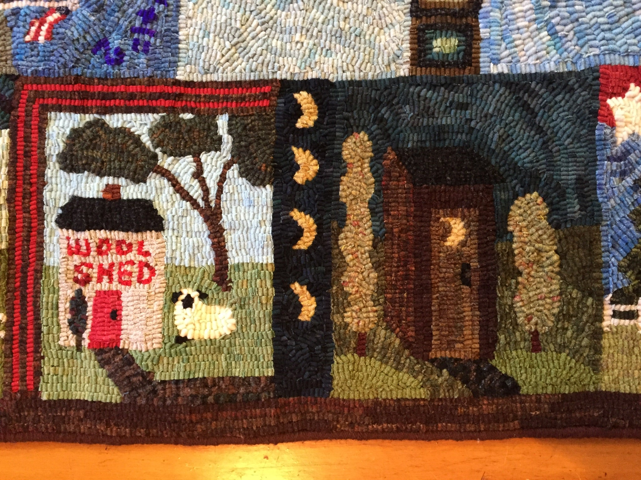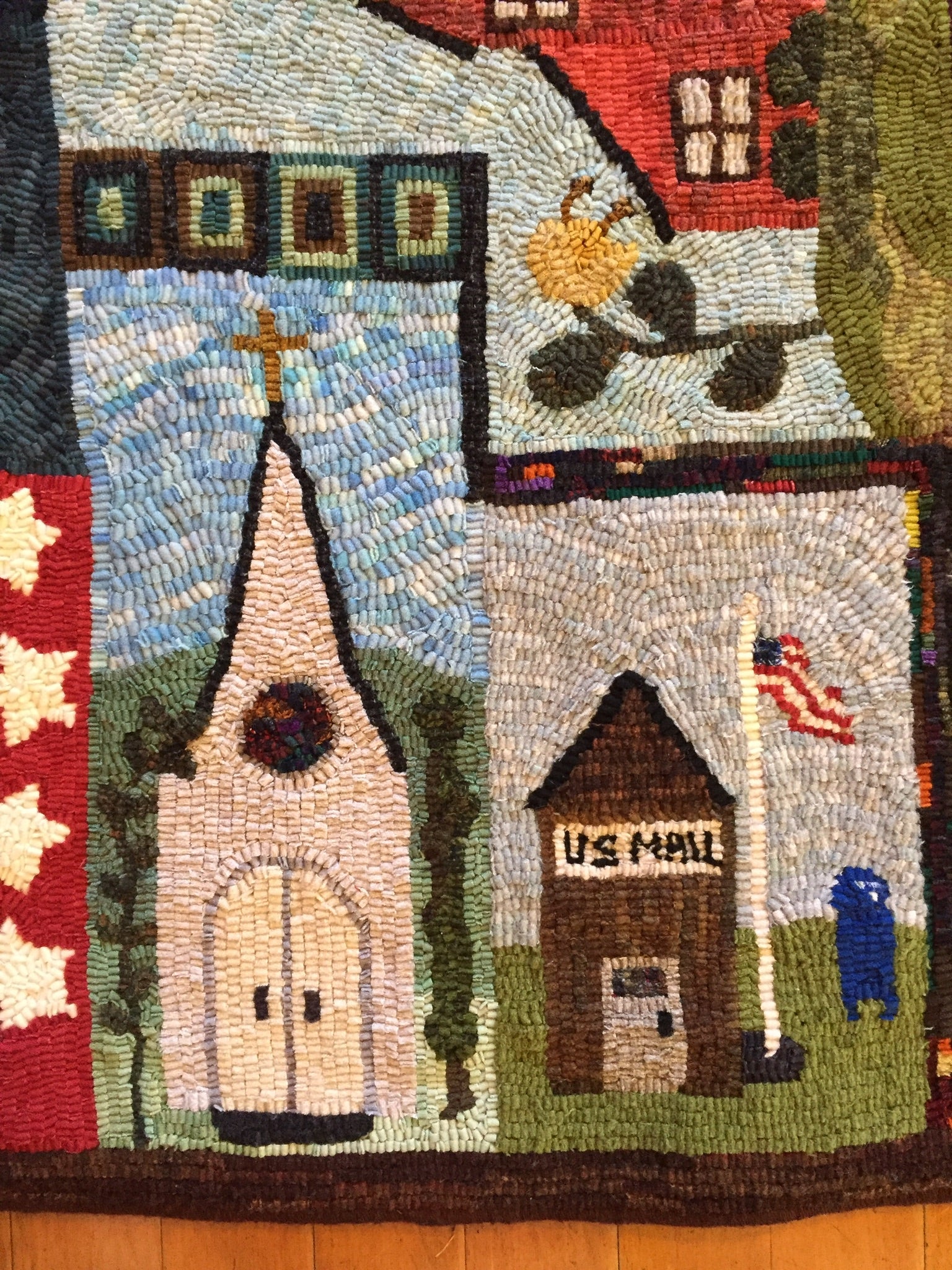 This is a FUN rug! Do not let the big size intimidate you. This is just a series of little mats. Each block is a different size and features a different house or building. All kinds of trees, fences and plants make each one fun to hook and use up those small scraps with little bits here and there. Like all of Chris's big patterns they are fun vied from any direction as she hates "one way" rugs! 14 buildings with assorted blocks and boarders make it work up fast, block by block! Thank you Cindy T for the pictures of your incredible rug.