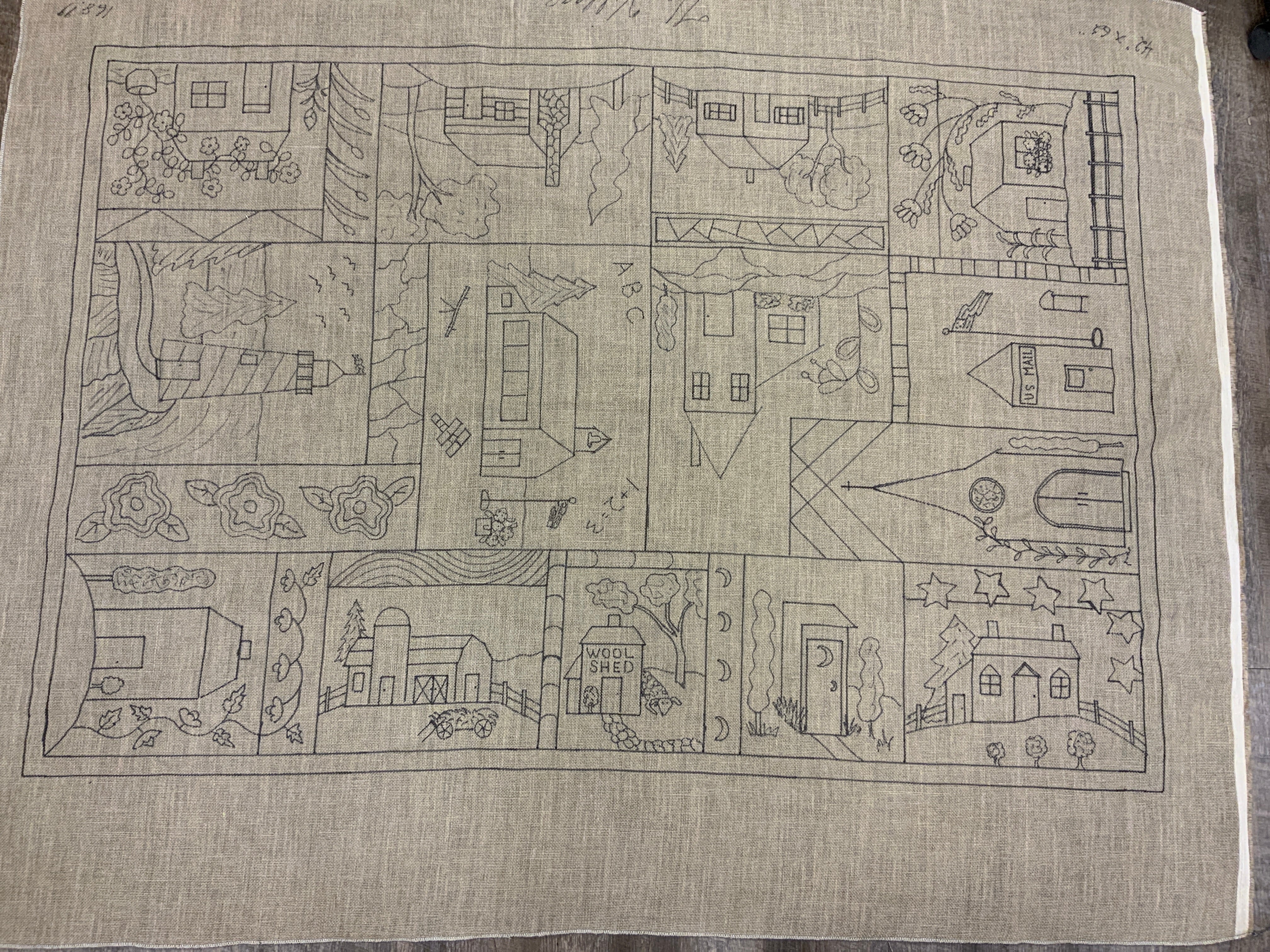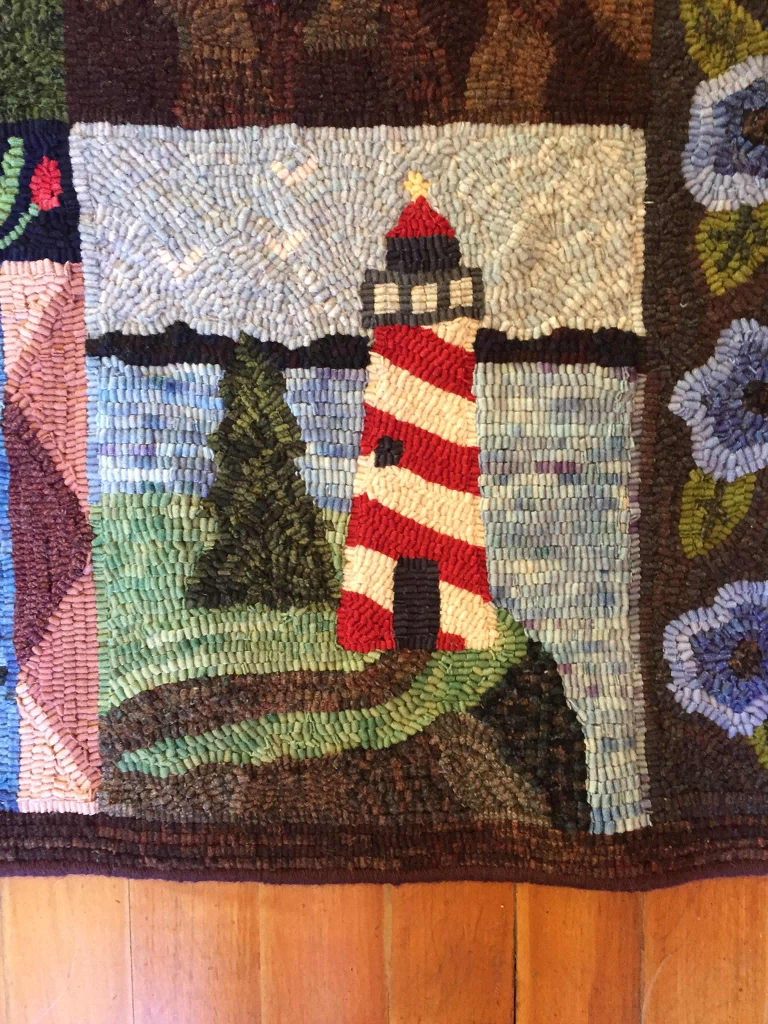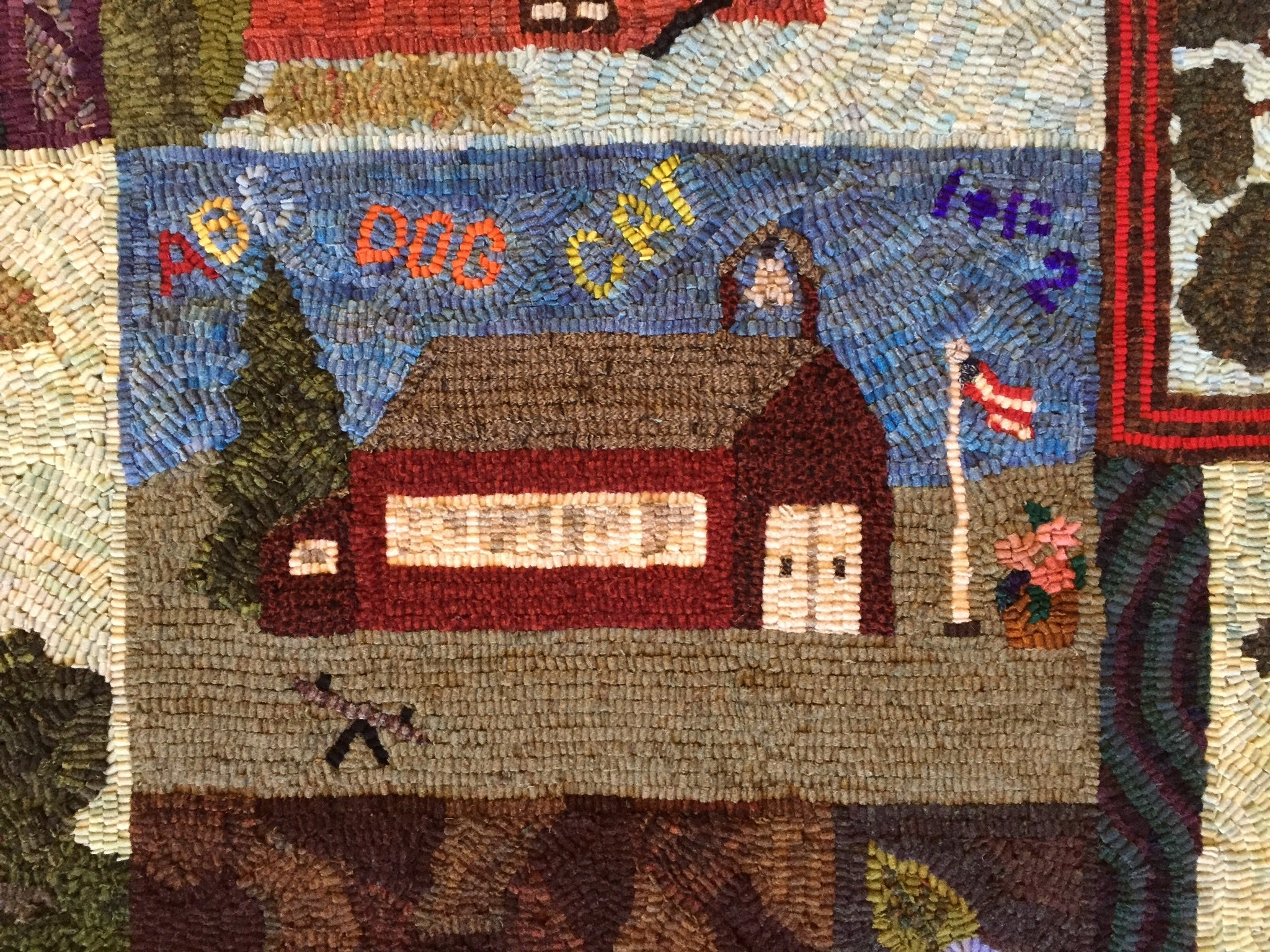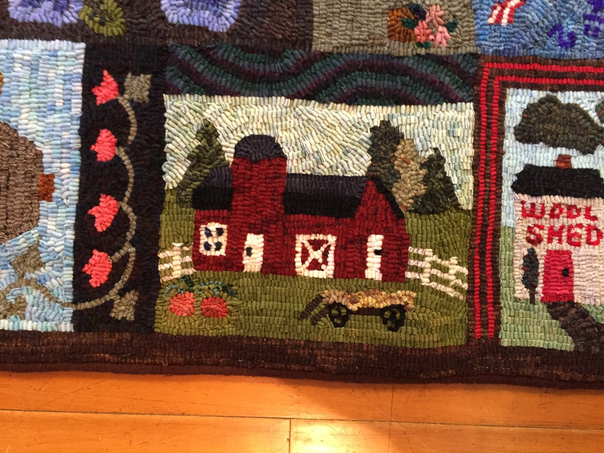 This is a FUN rug! Do not let the big size intimidate you. This is just a series of little mats. Each block is a different size and features a different house or building. All kinds of trees, fences and plants make each one fun to hook and use up those small scraps with little bits here and there. Like all of Chris's big patterns they are fun vied from any direction as she hates "one way" rugs! 14 buildings with assorted blocks and boarders make it work up fast, block by block! Thank you Cindy T for the pictures of your incredible rug.
