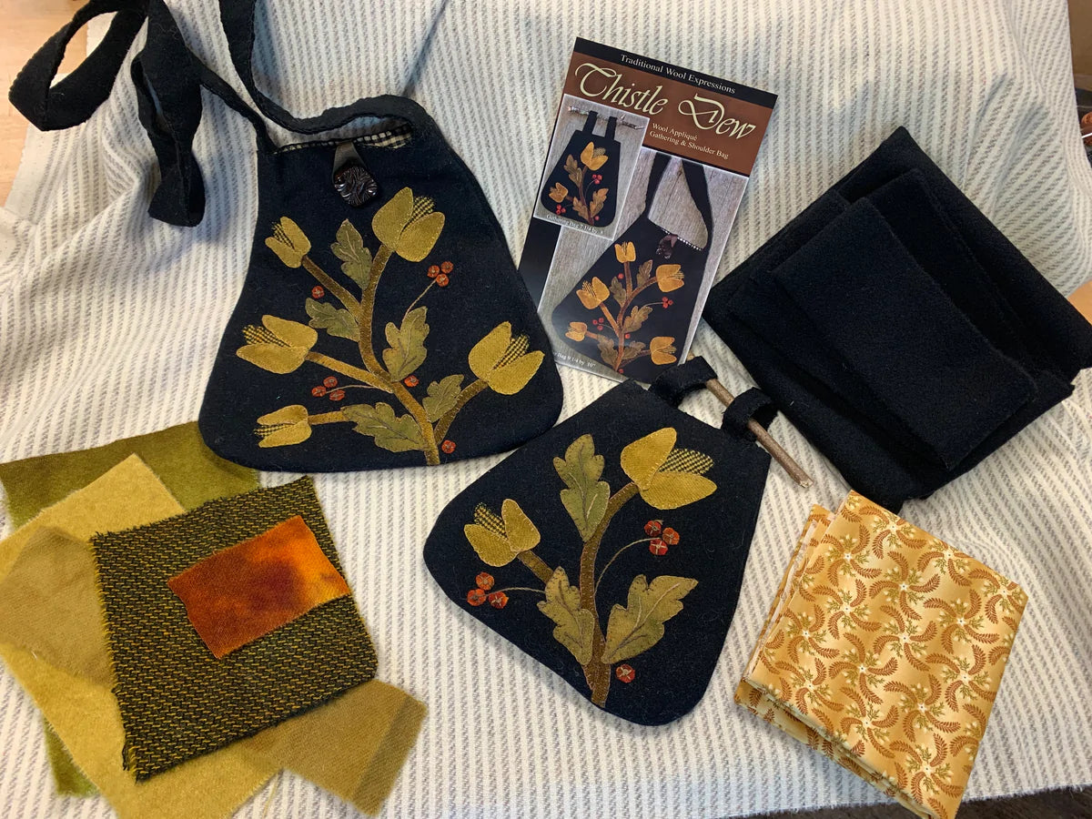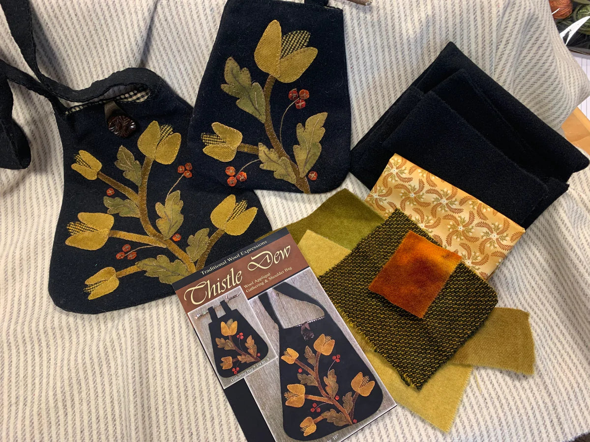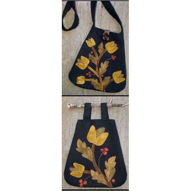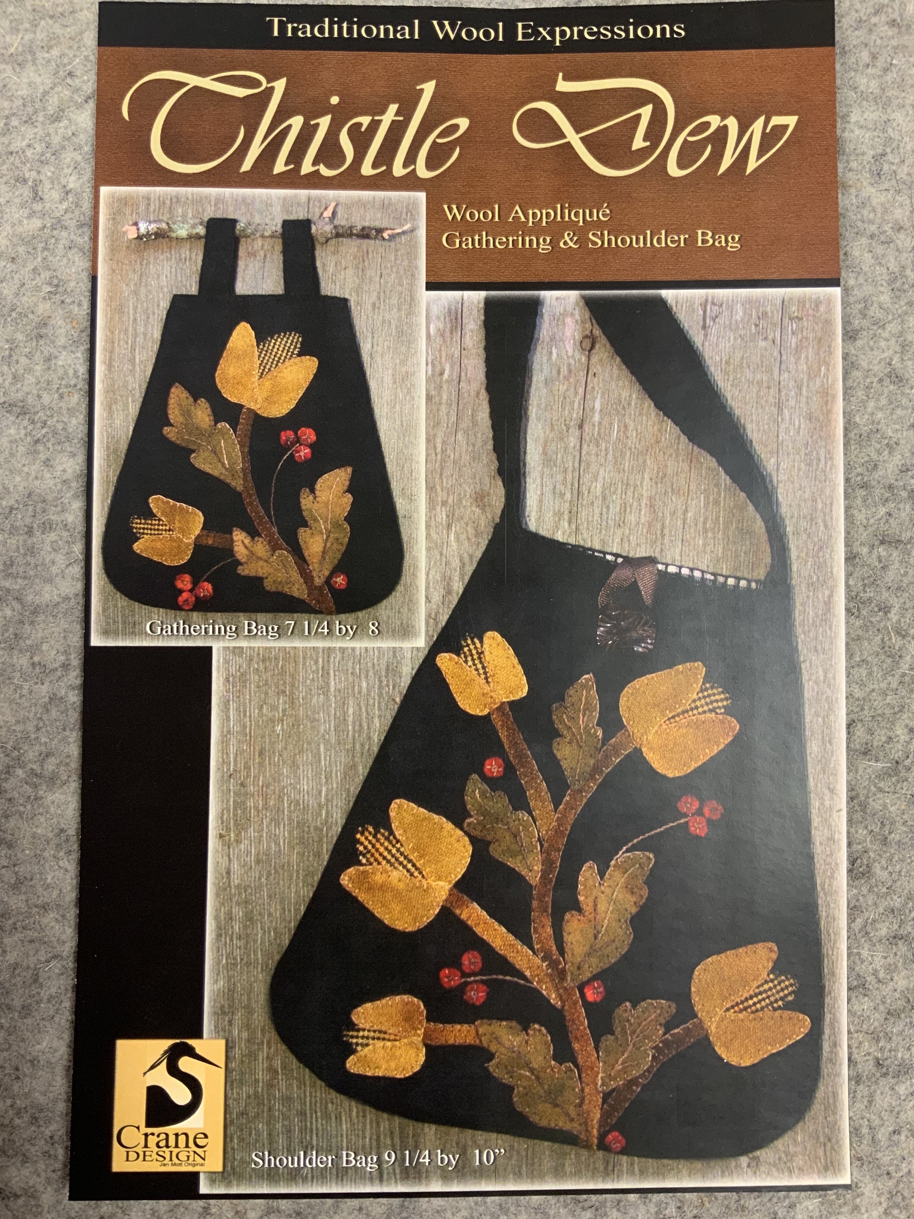 Wonderful pattern by Crane Designs. The pattern is for a Shoulder bag 9.5x10 and the smaller pouch. But the kit includes the wool, cotton for lining and patterns for both bags.