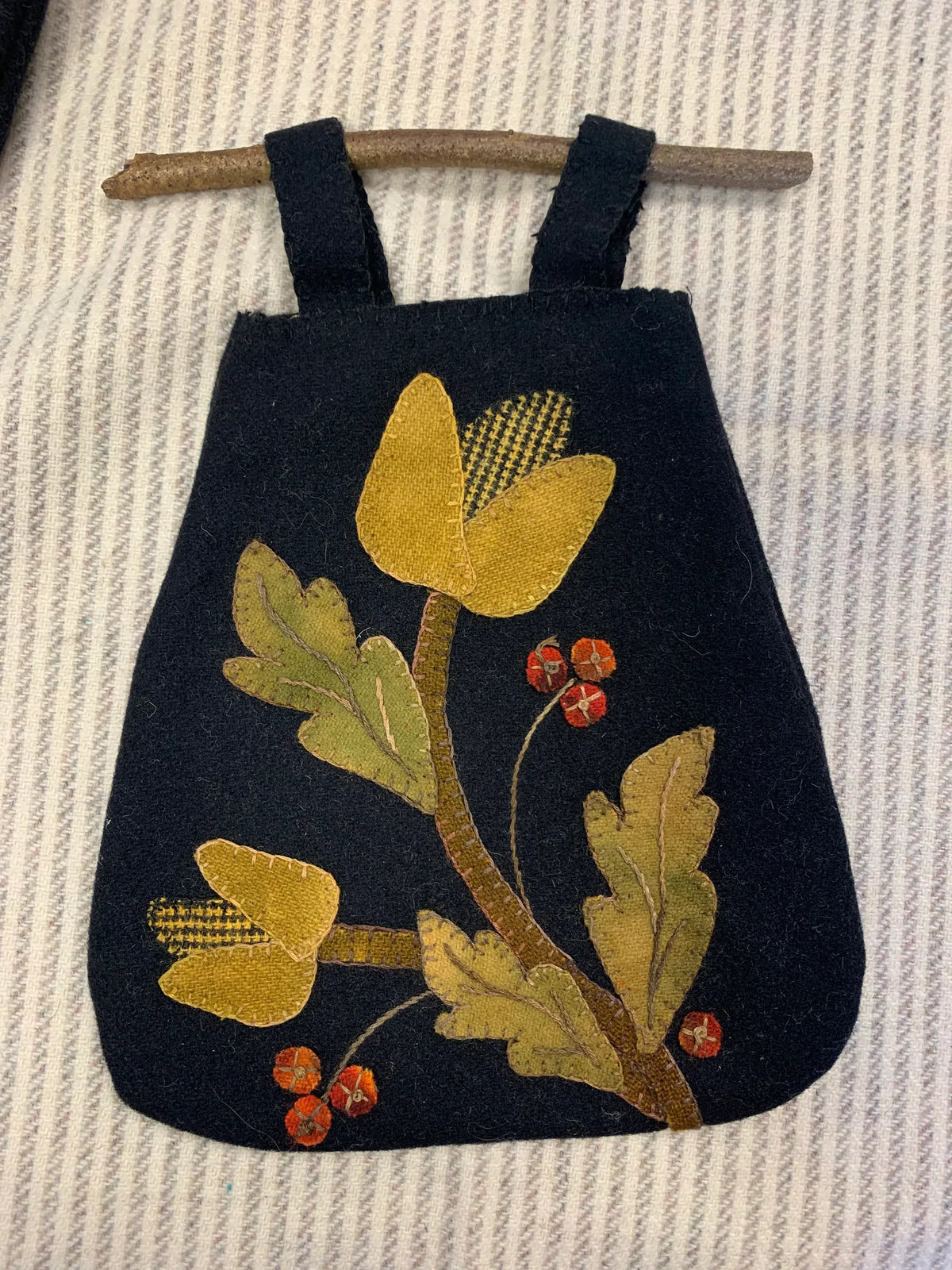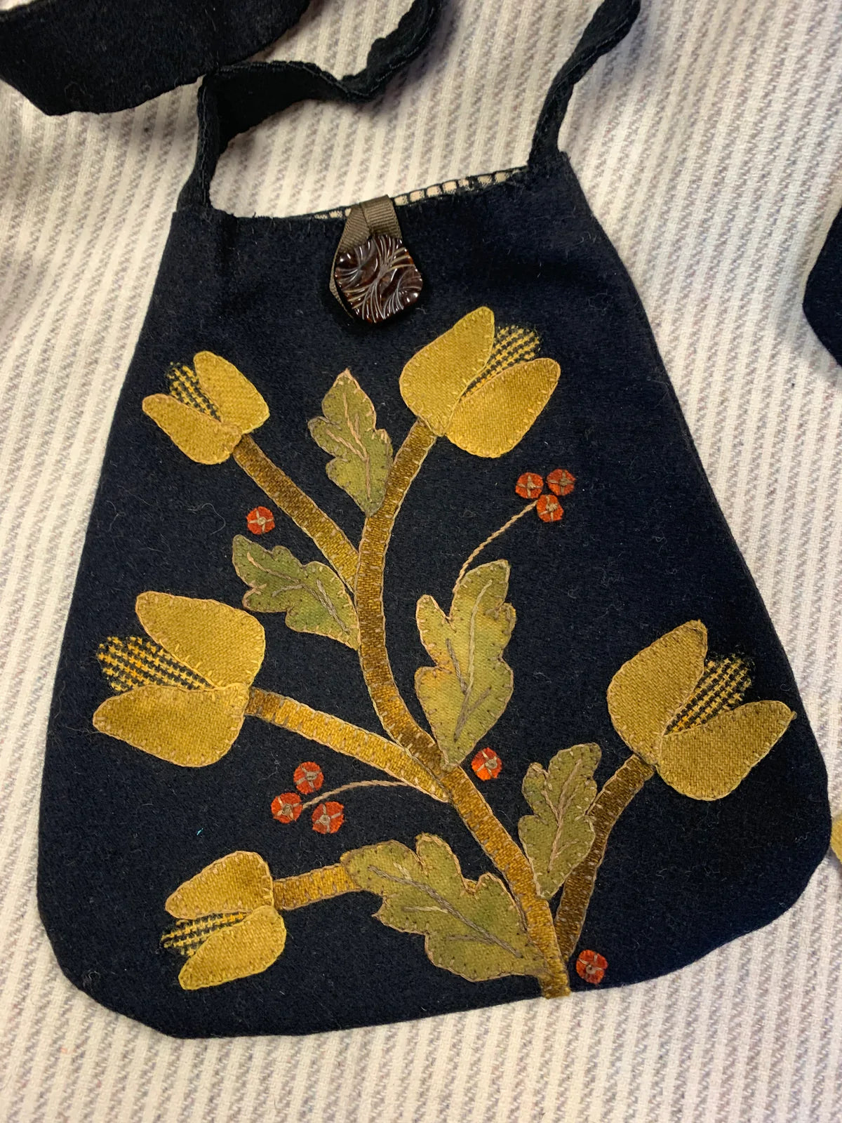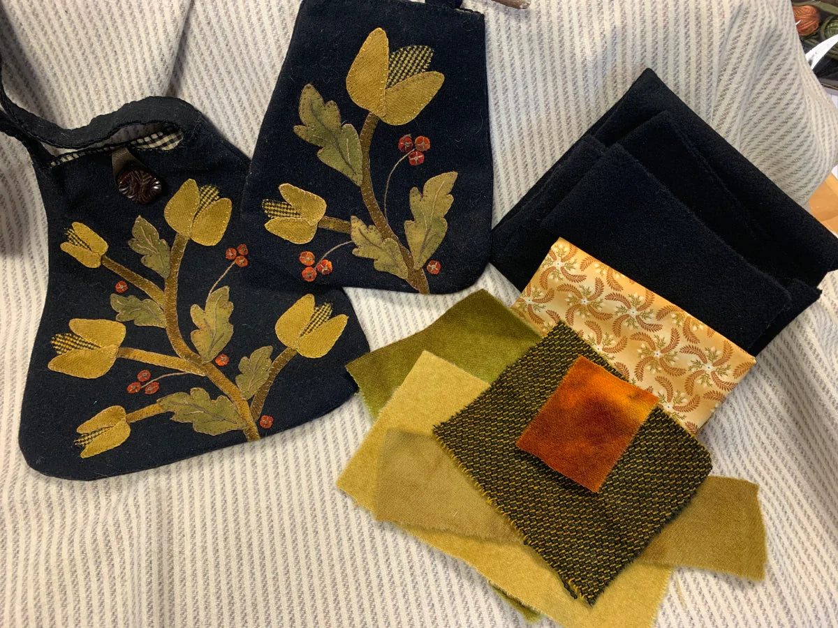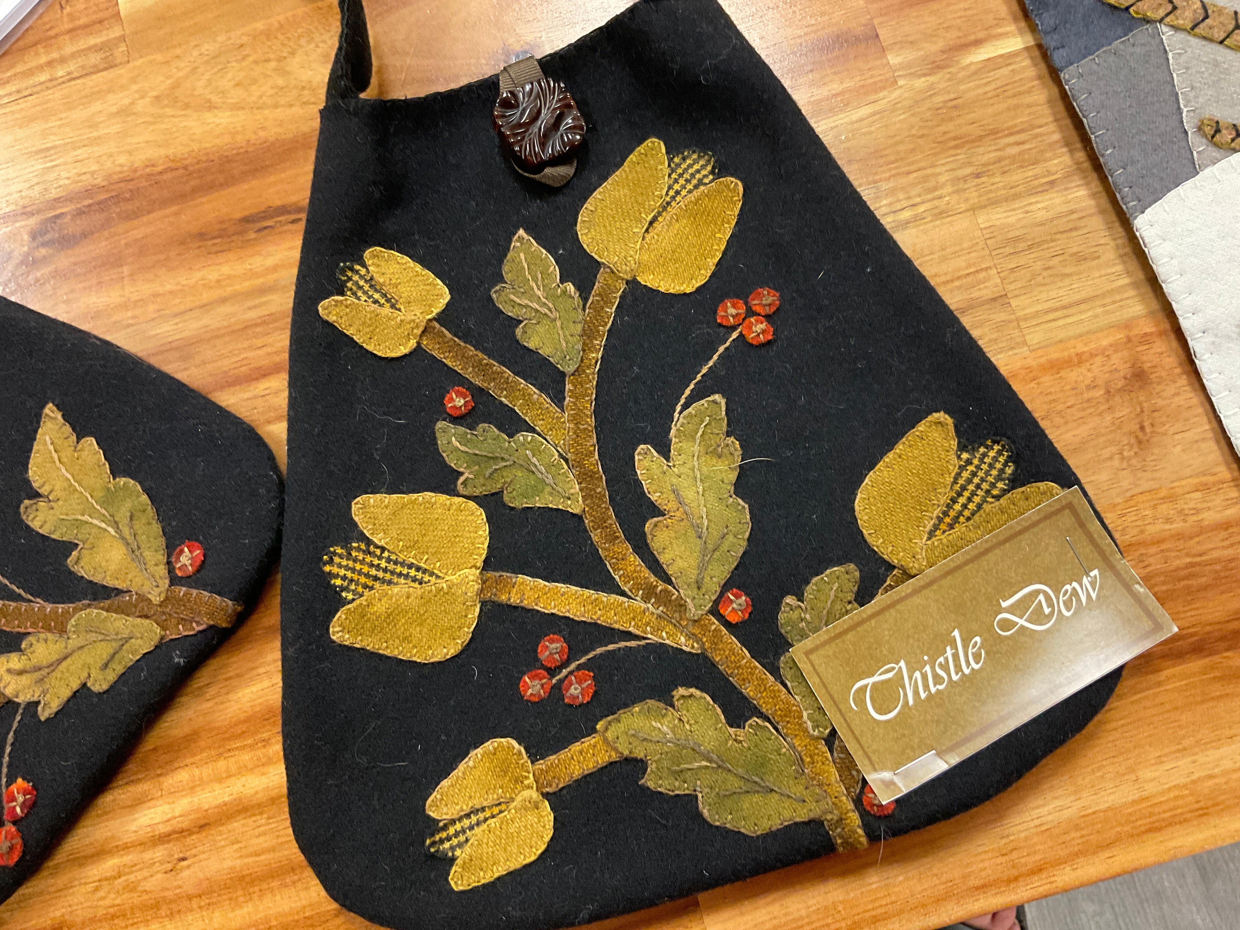 Wonderful pattern by Crane Designs. The pattern is for a Shoulder bag 9.5x10 and the smaller pouch. But the kit includes the wool, cotton for lining and patterns for both bags.