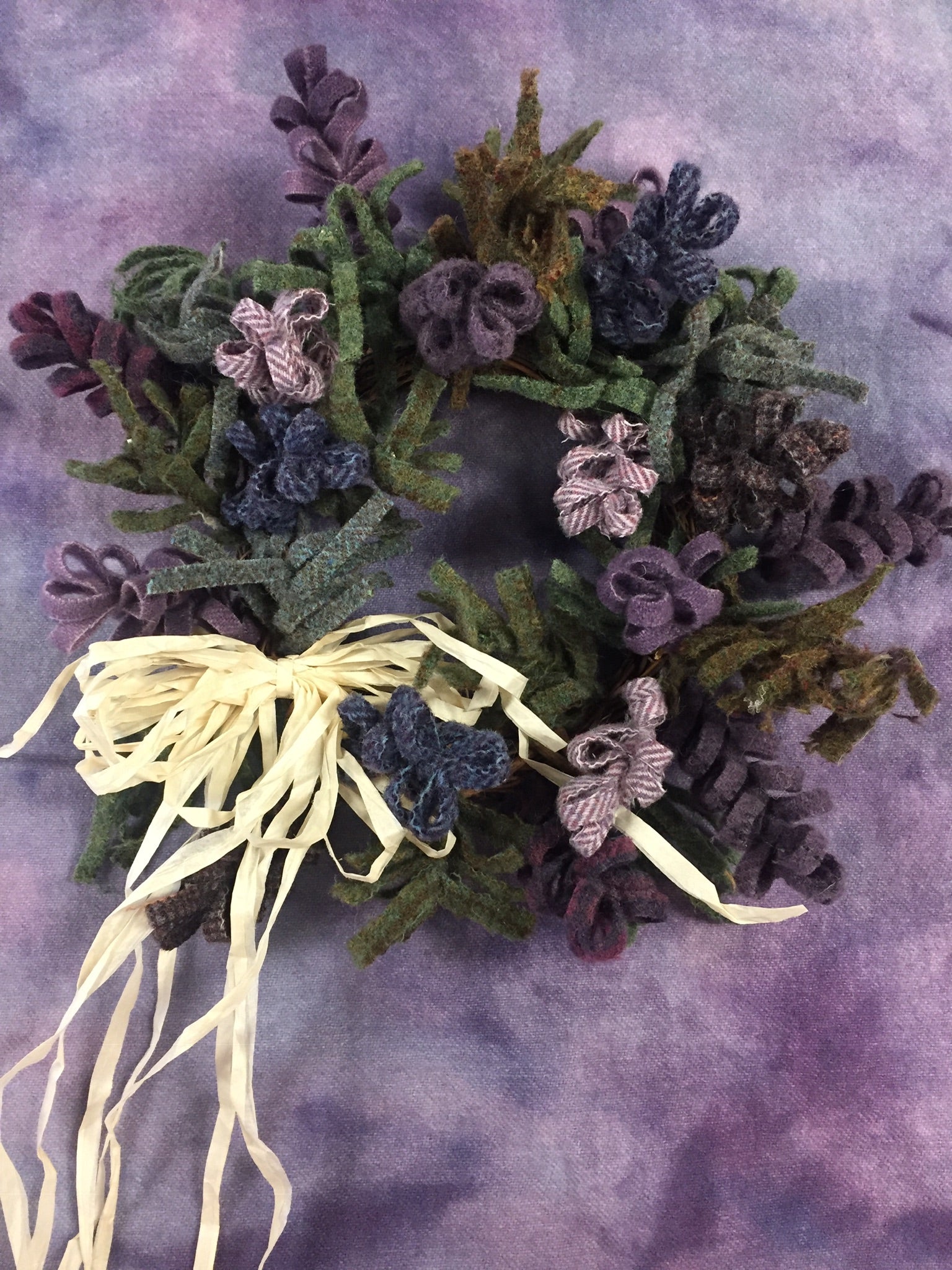 If you have made a twisted tree or our holiday wreath then you know how addictive twisting wool is! This fun project is a mix of greens that you twist just like the trees and make short stems to mimic the sparse leaves on early spring plants. We send you a mix of greens for a primitive look. The flowers are specially cut by us, so when you twist them they bloom! We give you a mix of six different Colored blossom wools for your wreath to look like fresh gathered flowers. Then you tuck them in the grapevine wreath letting some of the rustic vine show through.