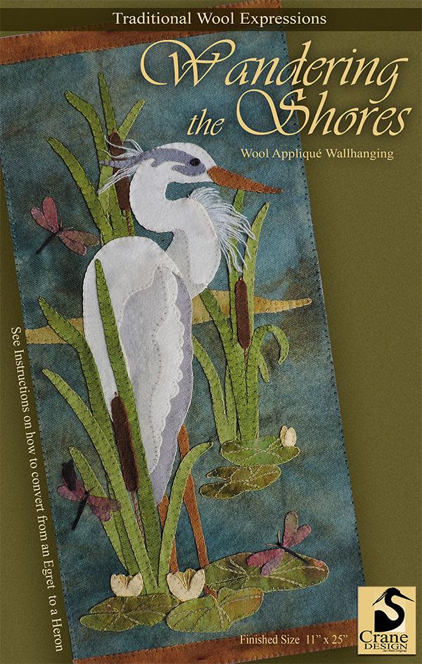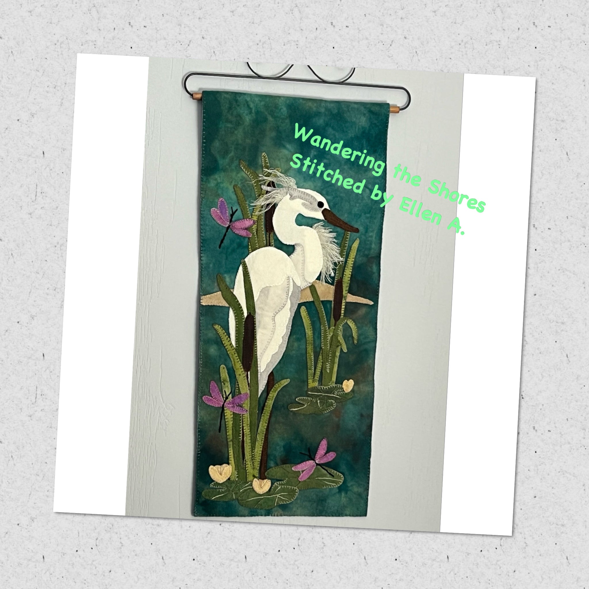 Wandering the Shores. This piece is a reflection of a warm summer day by the water with a regal Egret standing amongst the waterlilies and cattails. This piece may also be created replacing the Egret with an Heron. The pattern comes with color needs & placement for both the Heron and Egret.