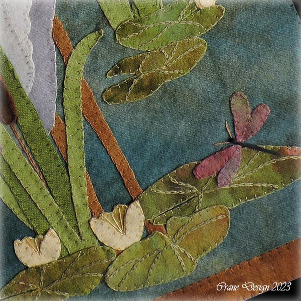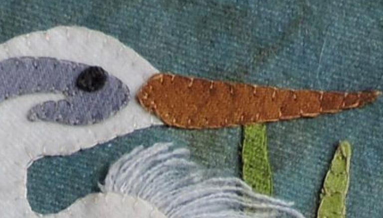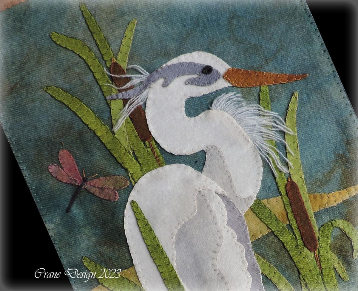 As you can tell from many of Jan’s designs she is a nature gal, and just loves birds. Nothing thrills her more that do drive past the local river and spot Egrets and Herons, fishing and just enjoying their day. This piece is two fold, it may be created featuring an Egret as shown, or convert to a Heron depending on your taste or locale. Just change the color of the bird and you’re all set! The pattern comes with the material needs for either bird and the pattern pieces are marked accordingly. The pattern comes with great instructions and illustration to guide the stitcher along, including some fun embroidery and new techniques to make the piece pop. We have provided close-up photos to shown the special details below. Just a great piece to display in a sun room or at camp.